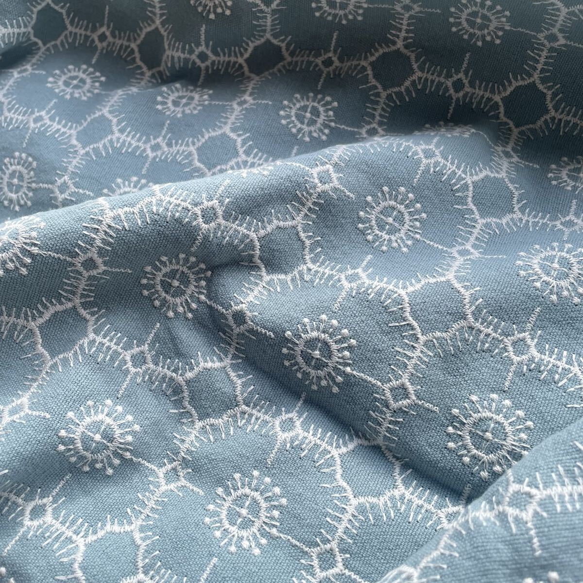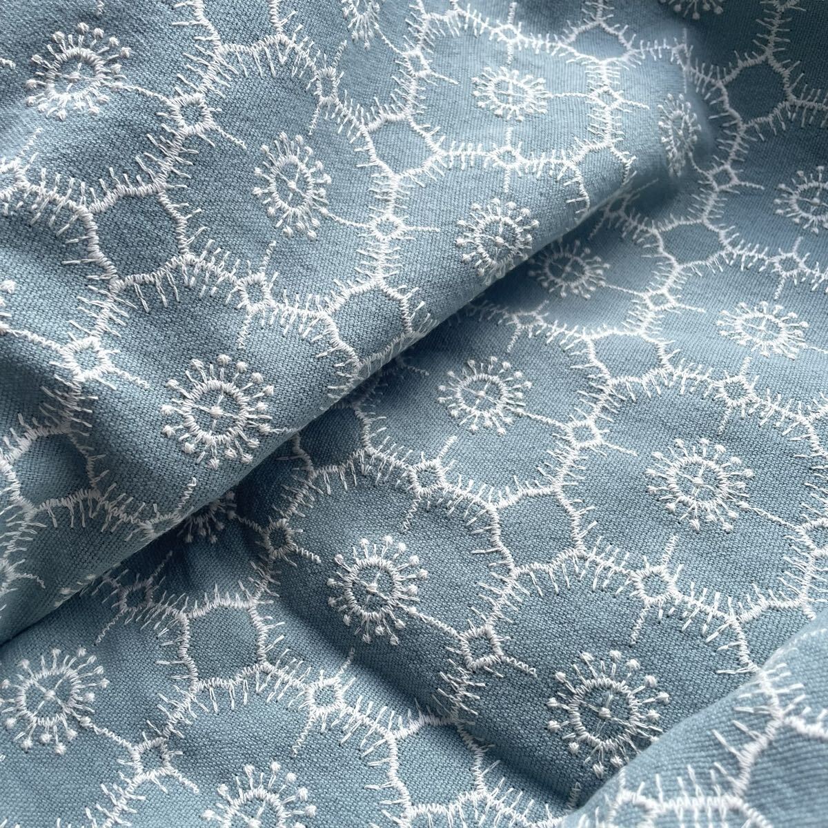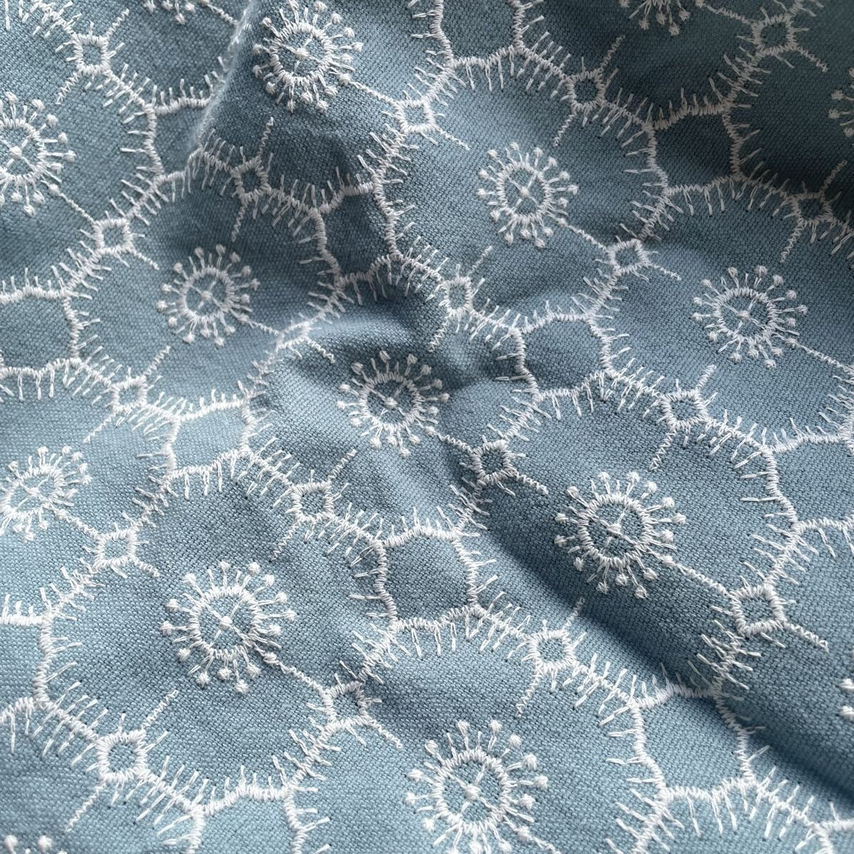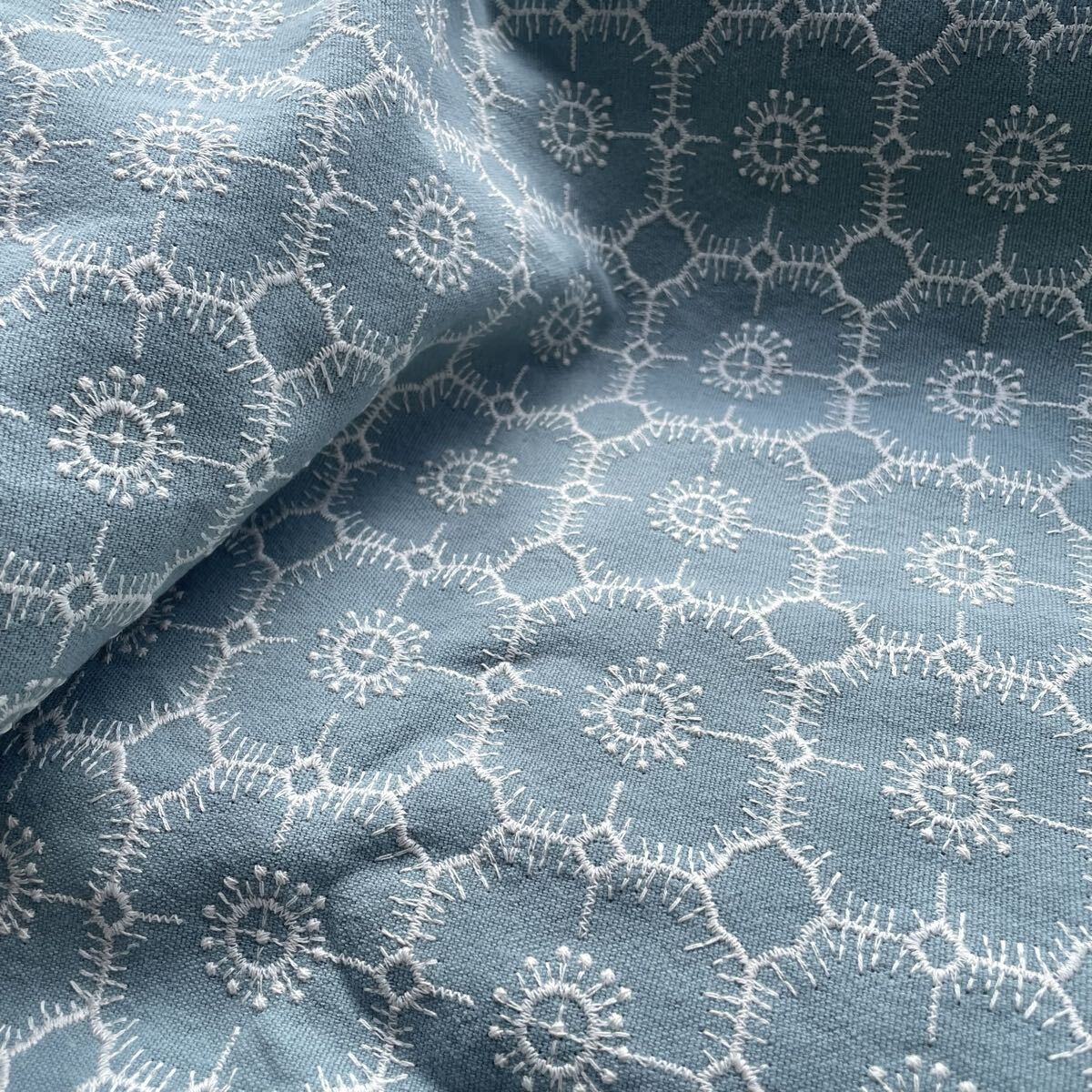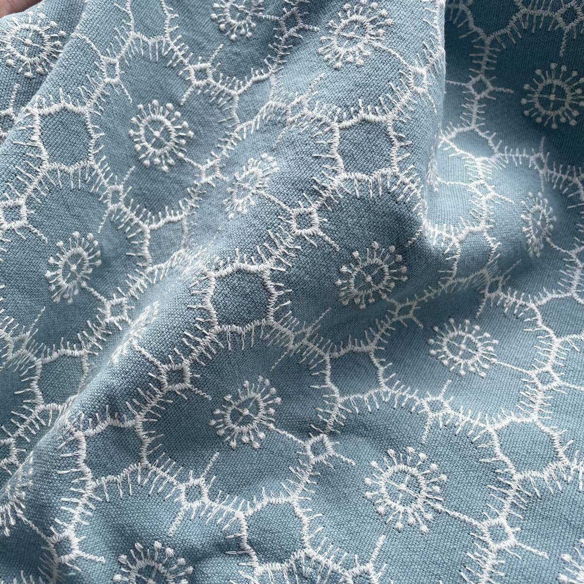 コットンリネンミントブルー地ホワイト刺繍生地です。