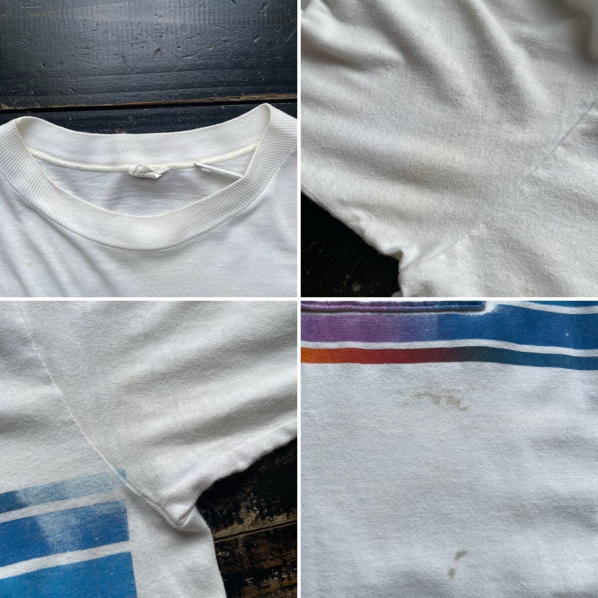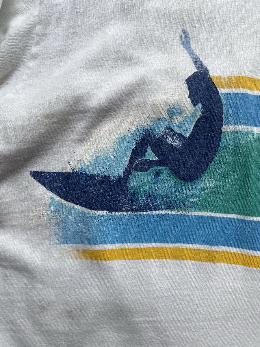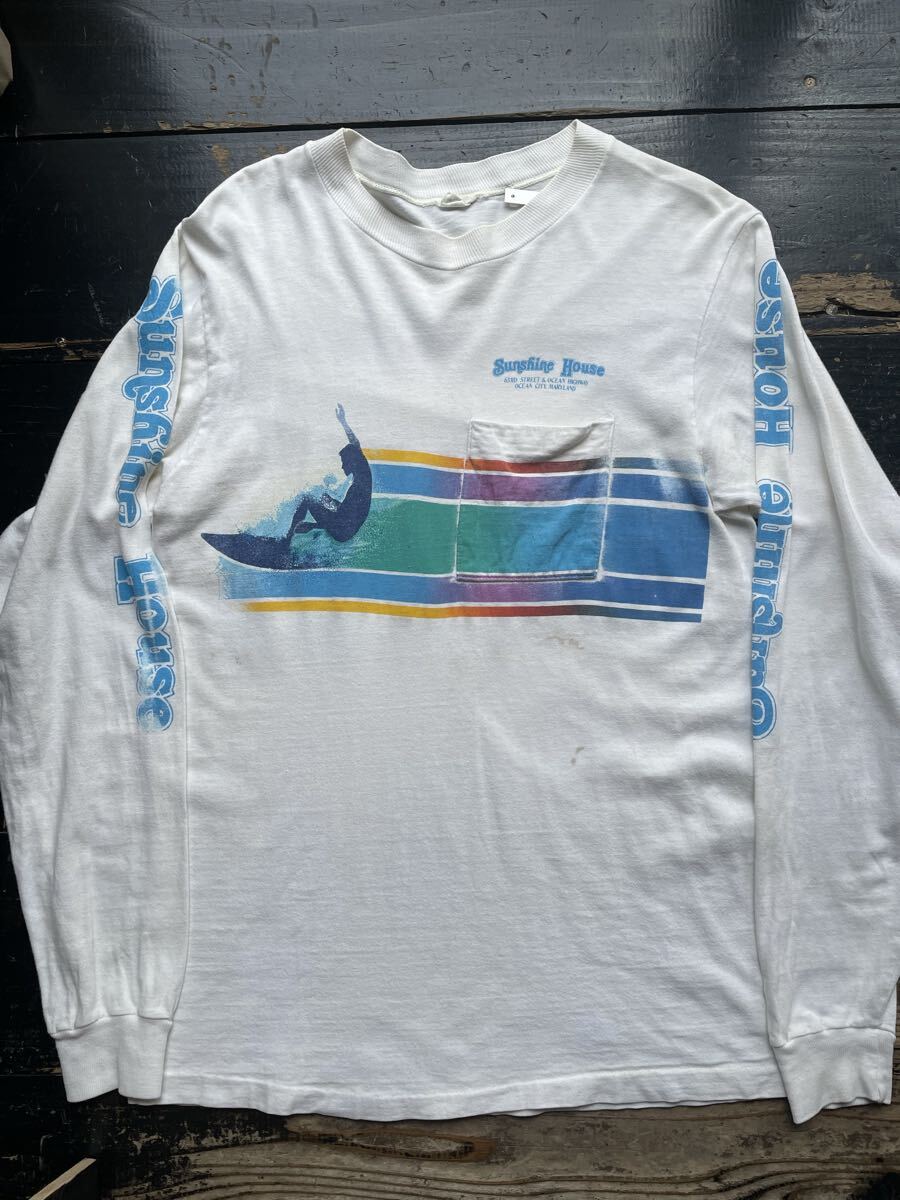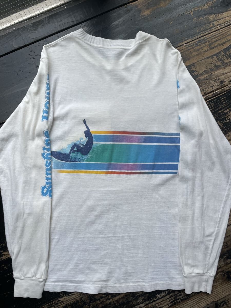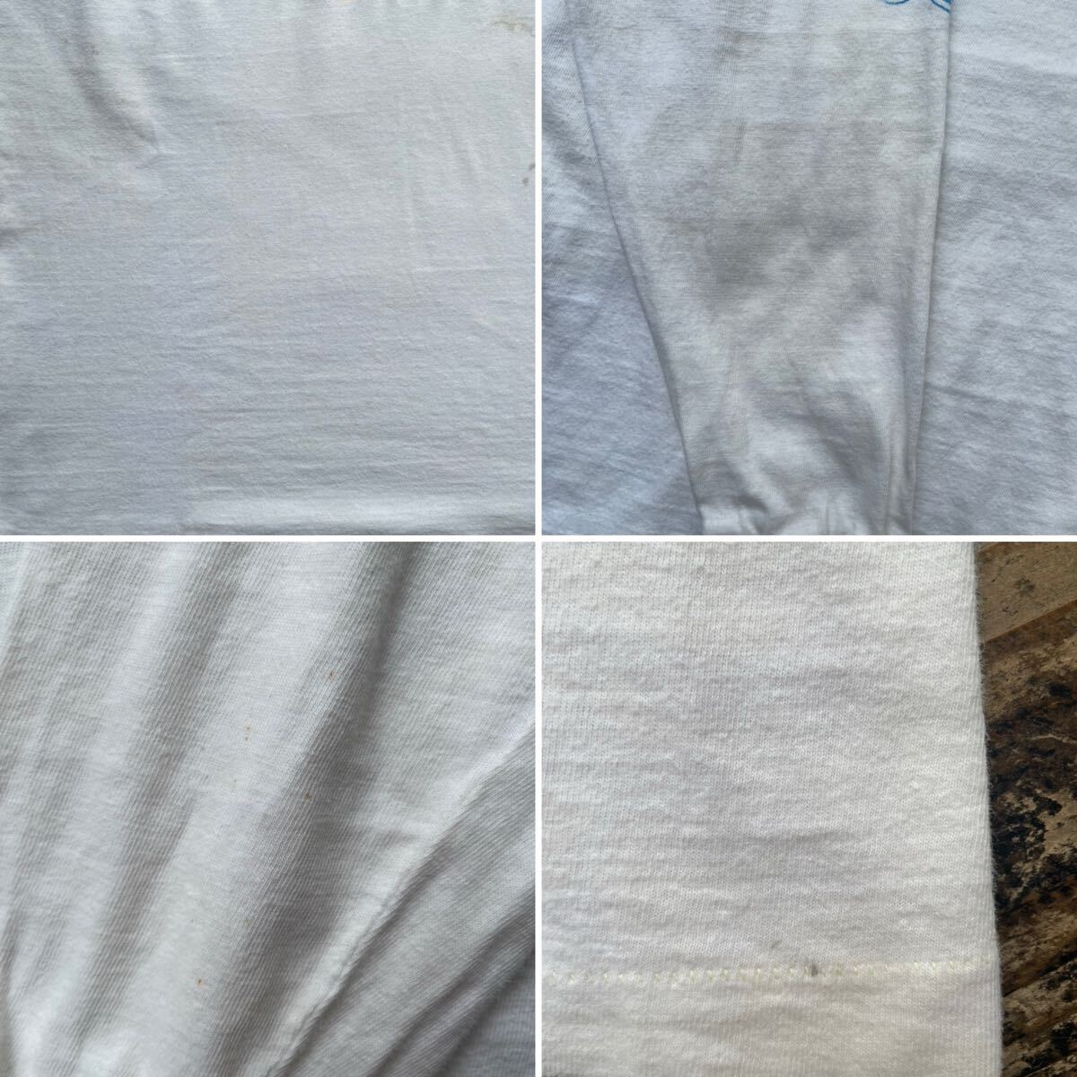 80年代位のロンT。タグありますが文字消えているので詳細不明 素材はコットン×ポリエステルだと思います。プリントは油性 フロント左胸にポケット付いてます。サイズはS位で肩幅45.5cm 身幅46cm 袖丈(肩から)65cm 着丈67cm ダメージは首リブ 両脇下は薄茶色に変色してます。前後見頃半分から裾は薄茶色に少し変色してると思います。全体の所々にシミ 汚れ プリントは剥げや色褪せあります。その他にもダメージありますがご使用には問題ないです。汚いのでボロいのがお好きな方にしかおすすめはできないです。両面両袖にプリント入りレトロなサーファーのプリントが雰囲気あるロンTだと思います。ダメージ物になるのでご理解ある方のご入札お願いします。お好きな方よろしくお願いします。