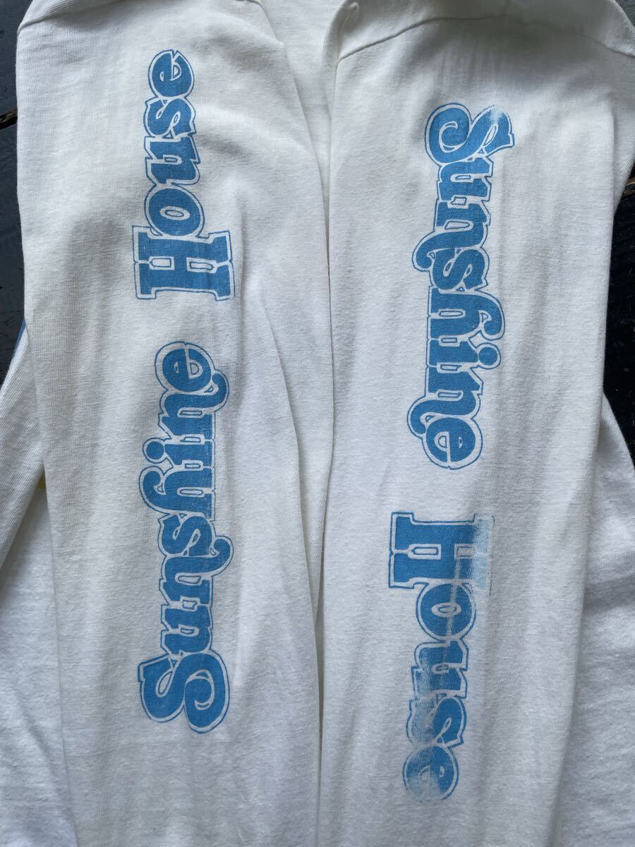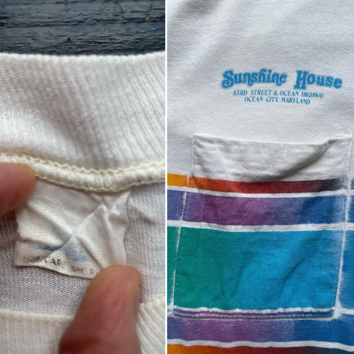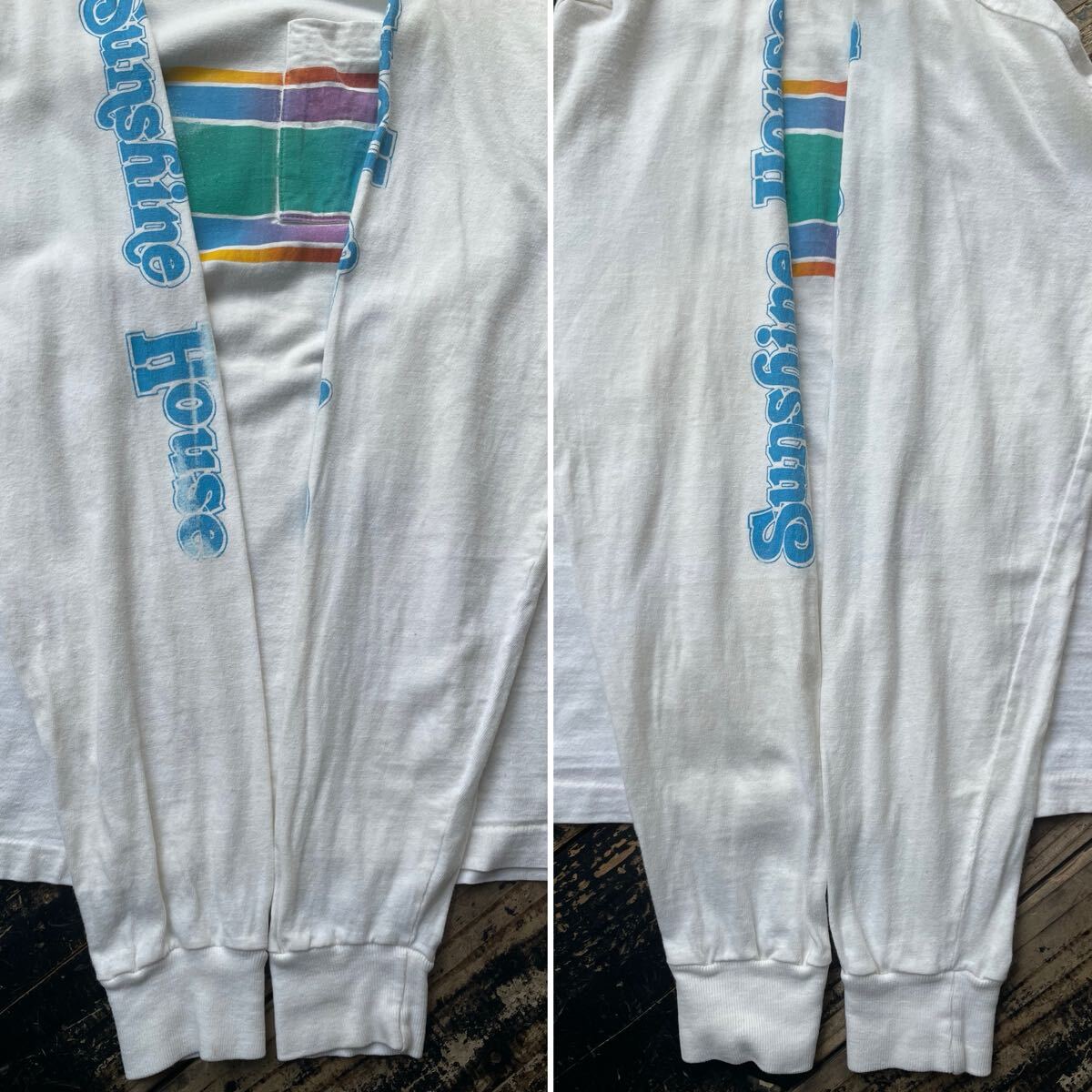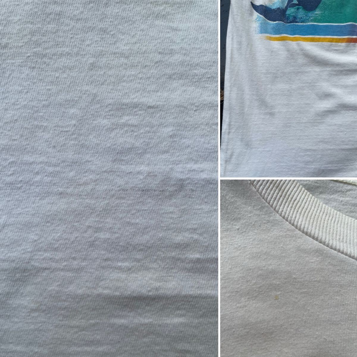 80年代位のロンT。タグありますが文字消えているので詳細不明 素材はコットン×ポリエステルだと思います。プリントは油性 フロント左胸にポケット付いてます。サイズはS位で肩幅45.5cm 身幅46cm 袖丈(肩から)65cm 着丈67cm ダメージは首リブ 両脇下は薄茶色に変色してます。前後見頃半分から裾は薄茶色に少し変色してると思います。全体の所々にシミ 汚れ プリントは剥げや色褪せあります。その他にもダメージありますがご使用には問題ないです。汚いのでボロいのがお好きな方にしかおすすめはできないです。両面両袖にプリント入りレトロなサーファーのプリントが雰囲気あるロンTだと思います。ダメージ物になるのでご理解ある方のご入札お願いします。お好きな方よろしくお願いします。