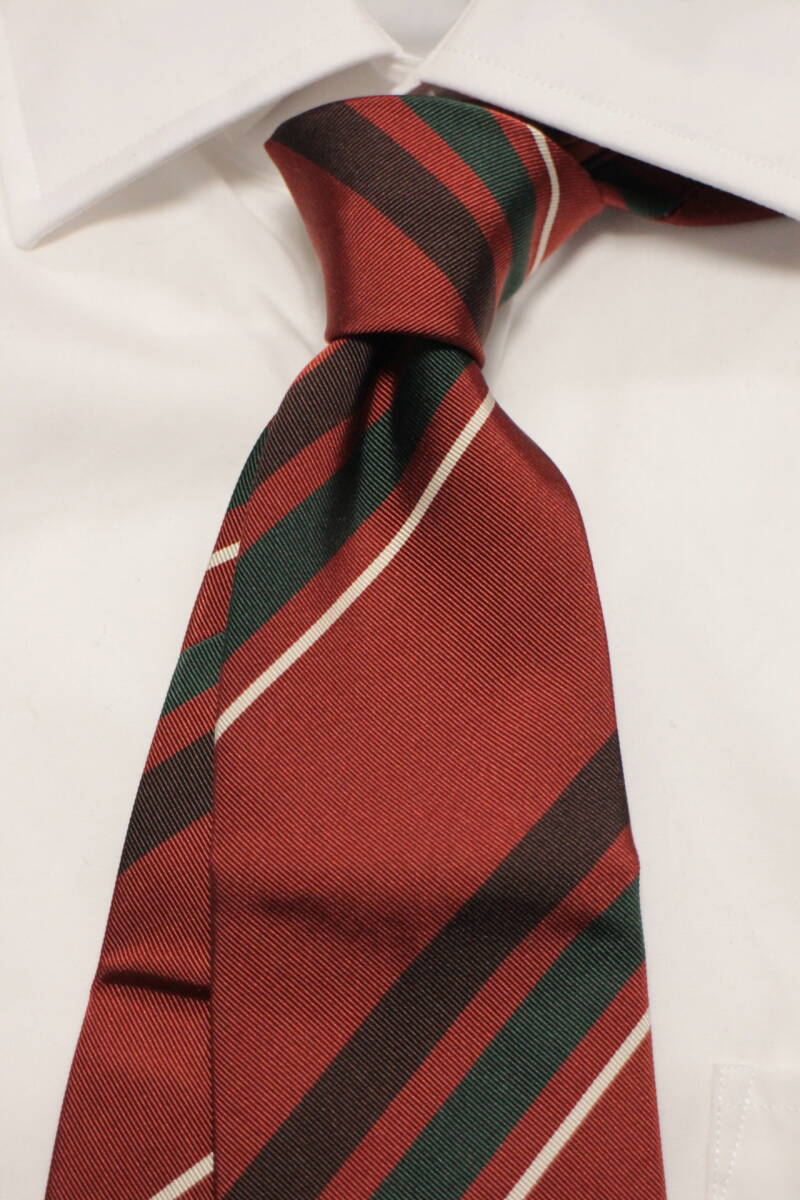 フランコバッシ*阪急新品ネクタイ超華麗艶テラコッタ*ブラウン*グリーンレジメンタル極上英国モガドールシルクハンドメイド