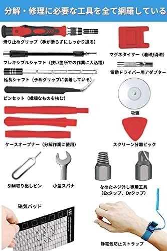 【豊富なツール数】延長シャフト、フレキシブルシャフト、ピンセット、SIM取り出しピン、 スクリーン分離ピック、マグネタイザー(磁力回復)、吸着カップ、ビット変換用用アダプター、ケースオープナー、ポケットレンチ、磁気シート、静電気防止ストラップなどを付属。