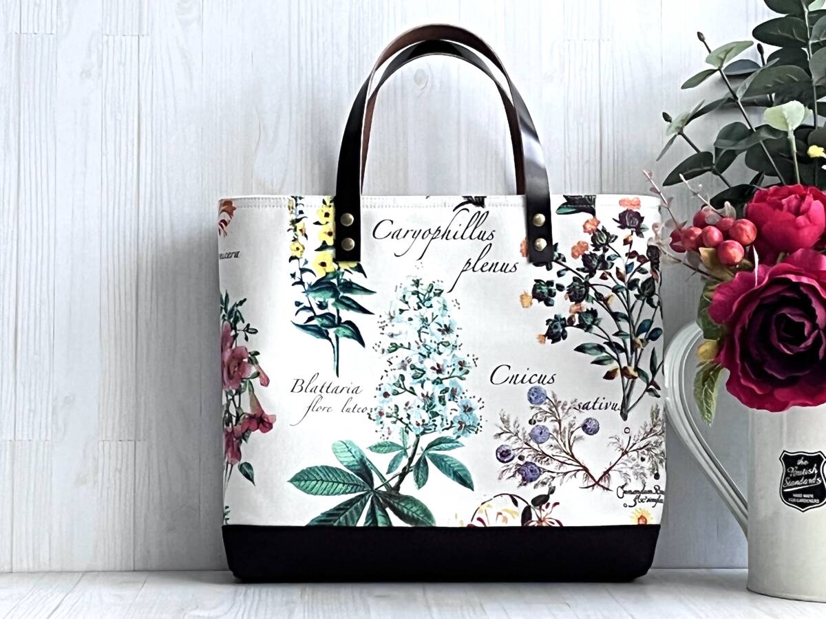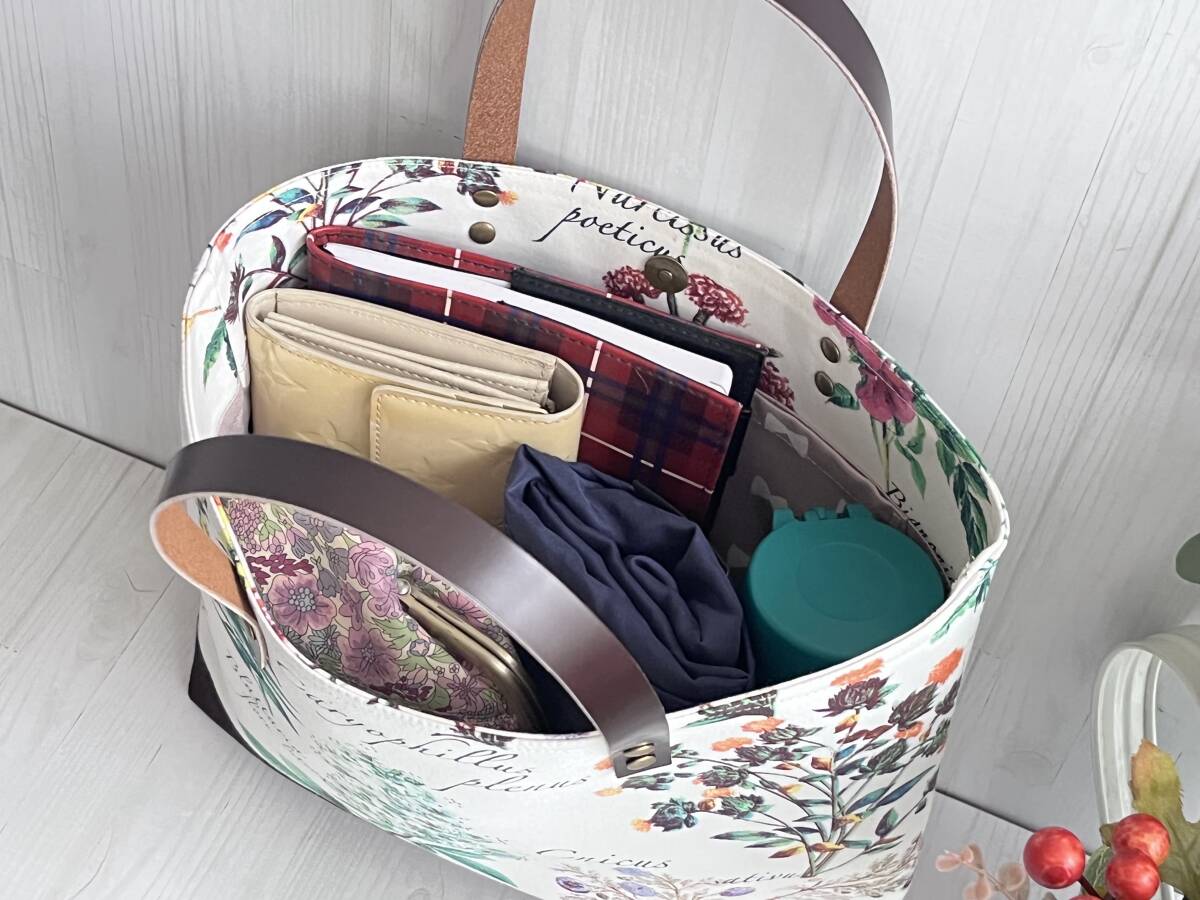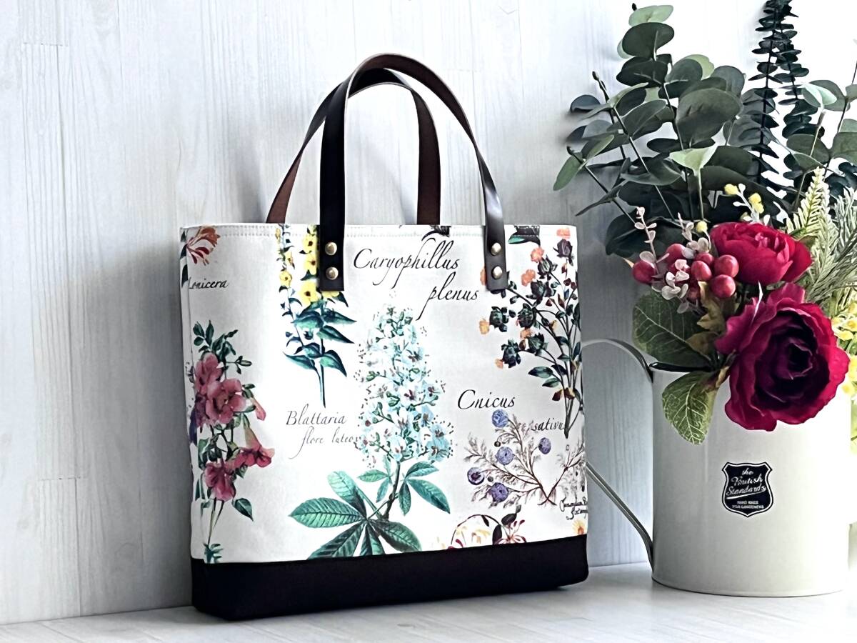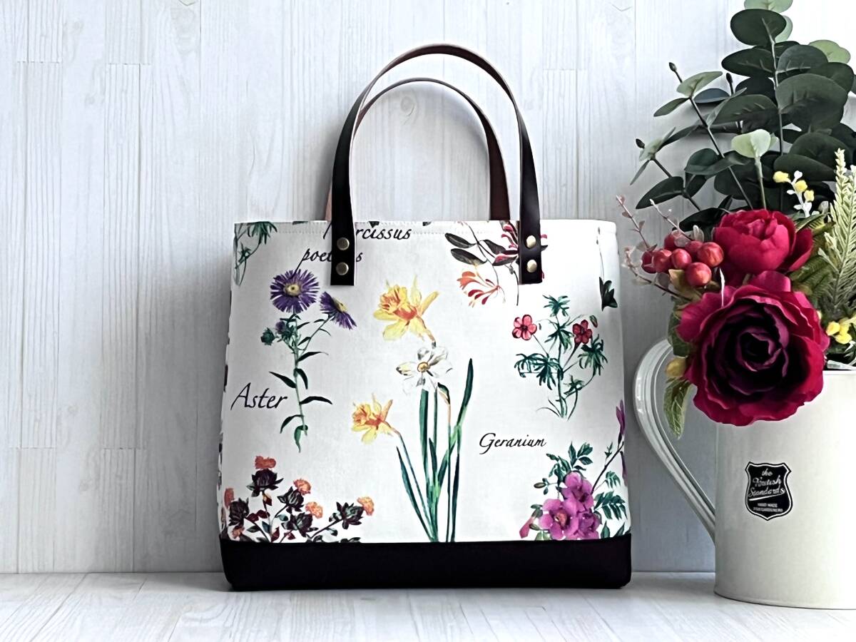 ハンドメイド+YUWA+コットン+ガーデン+ライラック+水仙+秋色+花柄+カーネーション+トートバッグ +Sサイズ +本革+帆布