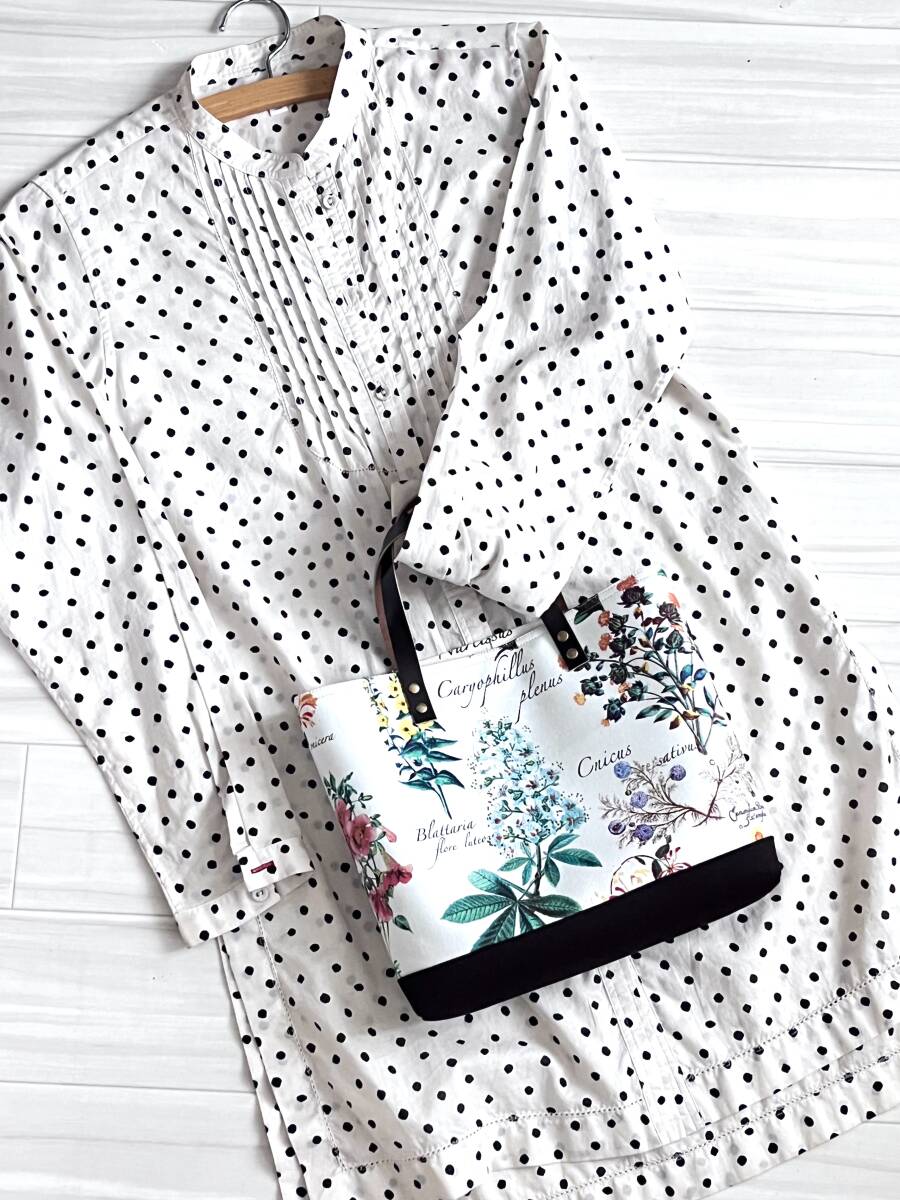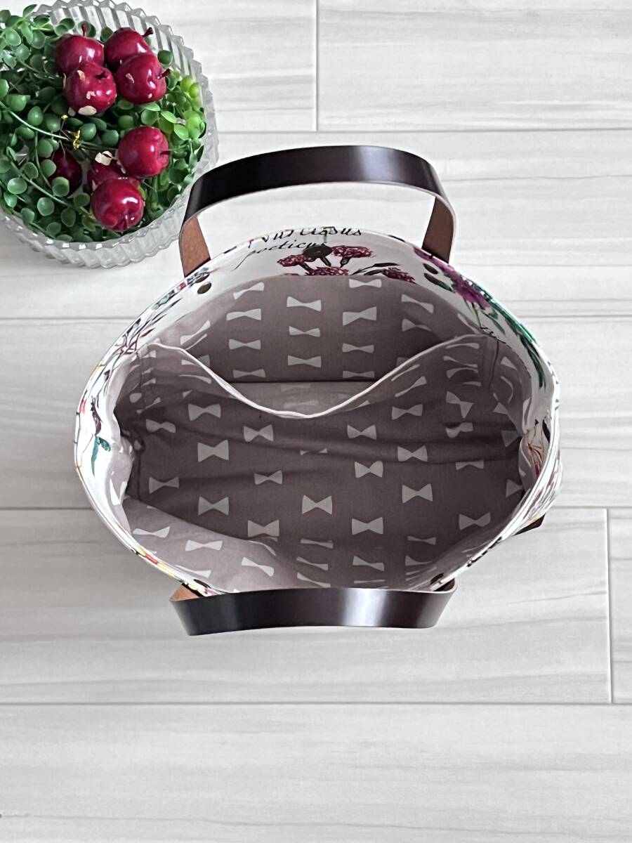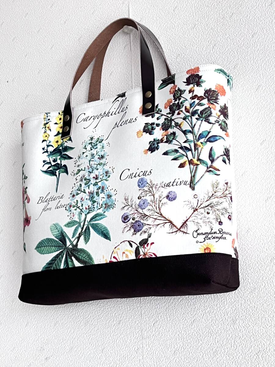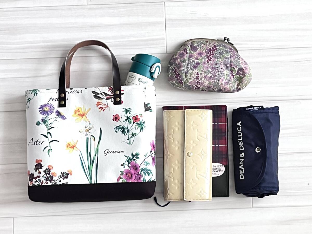 ハンドメイド+YUWA+コットン+ガーデン+ライラック+水仙+秋色+花柄+カーネーション+トートバッグ +Sサイズ +本革+帆布