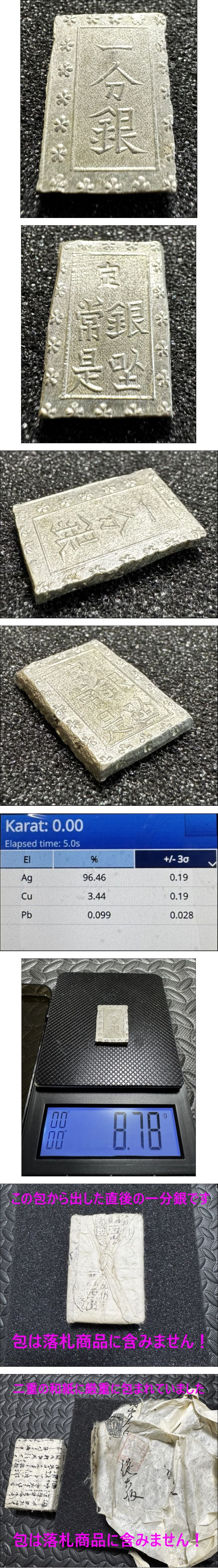 | 商品説明 | 【商品内容】 希少 【本座 安政一分銀 Ab 】 包出し ほぼ流通の痕跡が見られず、地肌の光沢や文字の切立ちも、とてもキレイです。 和紙の包の中に、さらに和紙で2重に厳重に包まれており 保存状態が非常に良い一分銀です。(写真に掲載) 個人的な感覚にはなりますが、 鑑定に出したら、MS鑑定つくんじゃないかなぁと思っています。 【品位】 銀96.46% OLYMPUS VANTA 蛍光X線分析計機 (約400万円)で測定。 鑑定結果は写真に掲載しています。 【量目】:8.78g 【状態】: 銀座オークションにて落札した一分銀、包出しです。 一分銀の包を開封した中の品物です。 画像にある包の中から出しました。 包は落札商品に含みません! 【本座 安政一分銀 Ab 】となります。 コンディションは写真でご判断ください。 現状で気に入っていただける方のみお願い致します。 計量器は安価な物ですので多少の誤差はあると思います。 発送は【おてがる配送ゆうパケットポスト】を選んでいただき コインホルダーに入れ、プチプチに包み さらにプチプチ付き封筒に入れて発送いたします。 ◆あくまで個人保管品です。 画像にてご判断いただき、ご納得いただける方のみご入札をお願い致します。 また画像には限りがございますので、色味が異なる場合などあるかもしれません。 詳細部分にこだわる方、完璧をお求めになる方、状態に神経質な方もご遠慮願います。 商品状態に関しては個人差がございます。 落札後の商品状態による返品や故障時の補償は一切お断りいたします。 (すり替え防止の為) ◆不要なトラブルを避けるため、3日以内のご決済、 速やかな受け取り連絡をお守り頂ける方のみとしております。 あらかじめご了承ください。 お守り頂けなかった場合、落札者都合キャンセルとさせていただきます。 以上、全てをご了解いただける方のみご入札をお願い致します。 ■新規の方及び、評価が低い方の入札は取り消させていただく場合がございます。 ■領収証の発行は対応しておりません。 |