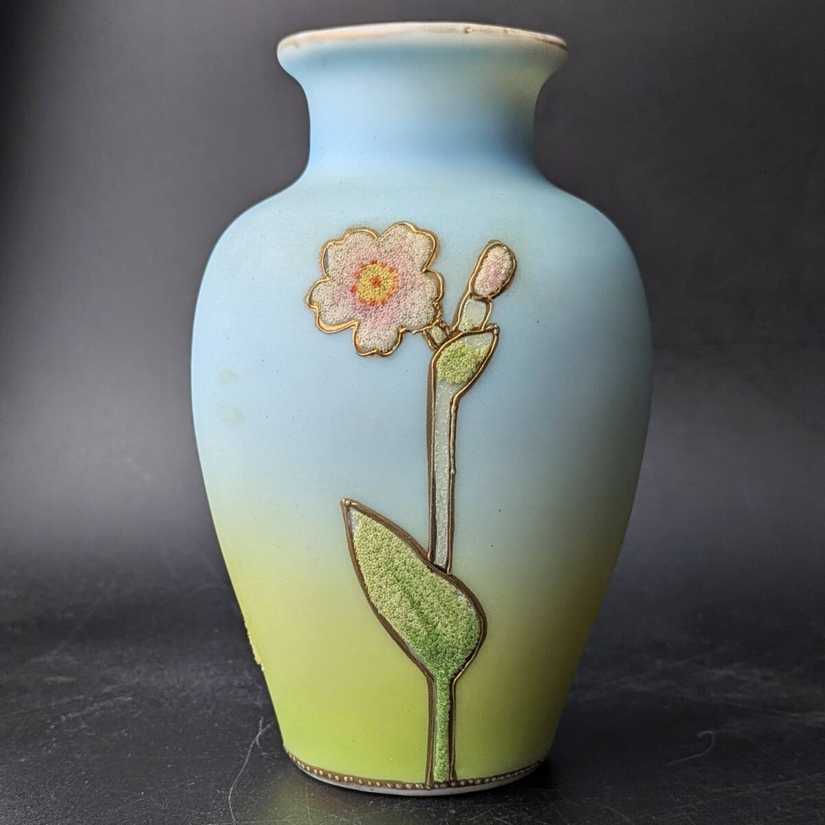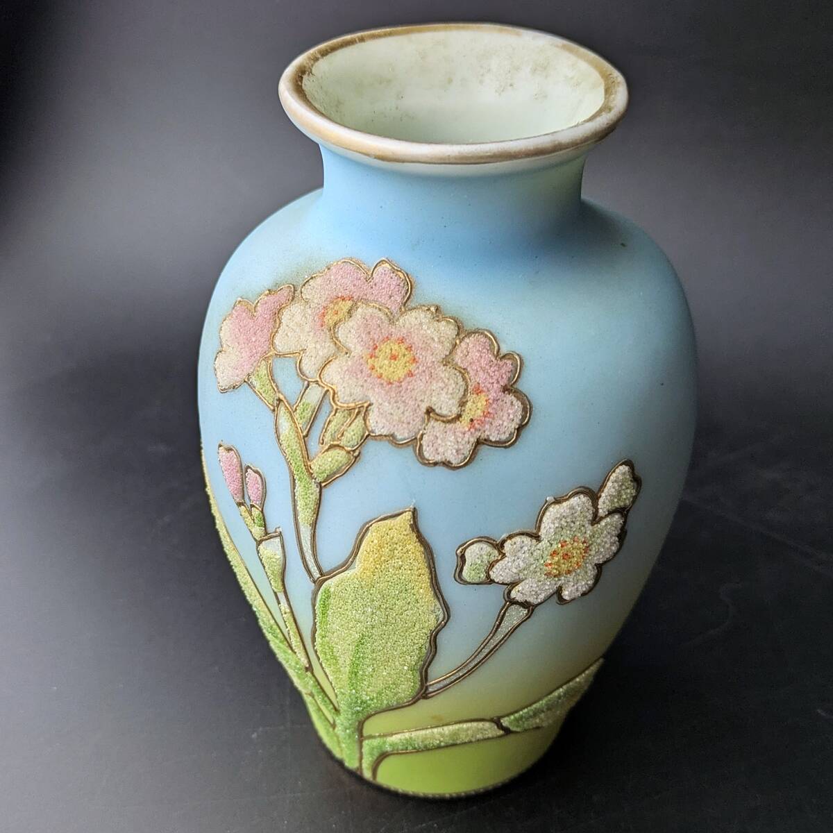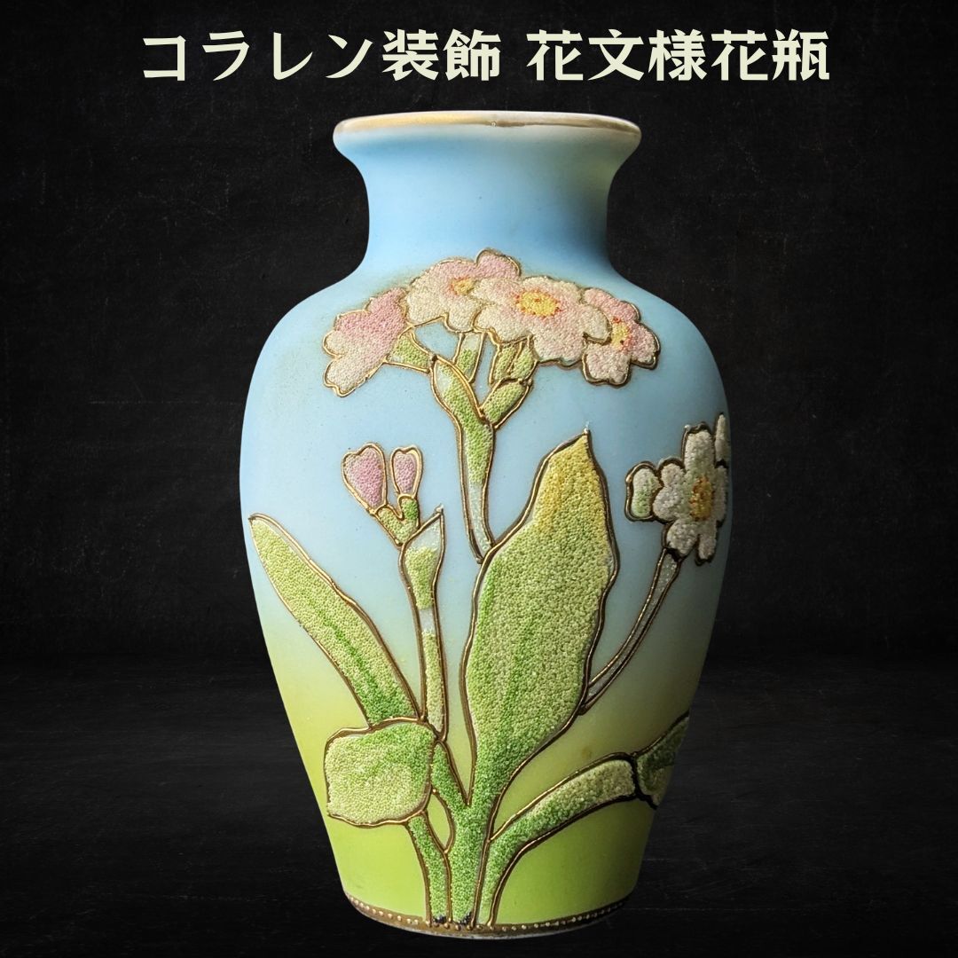 | E1292-15 ◆返品承ります 万一お気に召さない場合、評価前なら返品お受けします ご安心してご検討下さい ◆ぜひ ⇒こちら もご覧ください。 価格のご相談などはプロフィール欄ご覧ください。 ◆お品物◆ コラレン装飾 花文様の小花瓶 アンティーク 日本輸出品 明治末~大正期 高さ12cm 径:7㎝(最大部) Coralene 装飾で描かれた花文様が印象的な、小ぶりな花瓶です。 薄いブルーから淡いグリーンへのグラデーション地に、小さな春の花々が愛らしく彩られ、金彩の縁取りでエレガントさも添えられています。 底には「Coralene Patent No.1637 JAPAN」のバックスタンプがあり、この技法の特許表示を持つ輸出向けコラレン作品であることが確認できます。 明治末〜大正期頃の意匠を残す、希少なアンティーク装飾陶磁器の一つです。 一部に剥離の箇所があり、金彩取りにも薄れや擦れがありますが、ヒビ・大きな欠けはなく、アンティークならでは風合いを楽しむことが出来ます。 小ぶりで使いやすく、ディスプレイ向きです。 花を一輪挿すミニ花瓶として、あるいは棚やデスク上の装飾品としてもぴったりです。 | ||