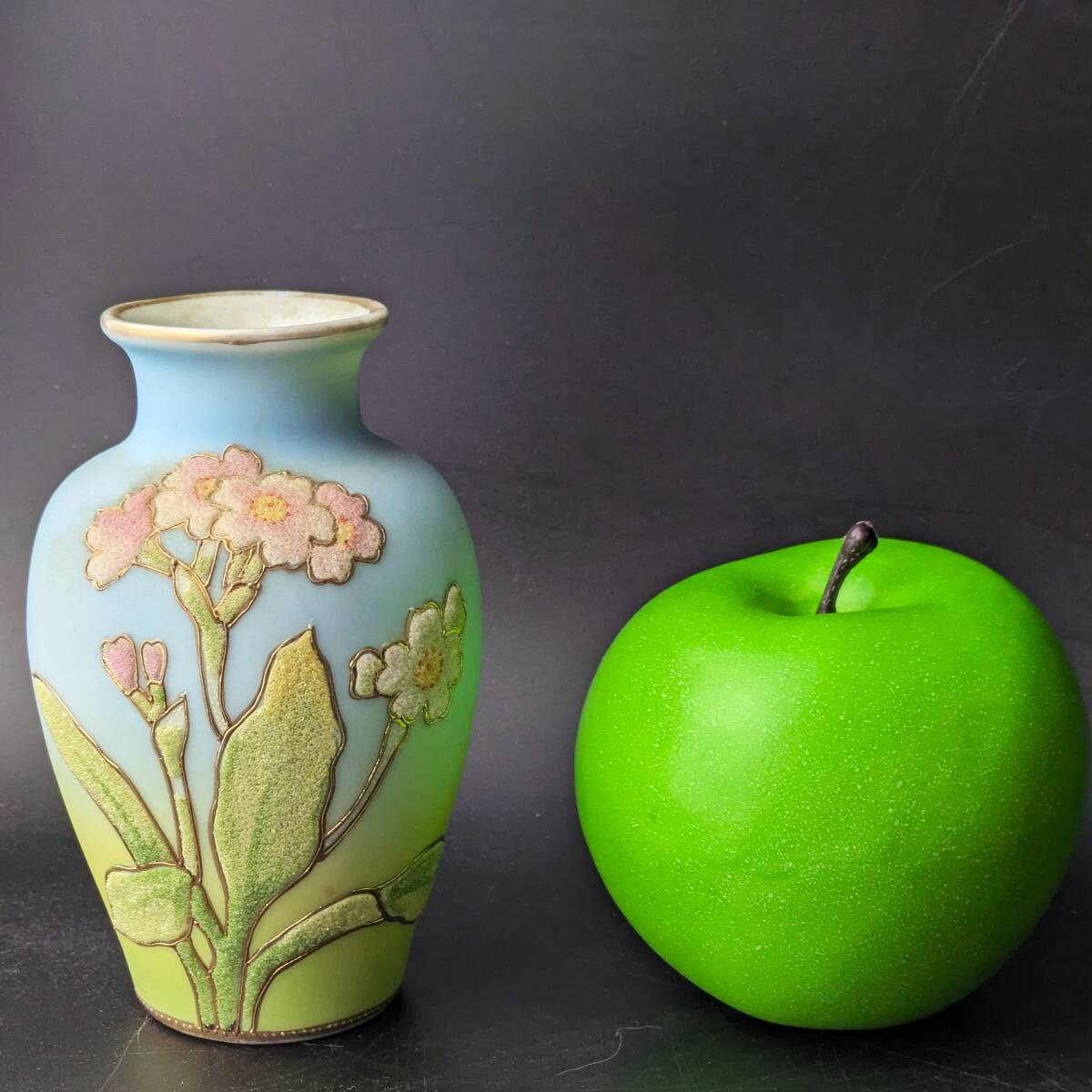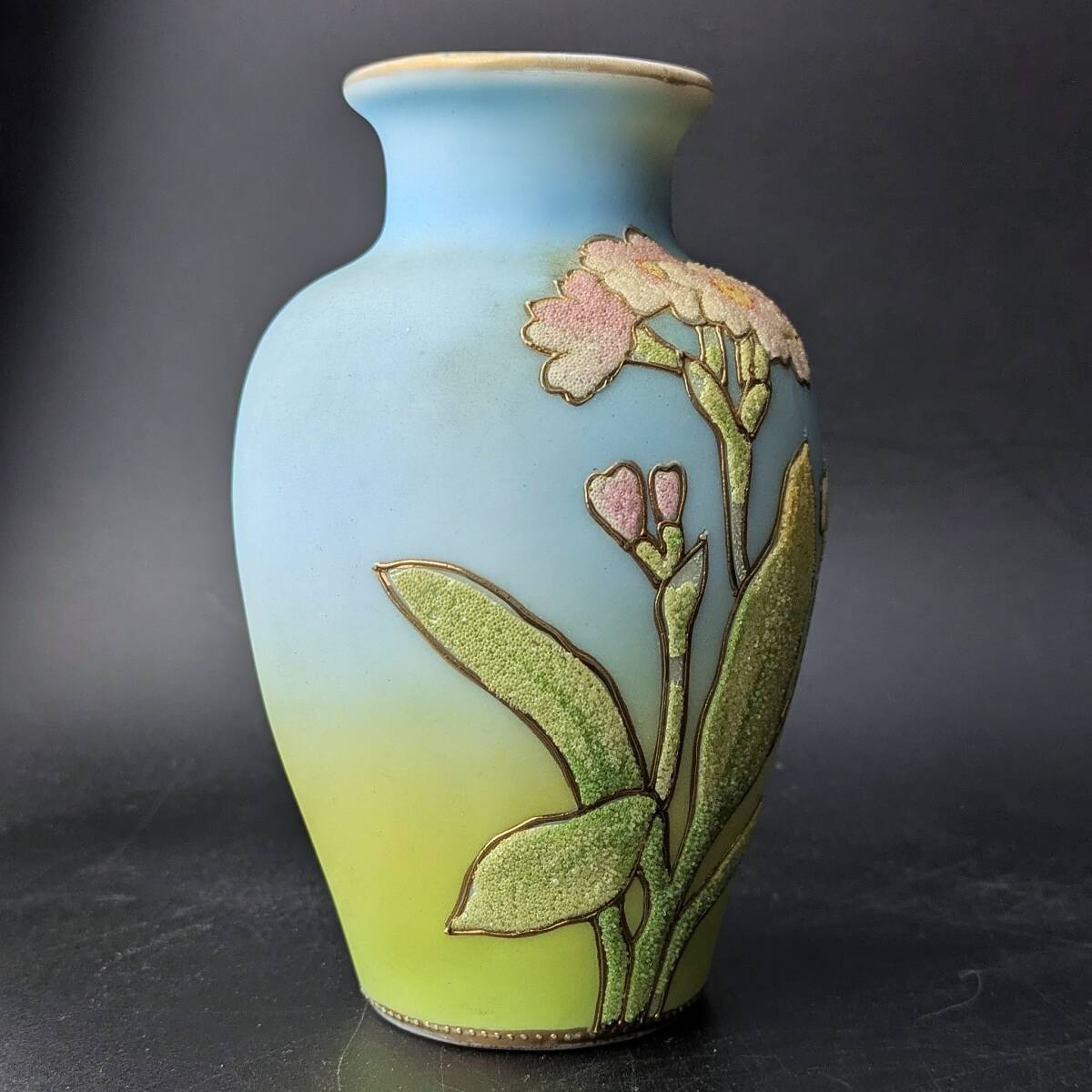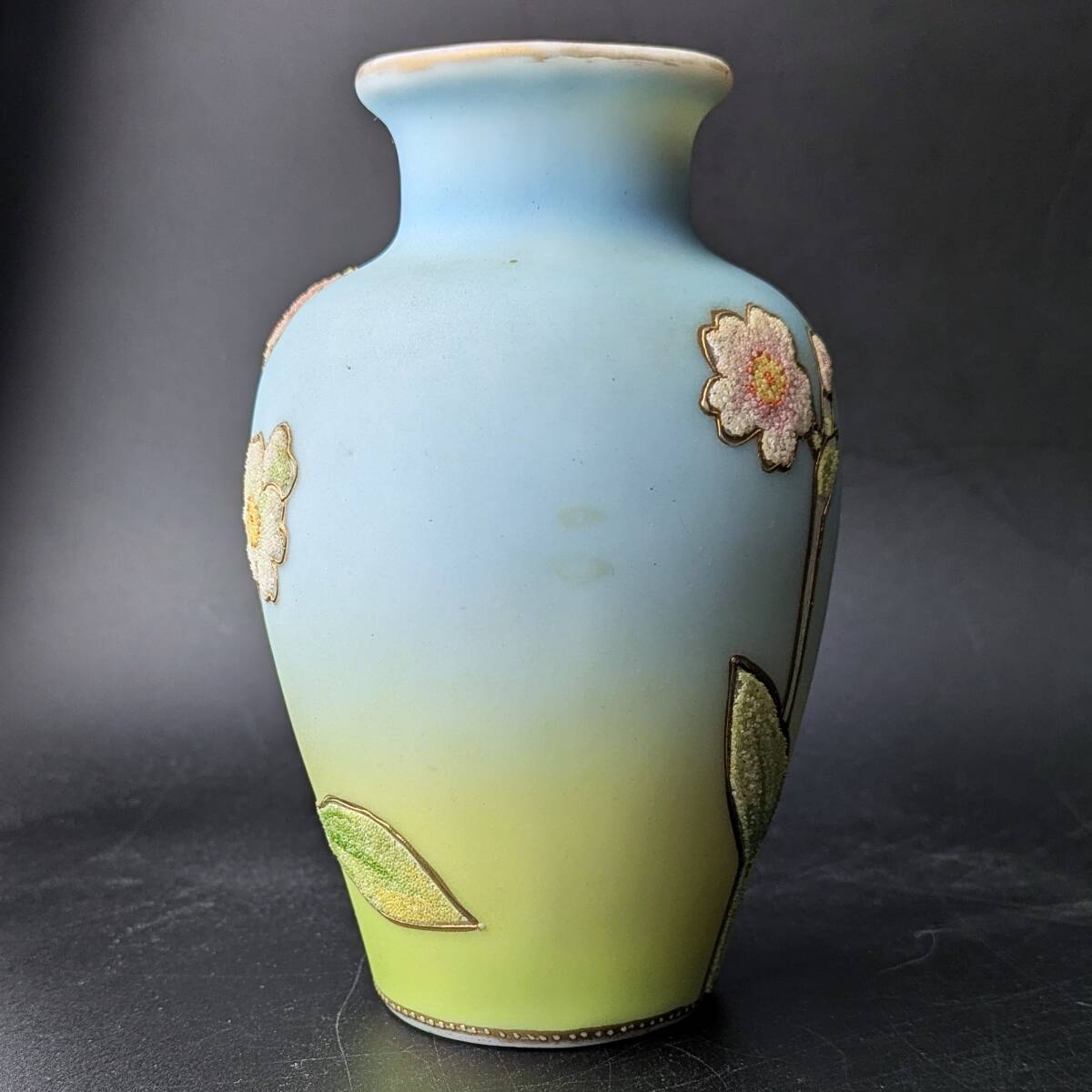 | E1292-15 ◆返品承ります 万一お気に召さない場合、評価前なら返品お受けします ご安心してご検討下さい ◆ぜひ ⇒こちら もご覧ください。 価格のご相談などはプロフィール欄ご覧ください。 ◆お品物◆ コラレン装飾 花文様の小花瓶 アンティーク 日本輸出品 明治末~大正期 高さ12cm 径:7㎝(最大部) Coralene 装飾で描かれた花文様が印象的な、小ぶりな花瓶です。 薄いブルーから淡いグリーンへのグラデーション地に、小さな春の花々が愛らしく彩られ、金彩の縁取りでエレガントさも添えられています。 底には「Coralene Patent No.1637 JAPAN」のバックスタンプがあり、この技法の特許表示を持つ輸出向けコラレン作品であることが確認できます。 明治末〜大正期頃の意匠を残す、希少なアンティーク装飾陶磁器の一つです。 一部に剥離の箇所があり、金彩取りにも薄れや擦れがありますが、ヒビ・大きな欠けはなく、アンティークならでは風合いを楽しむことが出来ます。 小ぶりで使いやすく、ディスプレイ向きです。 花を一輪挿すミニ花瓶として、あるいは棚やデスク上の装飾品としてもぴったりです。 | ||