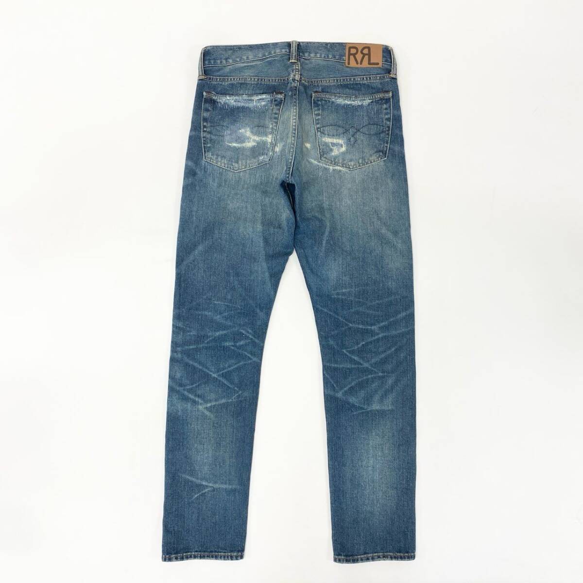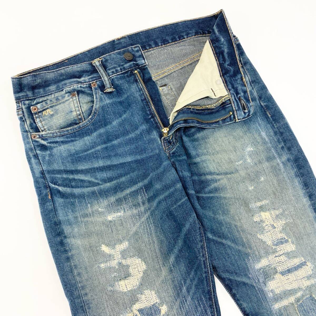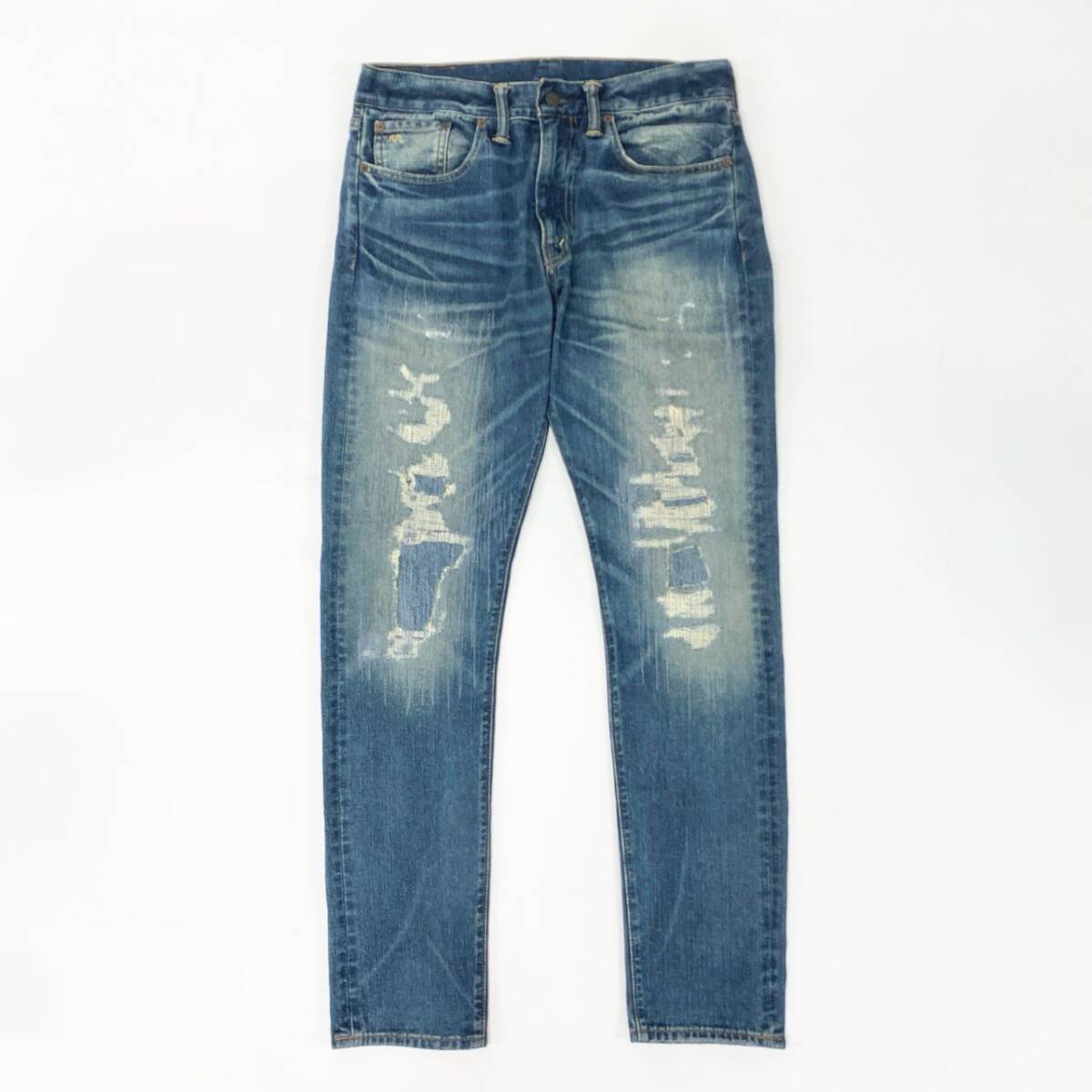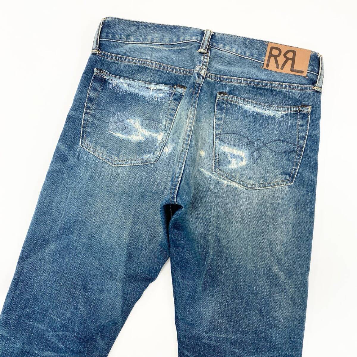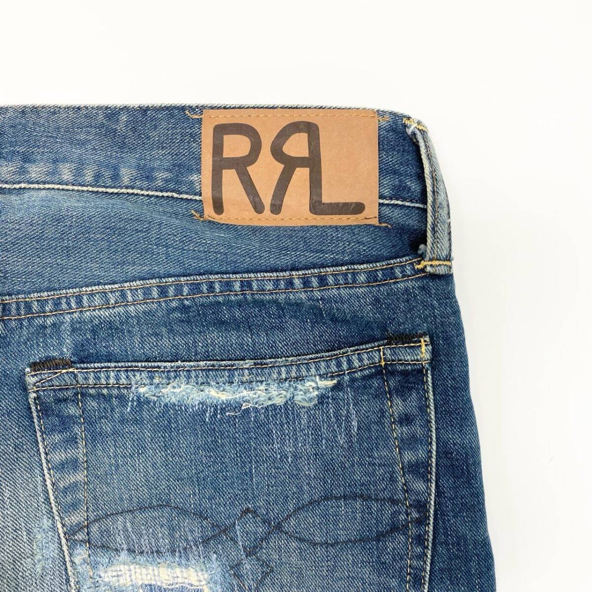 スタッフ商品コメント | ダブルアールエルのデニムパンツで、色はヴィンテージ感漂うブルー。大胆なダメージ加工とヒゲ、色落ちが特徴で、存在感のある一本です。マットなコットンデニム素材を使用し、着込むほどに風合いが増す仕上がり。ジップフライ仕様で実用性も高く、カジュアルスタイルやストリートコーデに最適です。ブーツやスニーカーと合わせてラフに着こなせます。 |