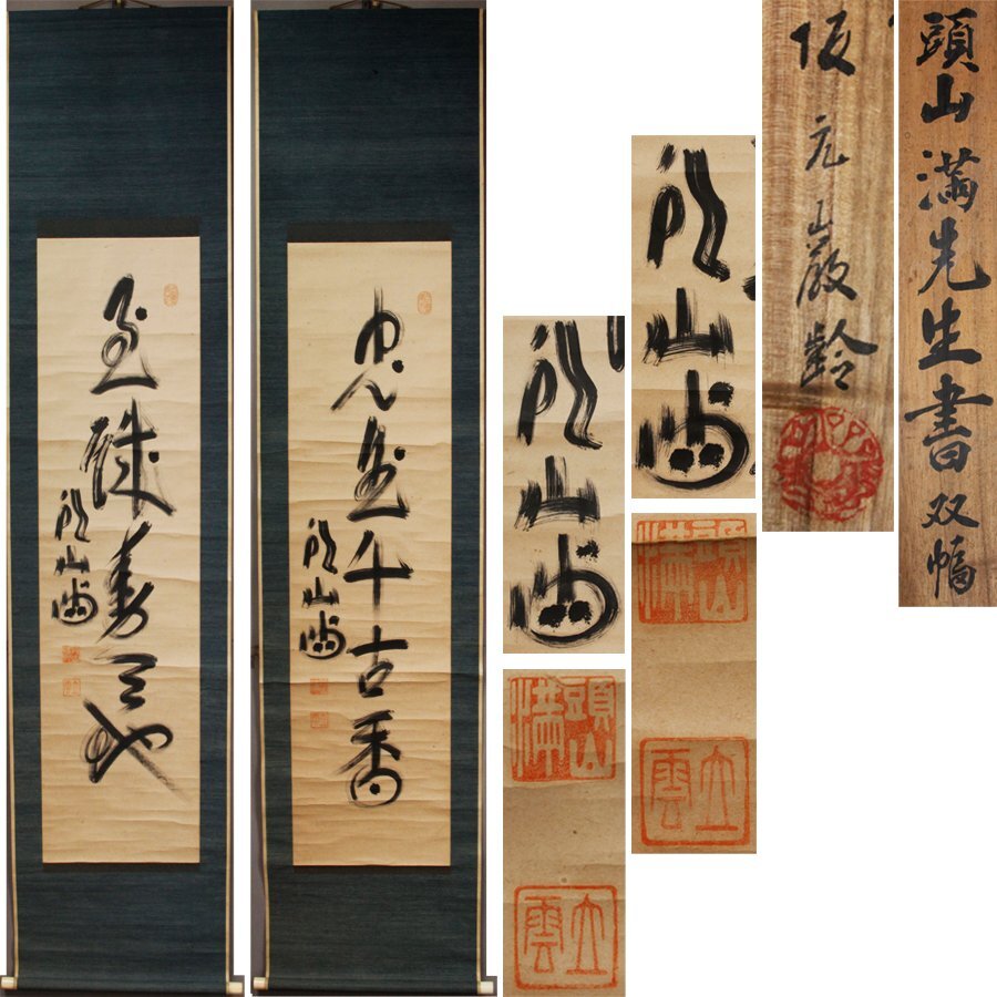 ■商品説明 下記、政治運動家 頭山満の手により、 独特な筆使いにて書かれた一行書 「忠〇千古香」「忠誠〇〇〇」の品を軸装に仕立てた双幅の作品であり、 御覧の識箱に納まっております。 《 頭山満(とうやま みつる) 》 安政2年(1855年)~昭和19年(1944年) 福岡藩士・筒井亀策の三男として生まれる。 幼名:乙次郎。号:立雲。 後に母方の頭山家を継ぐことになり、太宰府天満宮の「満」から 名前を授かって頭山満と改める。 アジア主義の立場で活動した国家主義者、著述家、政治運動家。 その政治的活動から政財界に太いパイプを持ちながら、 実業家(鉱山経営者)であり、 篤志家としての側面ももっていた。 ■紙本・肉筆 ■状 態 時代なりのヤケ・オレ・多少の傷み等あり。 ■寸 法 軸寸法/約211.0cm×約47.0cm。 本紙寸法/約134.0cm×約34.0cm。 ■落 款 御覧の様な銘・落款等あり。 ■箱 識箱。 【即決・送料無料】の表示商品に限り、 一部地域(北海道・沖縄)を除き、送料無料キャンペーンを実施しております。 ご希望の方は、お早めに入札して頂けます様、宜しくお願い致します。 【※※なお、作品に対して疑問や質問がある場合には、※※】 質問欄もしくは、ストア情報に当方の情報が記載されておりますので、こちらをクリックしてお問い合わせ下さい。 宜しくお願い致します。 |
