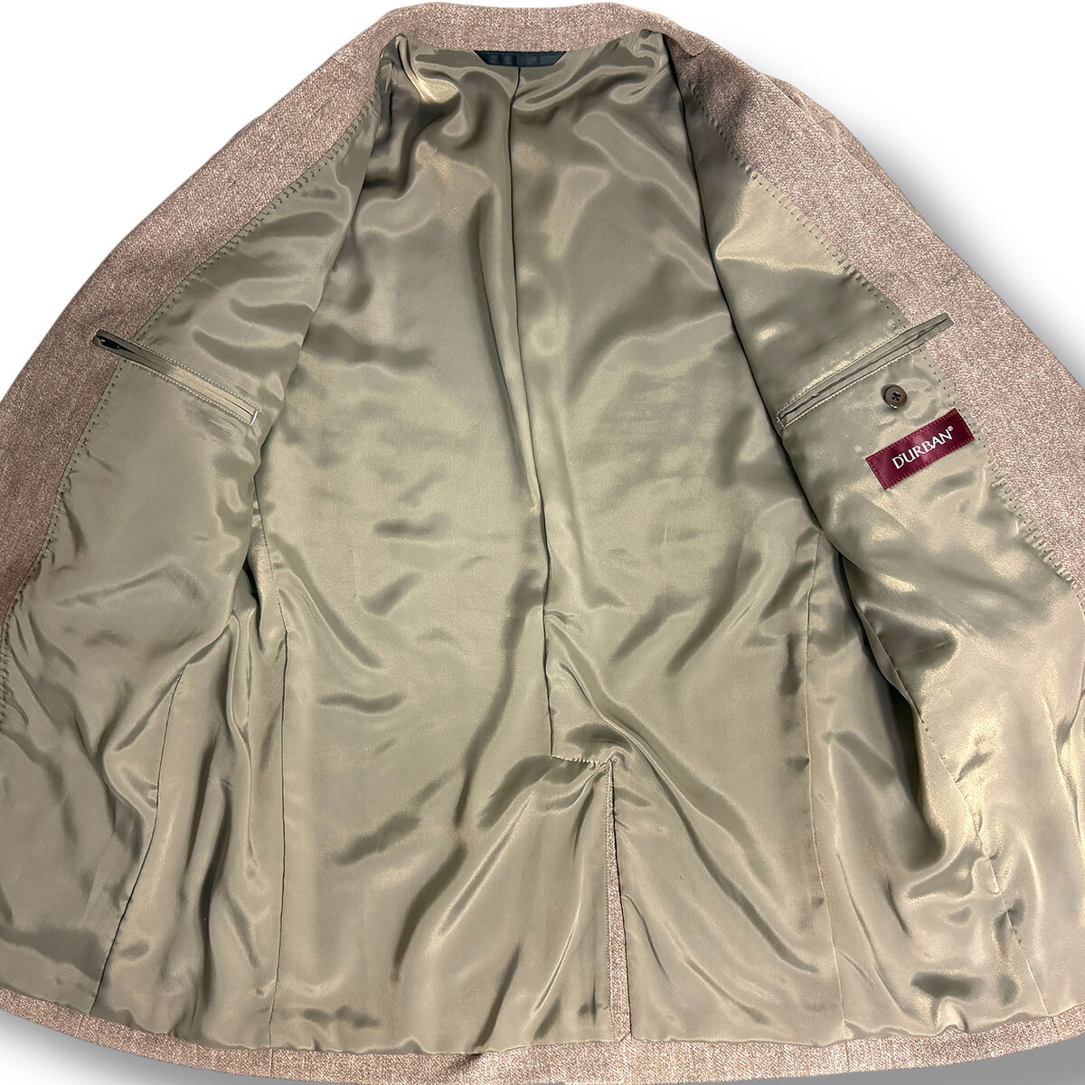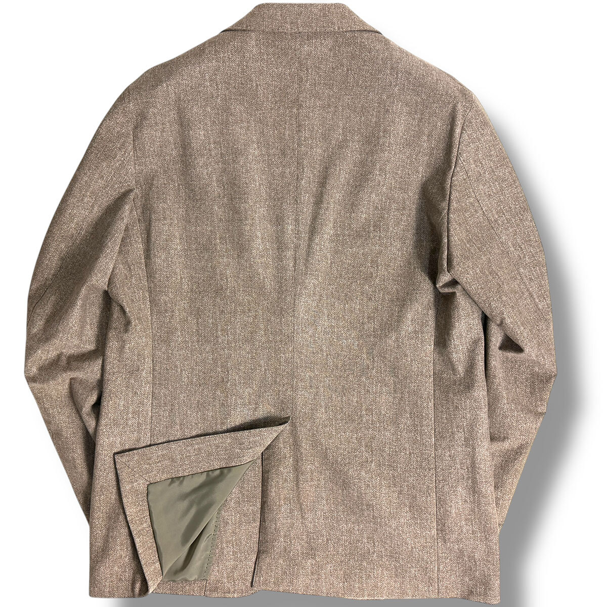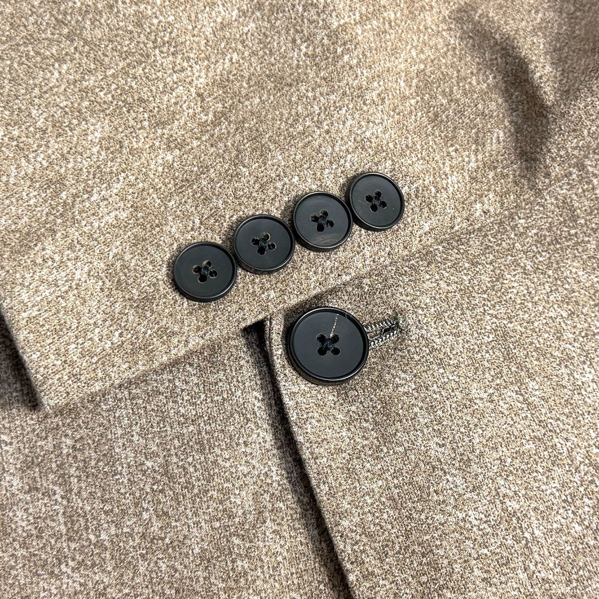 デザイン:フロント二つボタン、総裏地、センターベント、袖開き見せ。