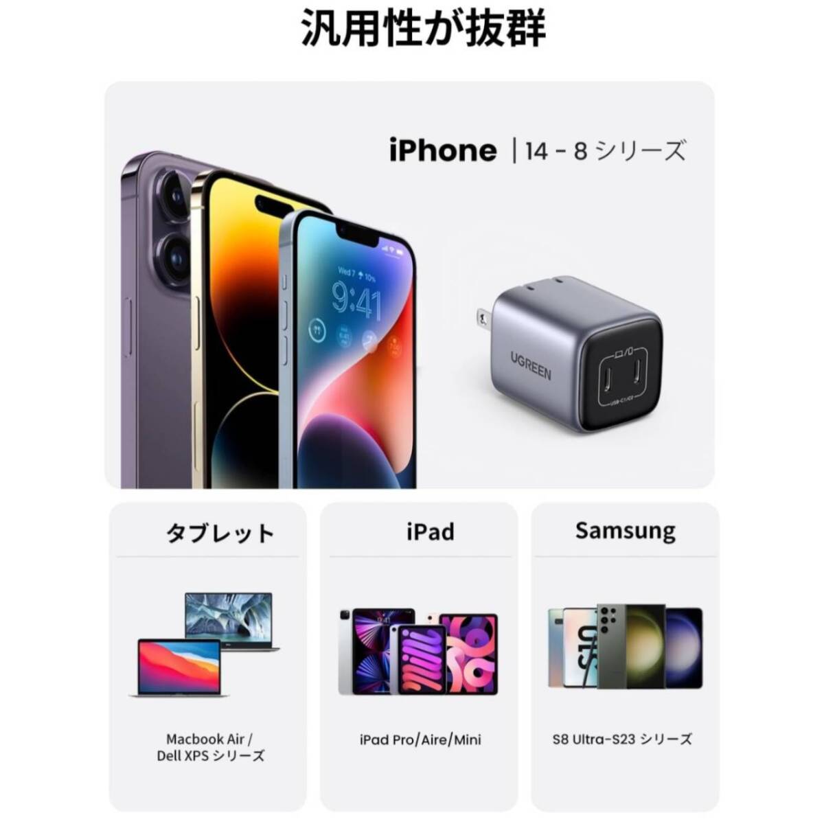 UGREEN独自技術Power Dispenserシステムにより、接続されたデバイスに応じ、自動的に出力を判別し、機器が必要とする電力に賢く適応させてパワフルかつ安全に充電可能です。また、過充電保護、過熱防止、過電流防止、ショート防止など、複数の安全保護機能があり、安心してご利用いただけるタイプc アダプターです。