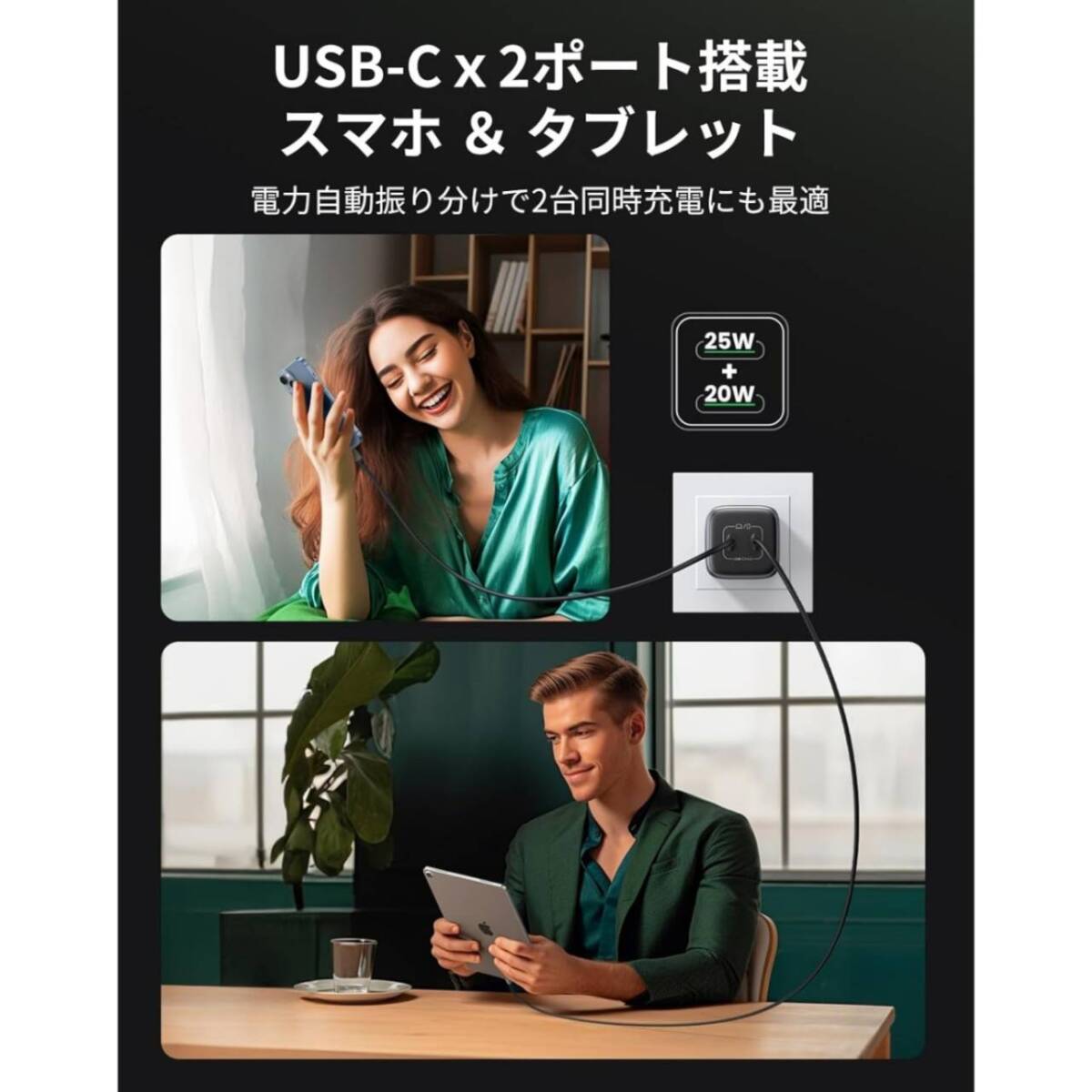 デュアルUSB-Cポートで2つのモバイルデバイスを同時にフルスピードで充電!25W+20W出力の組み合わせて2台のデバイスを同時急速充電できます。新しいオリジナルの35W充電器と比べ、UGREEN Nexode Mini 45W USB Type-C 充電器はもっと高出力で対応られます。また、PD3.0、PPS、QC4+(QC4.0/QC3.0)、FCP、AFC、BC1.2など、複数の急速充電プロトコルをサポートし、互換性抜群で、あらゆるデバイスに充電対応します。