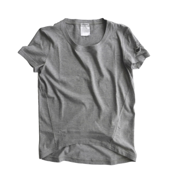 シャネルの半袖Tシャツ。 袖のワンポイントビジュー装飾がフェミニンな仕上がりです。 薄手の滑らかな生地感で夏でも快適な着心地です。 立体的なパターンで、シンプルながらもフロントのデザインが春や秋にもインナーとして活躍します。 |