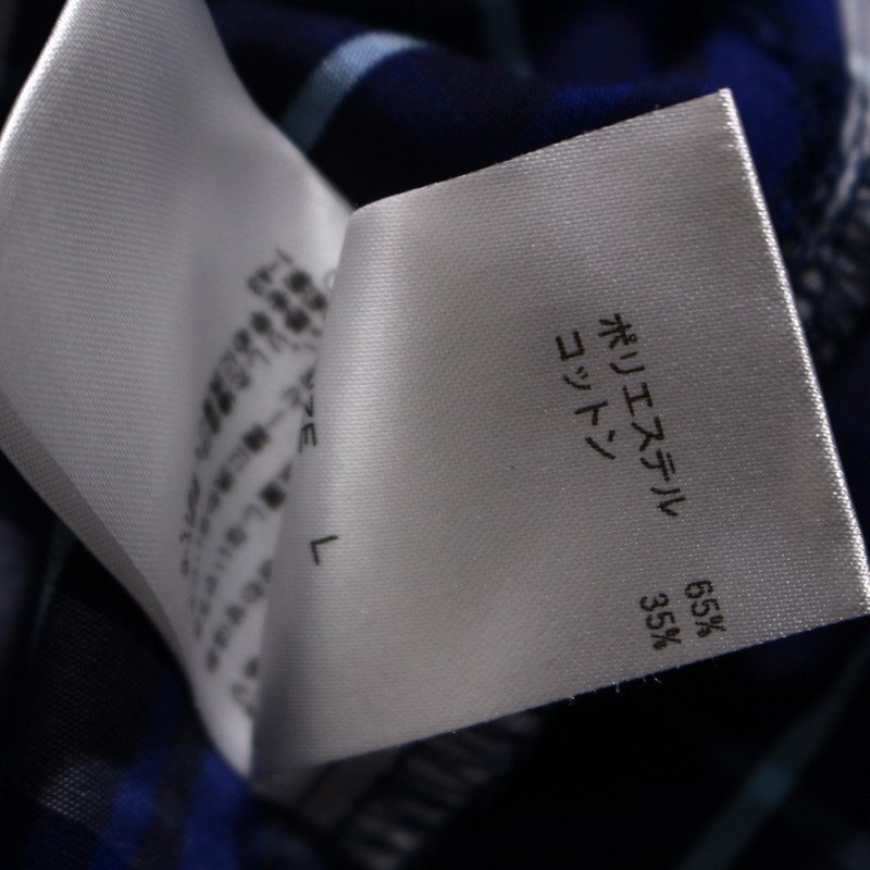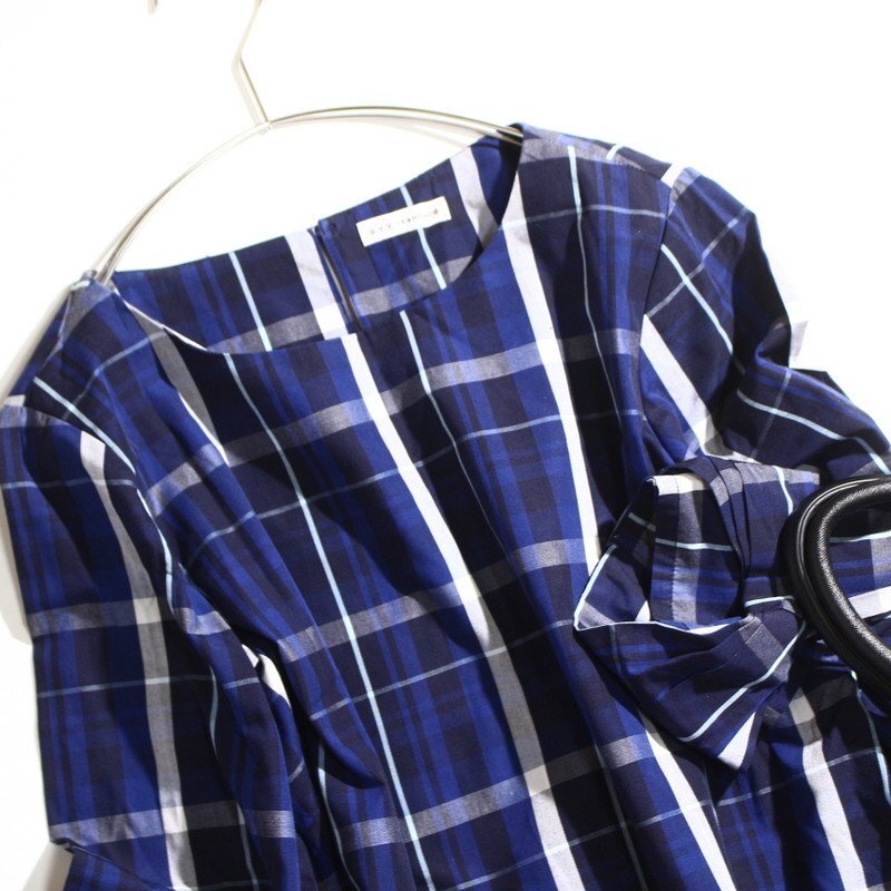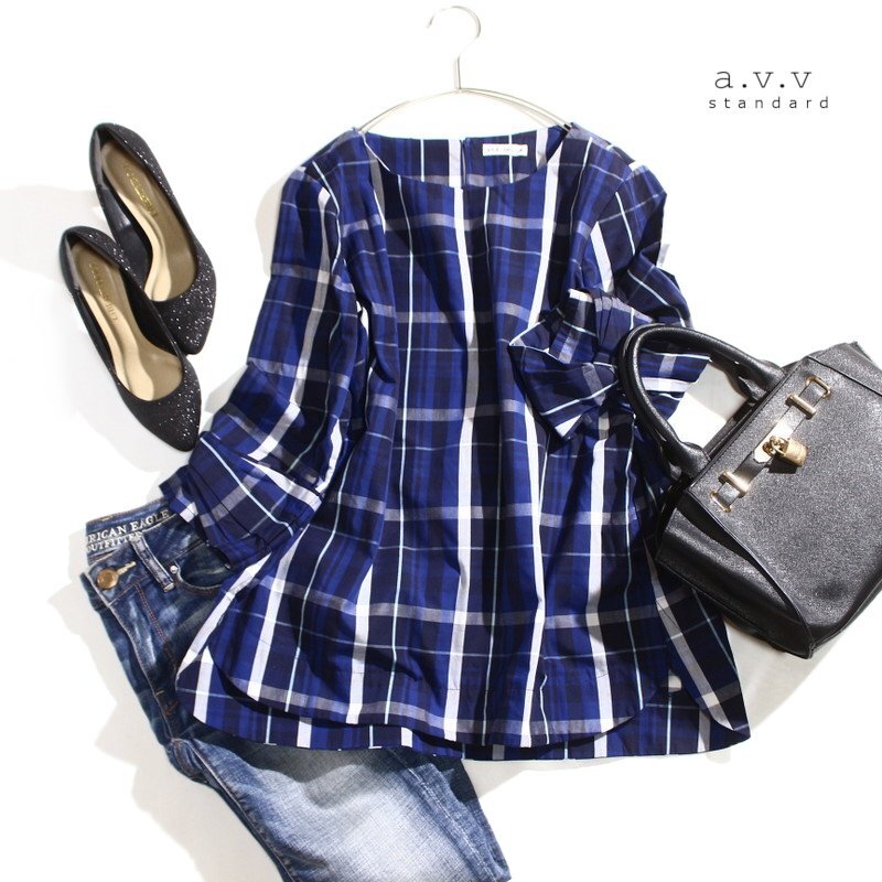 美品 アーヴェヴェスタンダード a.v.v standard イトキン(株) チェック柄 8分袖 ブラウス カットソー L ブルー 青 ネイビー 紺 ロング 白