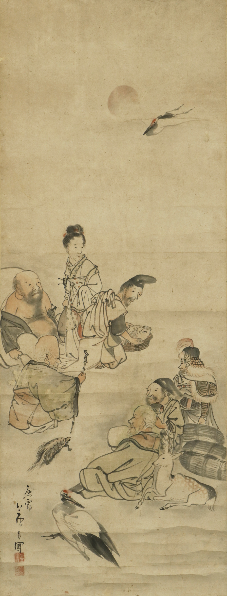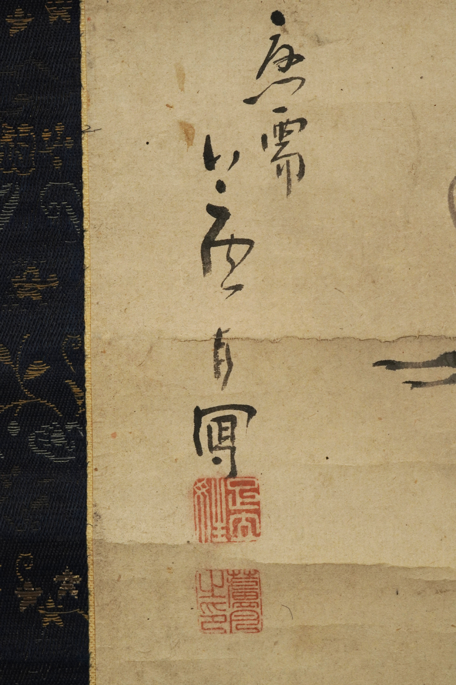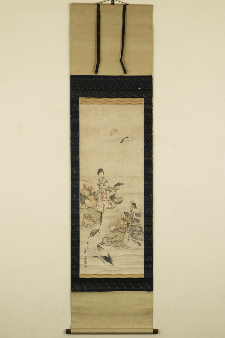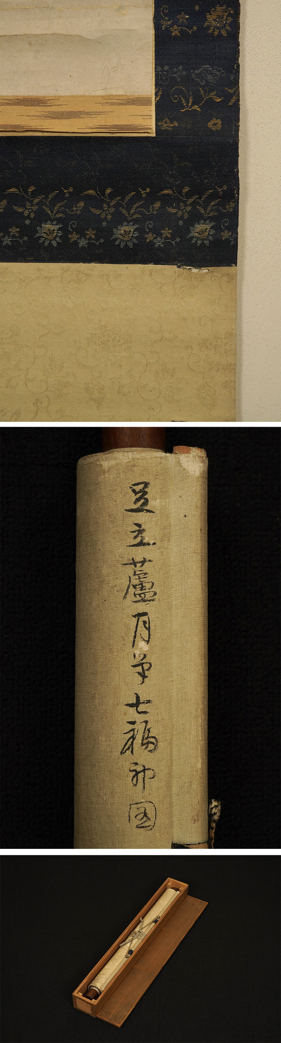 総丈サイズ…横 48 × 縦 192.5 cm 紙本着色・箱入 蘆雪弟子 状態…少オレ・少傷ミ・少虫穴 表具ウキ 【印刷ではありません】 【真作】 足立芦月 絵師。本名を光蔵、字を子謙、号を蘆月と称する。寛政5年氷上郡国領村(現 丹波市春日町国領)足立惣右衛門の次男として生まれる。幼少期より絵を描くことが得意で、日本画の大家だった長沢蘆州の門下に入り頭角を現わす。特に人物・仔犬の絵に優れる。波多沼英や国領の葦原玉斎など多くの師弟も育てる。嘉永4年、58歳没。 |