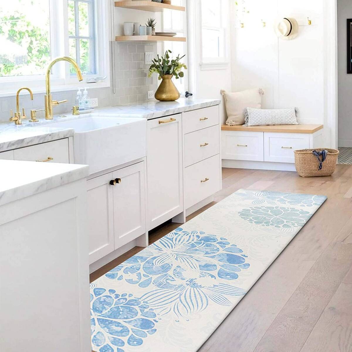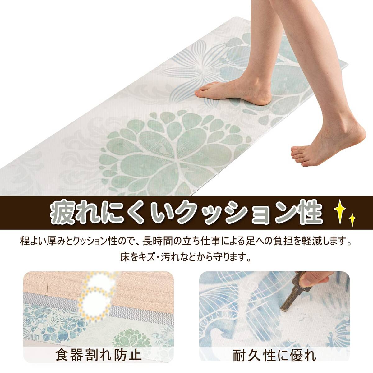 【厚いPVC】 足が疲れにく設計、もちもちの踏み心地でクッション性が高く台所マットです。長時間の立ち仕事も疲れにくい。このマットは素足でも、スリッパを履いたままでもいいです。物が落下しても衝撃を吸収し、床をキズやヘコミから守ります。