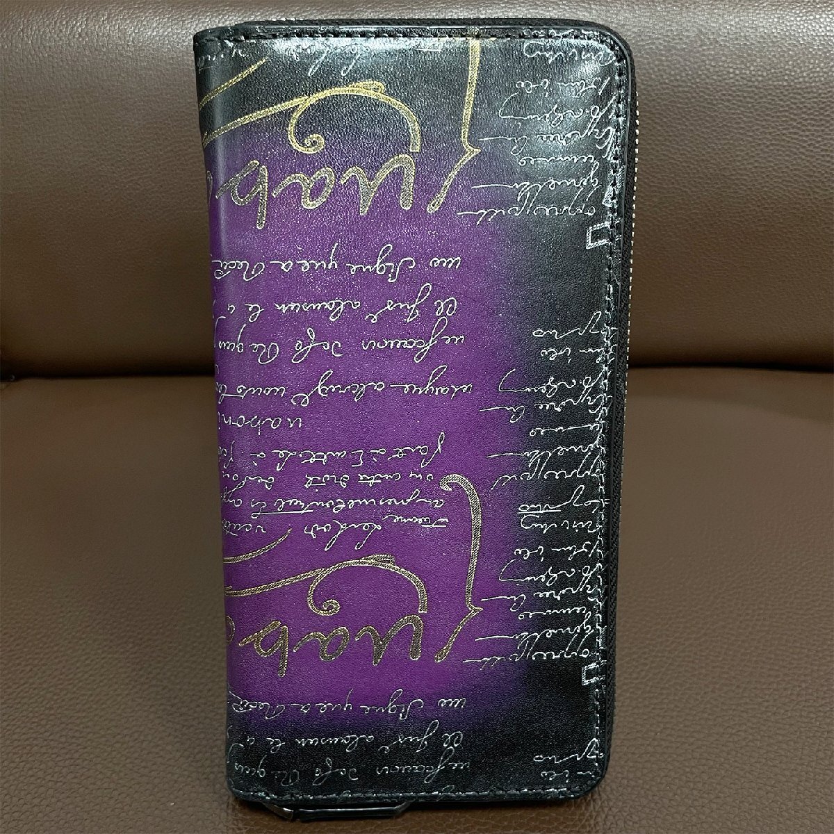 手触り感触が良くアンティーク風な財布と仕上がりました。角の部分は丸みを帯びた設計になっており、全体的にカリグラフィーとゴールデン/シルバーパティーヌがデザインされております。色艶、柔かさに優れていて高級感溢れる逸品となります。