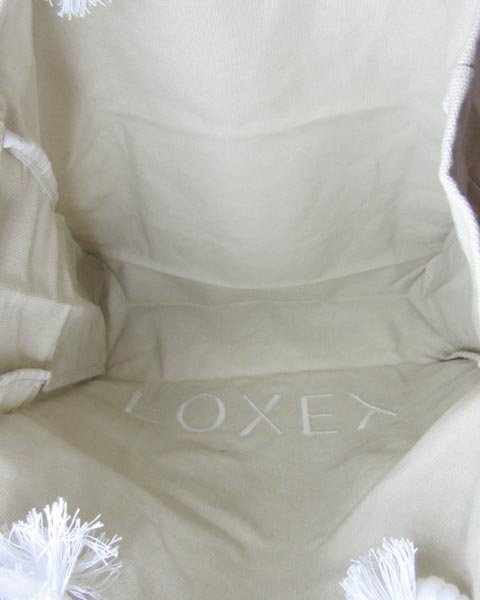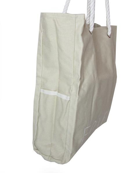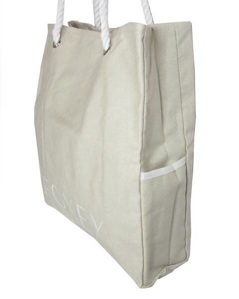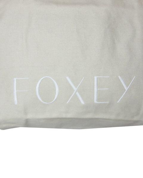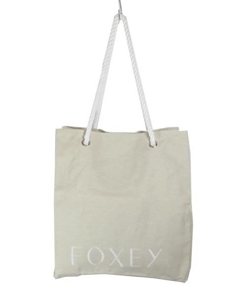 | ベージュと白の上品なトートバッグ。フォクシーの人気ノベルティ。大きなロゴ刺繍が入っていて、ブランドアピールがあります。両サイドにポケットがついています。収納力があります。 |