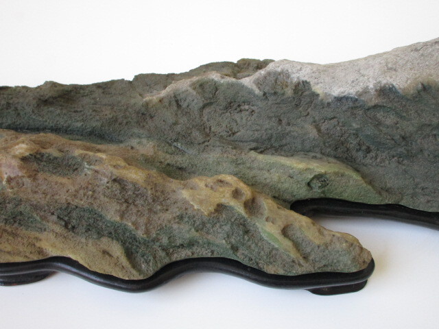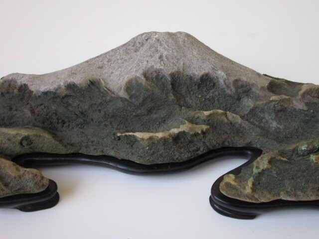 鑑賞石 水石 無形文化財 石の甚五郎作 落款 銘 富士山 台座付 : 最大部分(台座含め) 約 高さ 9cm 横幅 74cm 奥行 18cm 重量(台座含めず) 4.8kg