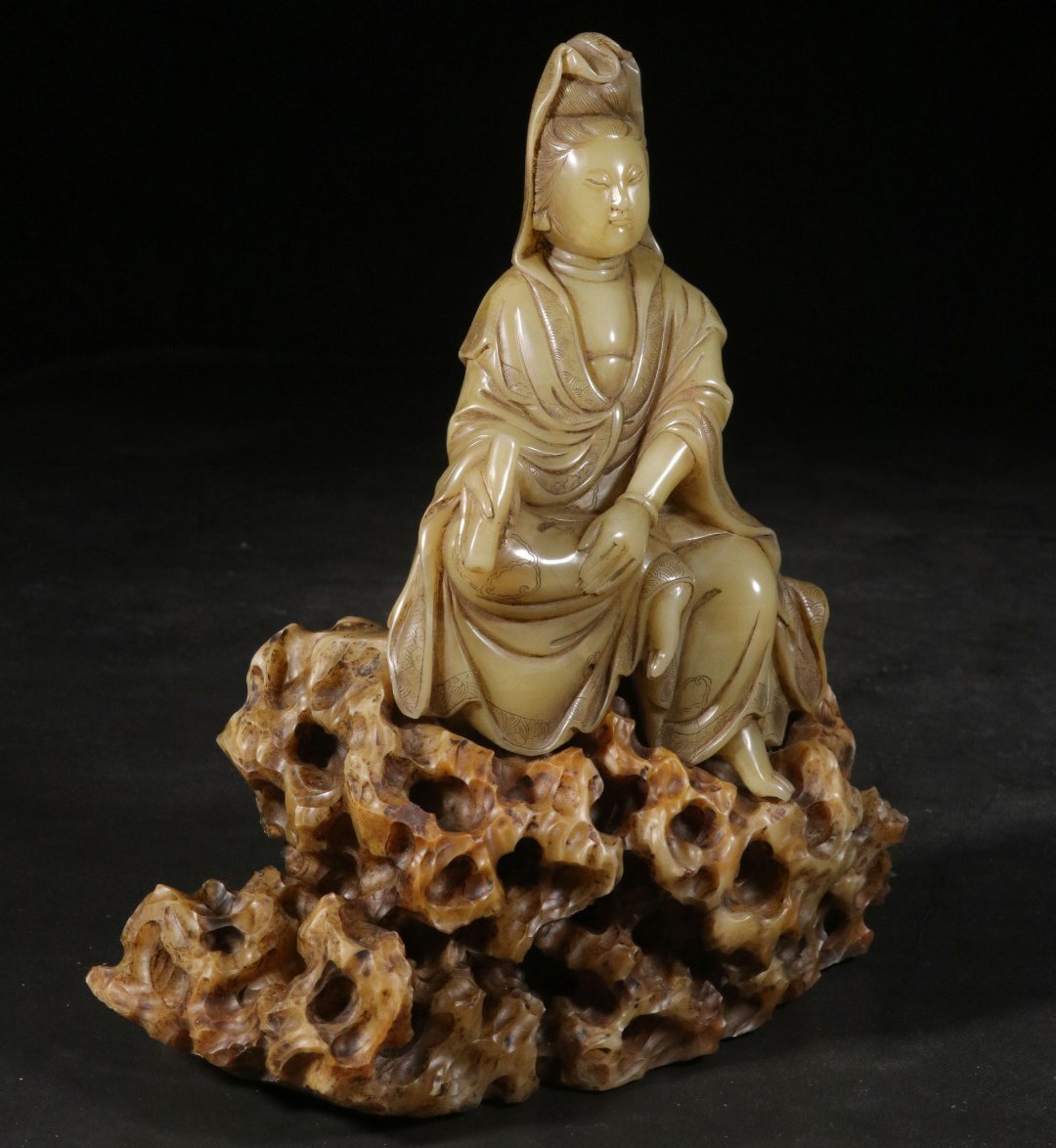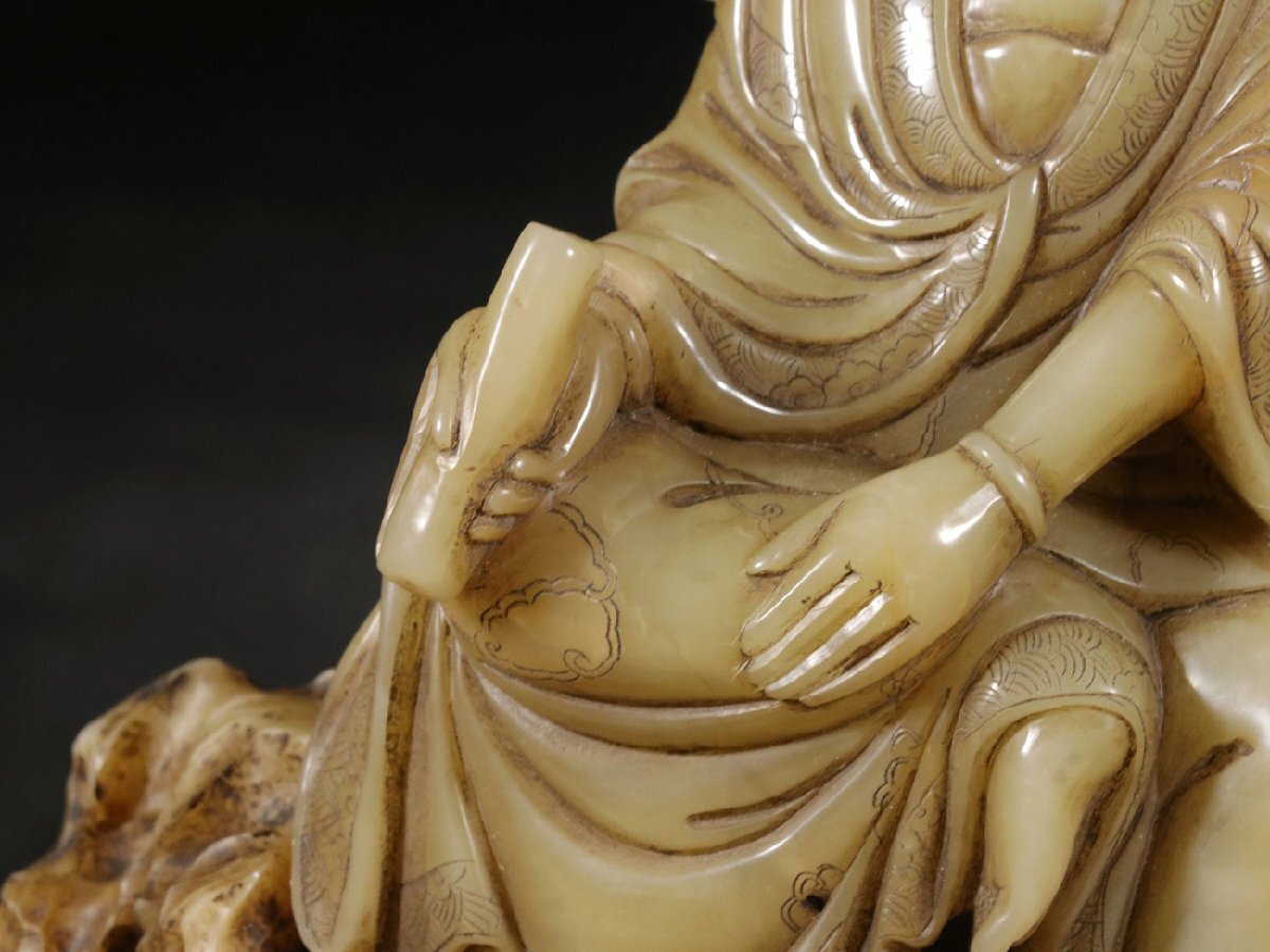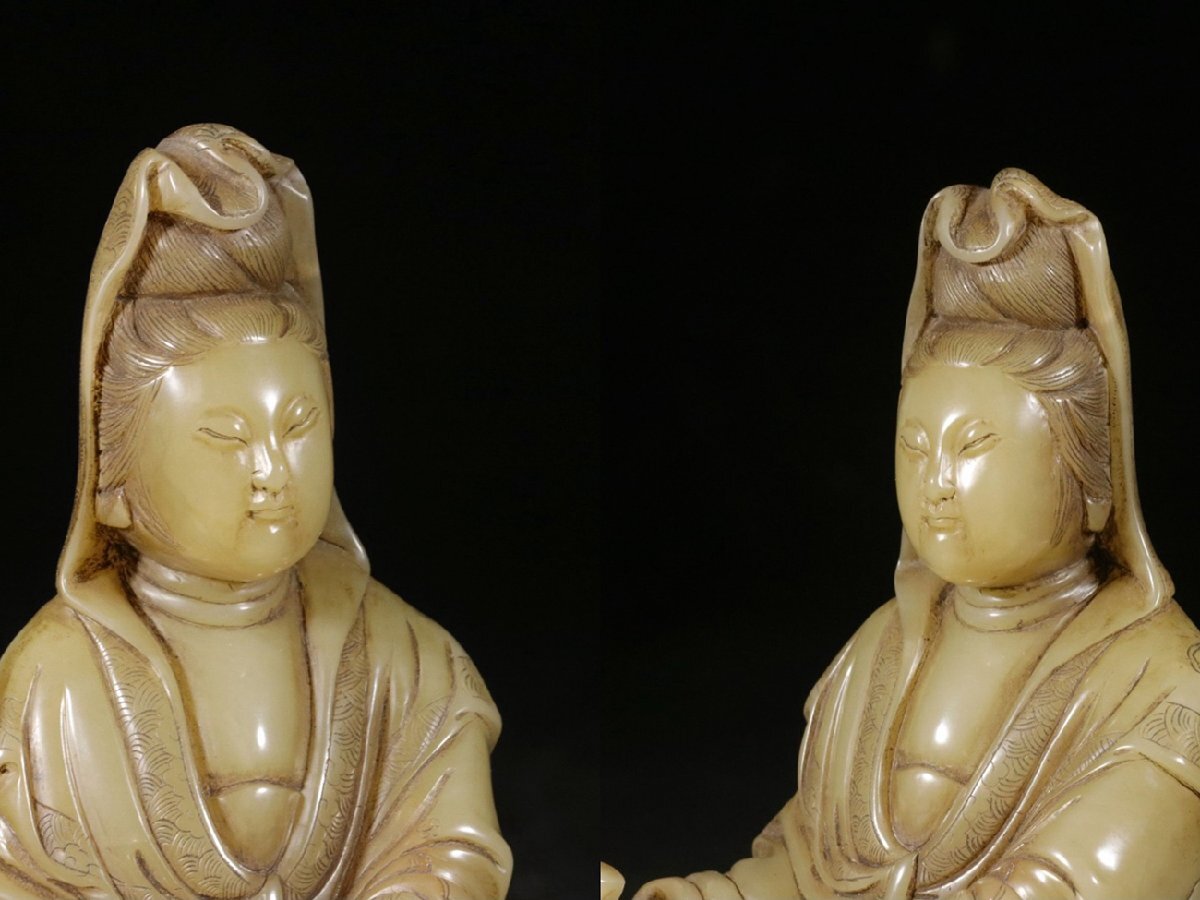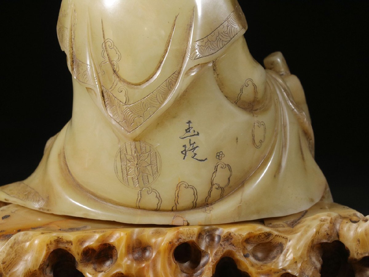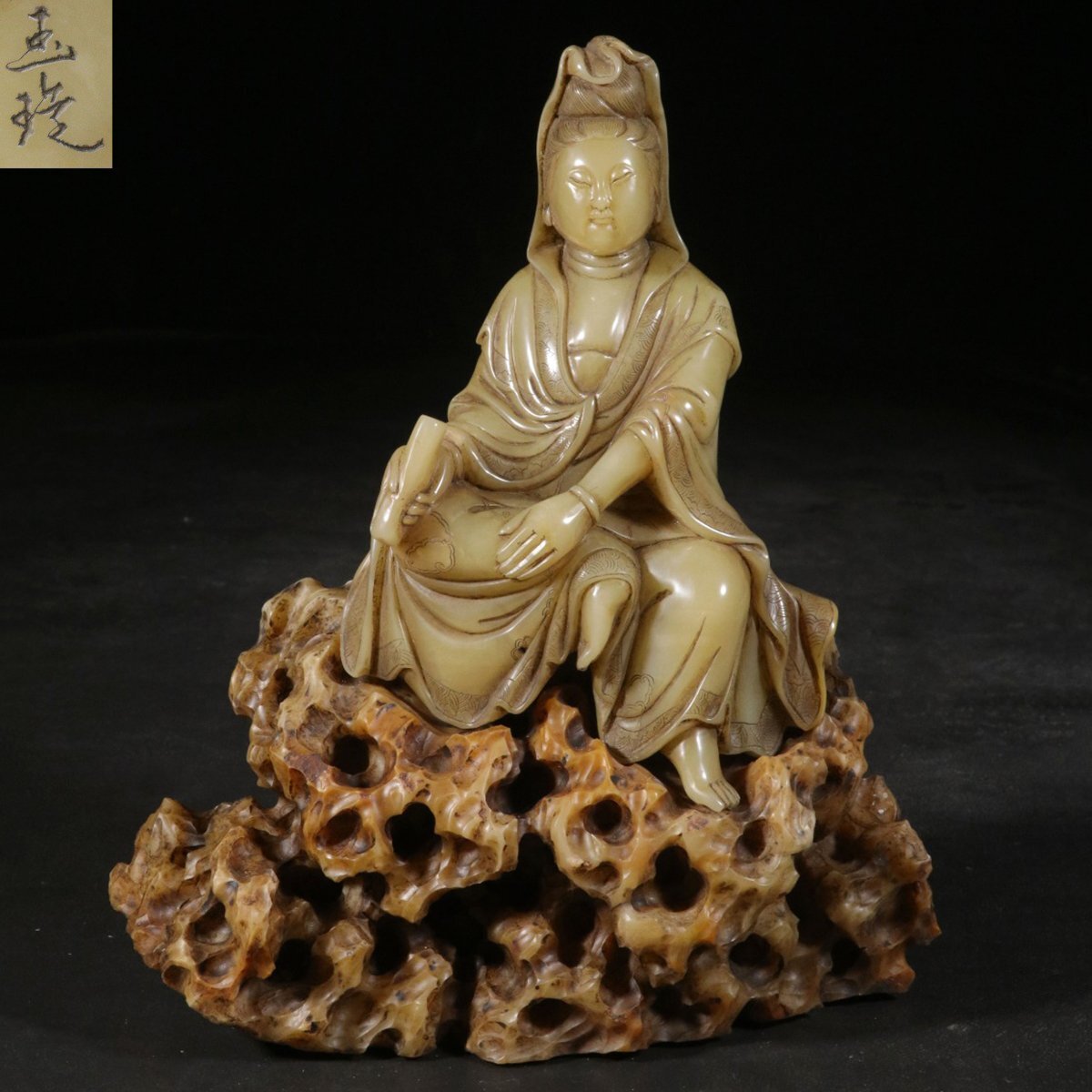 【安】清時代 玉セン銘 寿山芙蓉石彫 自在観音仏像 共箱 極細工 古置物 古擺件 中国古美術 古美味 時代物 331 サイズ(約寸) |