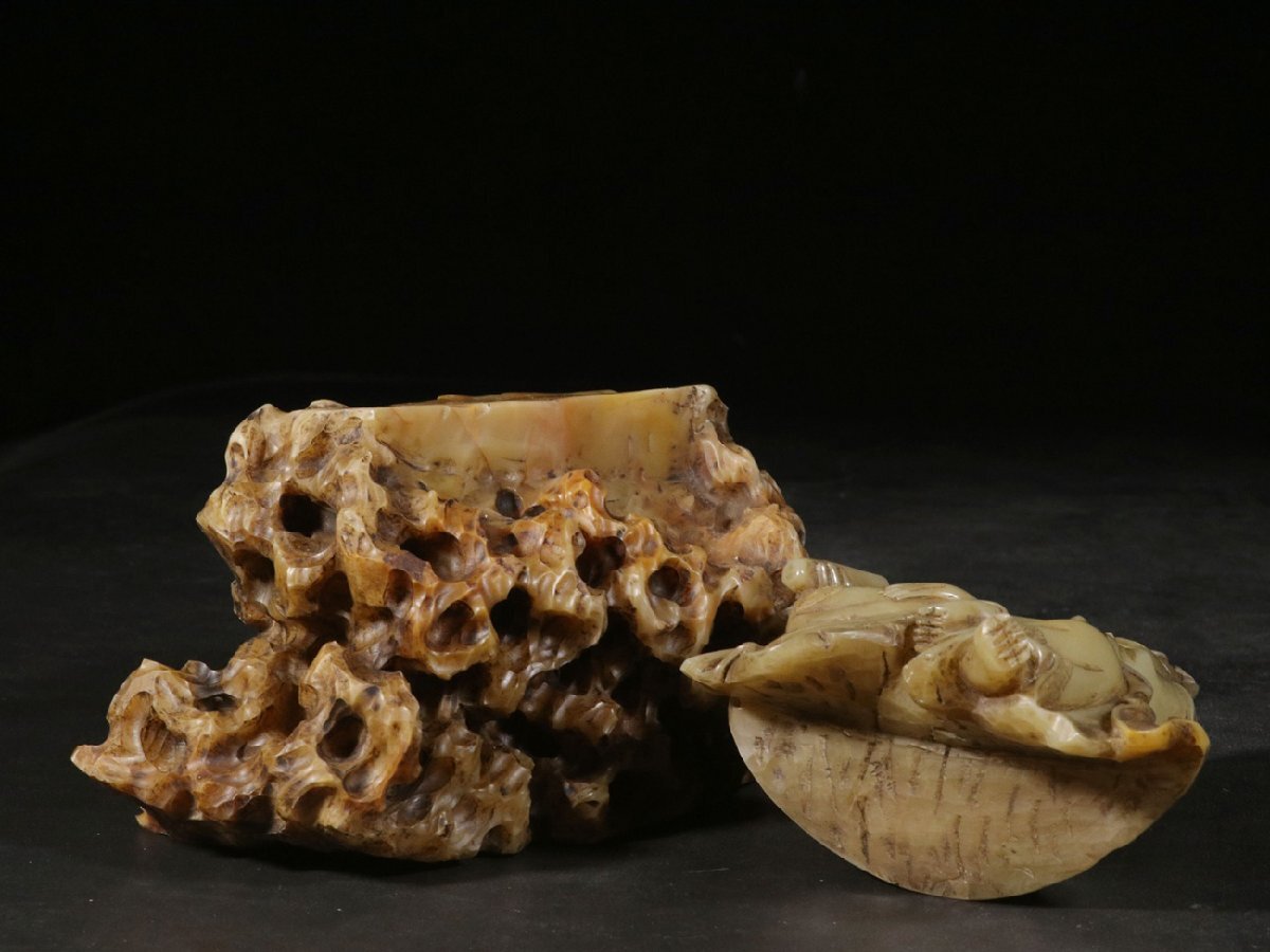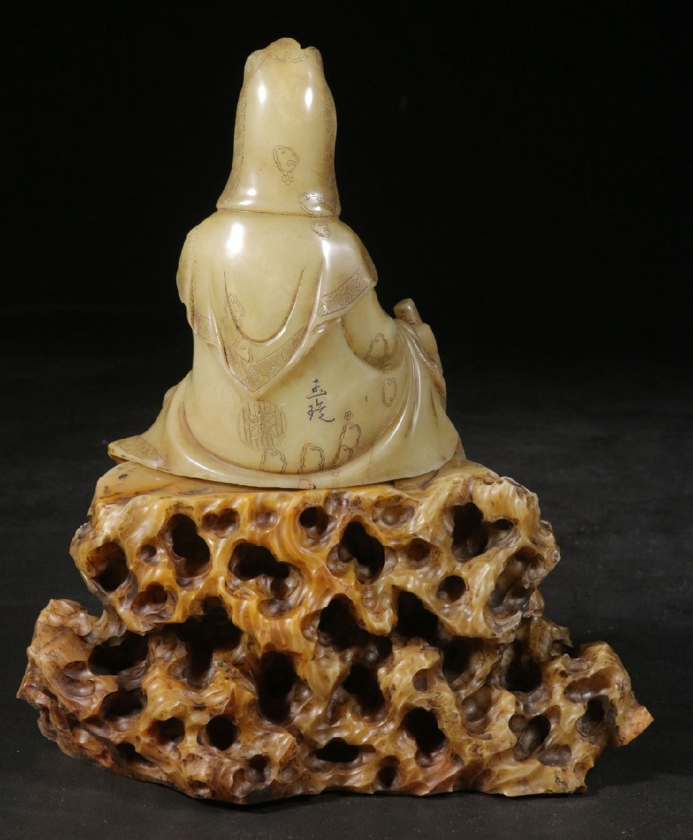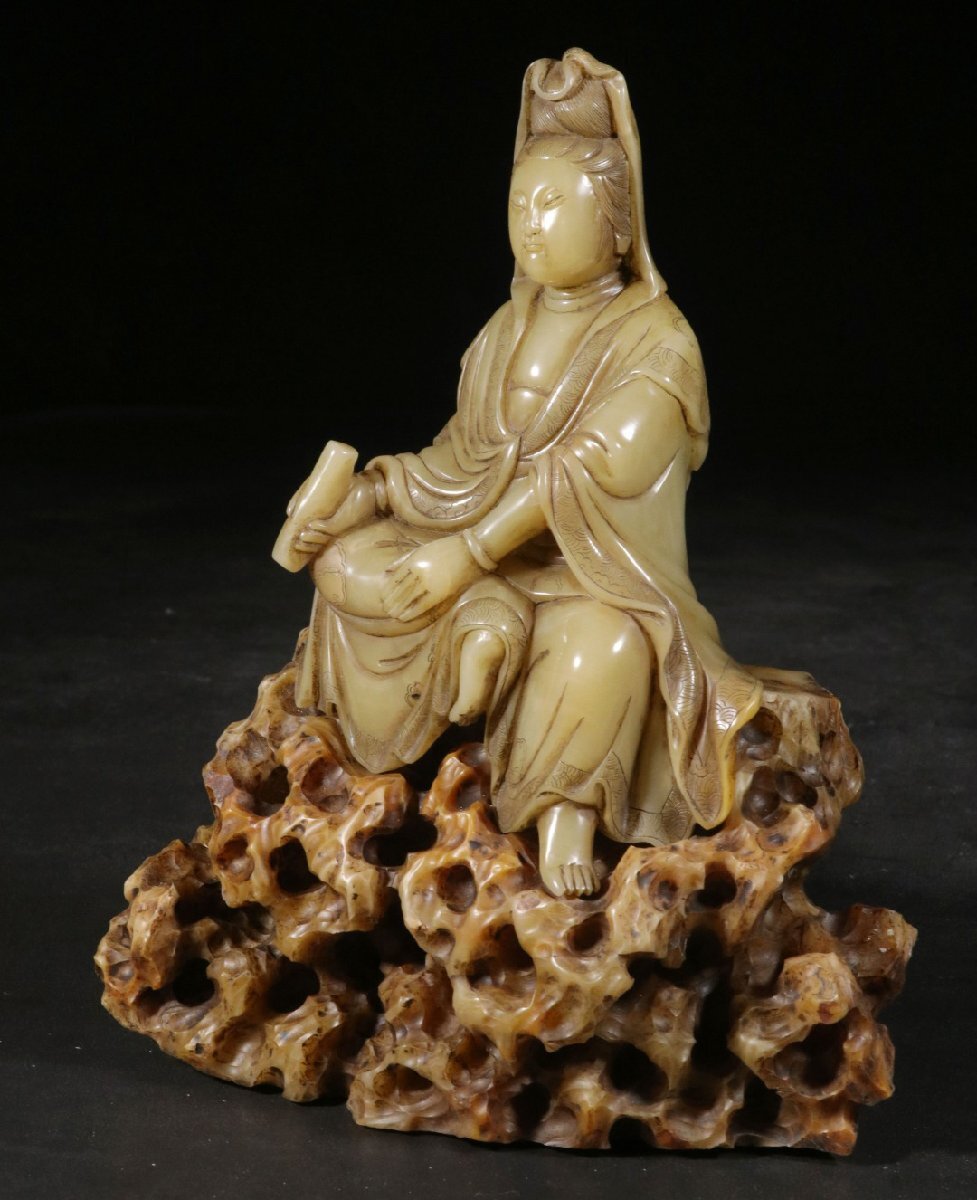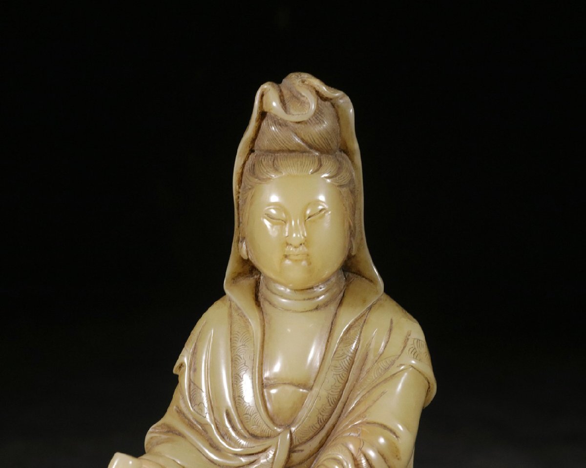 【安】清時代 玉セン銘 寿山芙蓉石彫 自在観音仏像 共箱 極細工 古置物 古擺件 中国古美術 古美味 時代物 331 サイズ(約寸) |