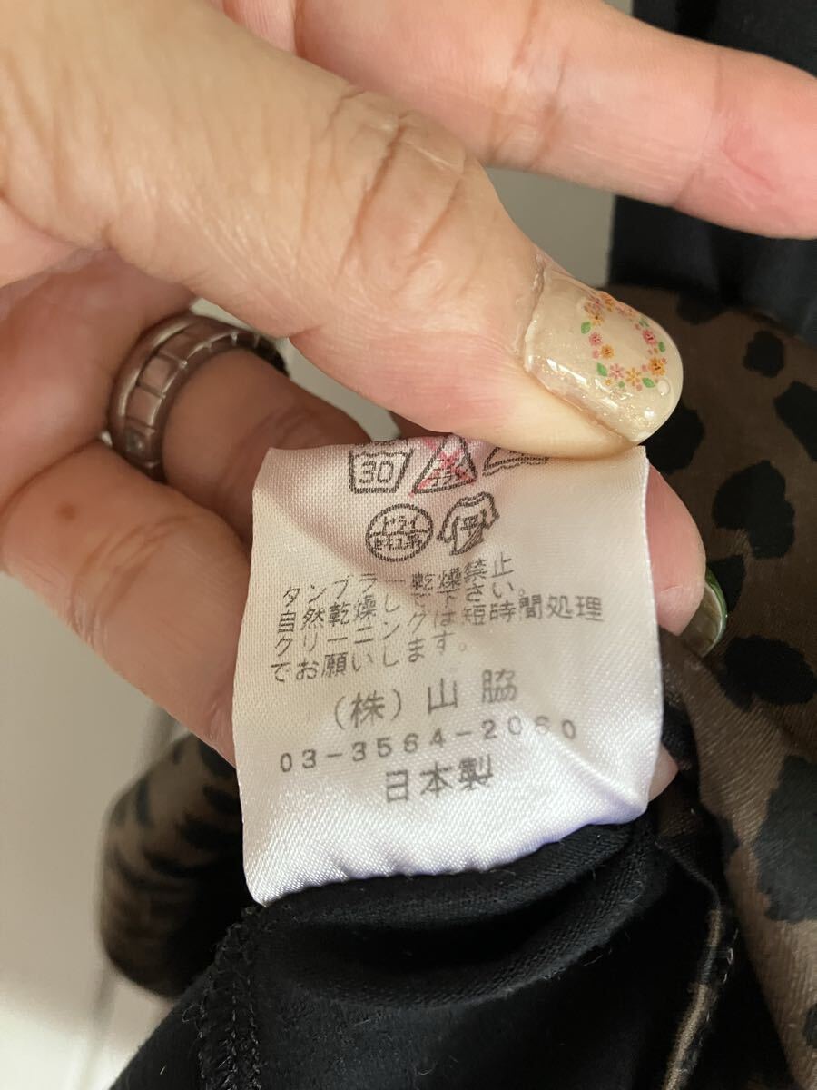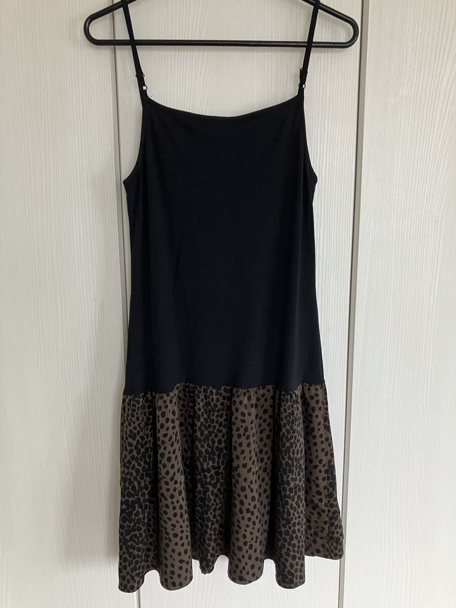 キャミソールタイプのワンピースです。上半身は黒無地、スカート部分はヒョウ柄(レオパード柄)になっています。1枚でさらっと着ていただけます。