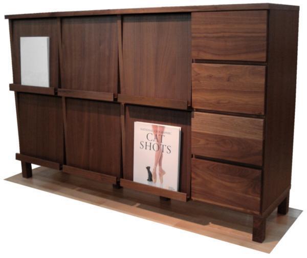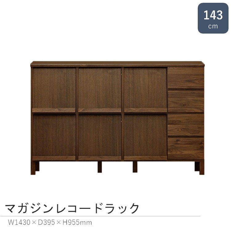 天然木ウォ―ルナット材の高級感ある素材感に包まれたマガジンレコードラックラック。新仕様となり、本や雑誌に加えてレコードが収納できます。本体、塗料を含めてホルムアルデヒドの発生を極力抑えたF☆☆☆☆仕様、人体や環境に優しい安心の日本製品です。雑誌等を飾った間ままスムーズに開閉するフラップ扉、丈夫な箱組み引き出し等、実用的かつシンプルで飽きのこないデザインです。