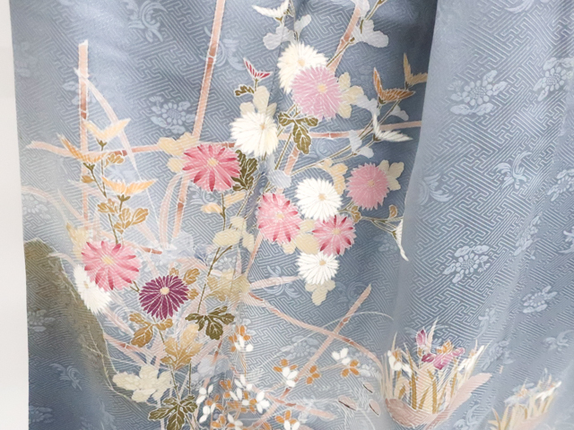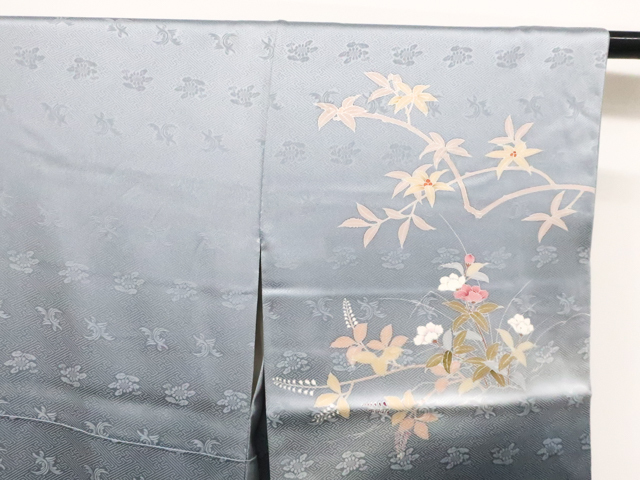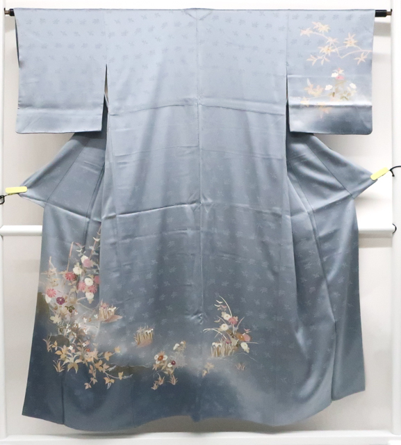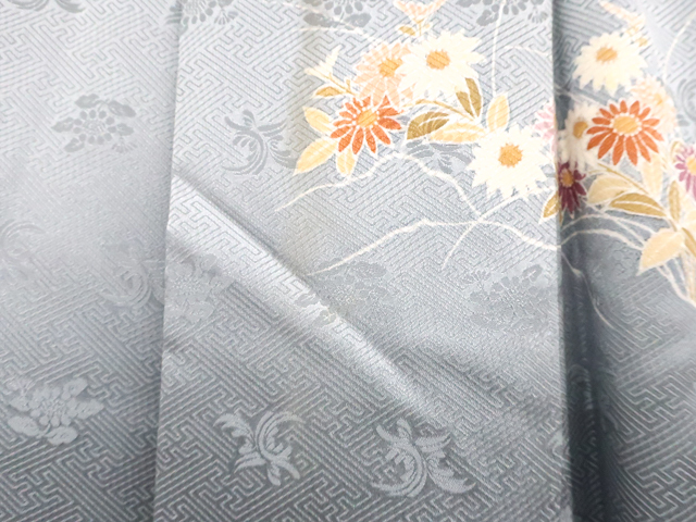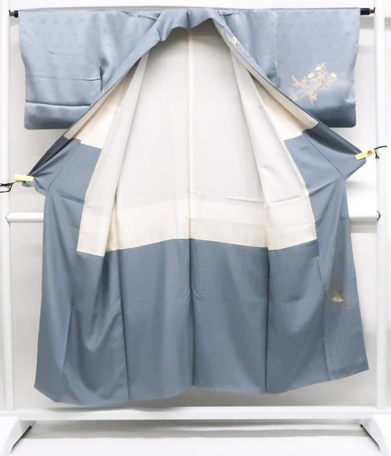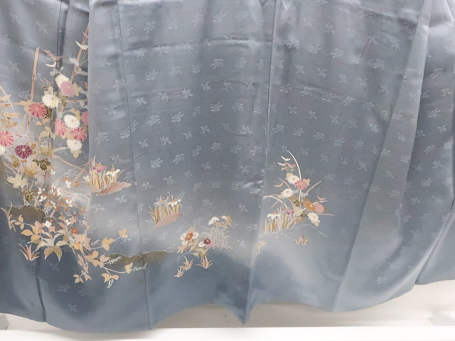 リサイクル商品のため、所々しみ汚れがございます。 袖口汚れがございますが着用可能なお品です。 地色は灰青です。 1枚目の画像が近いお色かと思われます。 素材は正絹です。 |