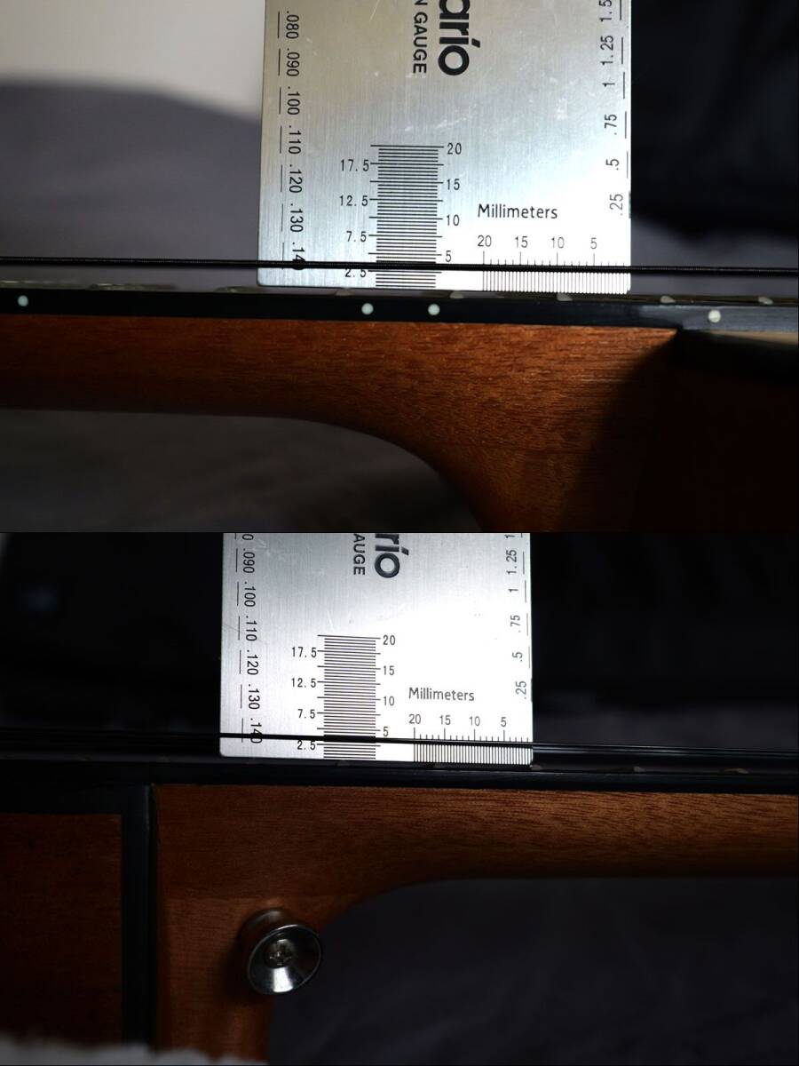 ■12F上の弦高は1弦で約3mm、6弦で約3mmです。