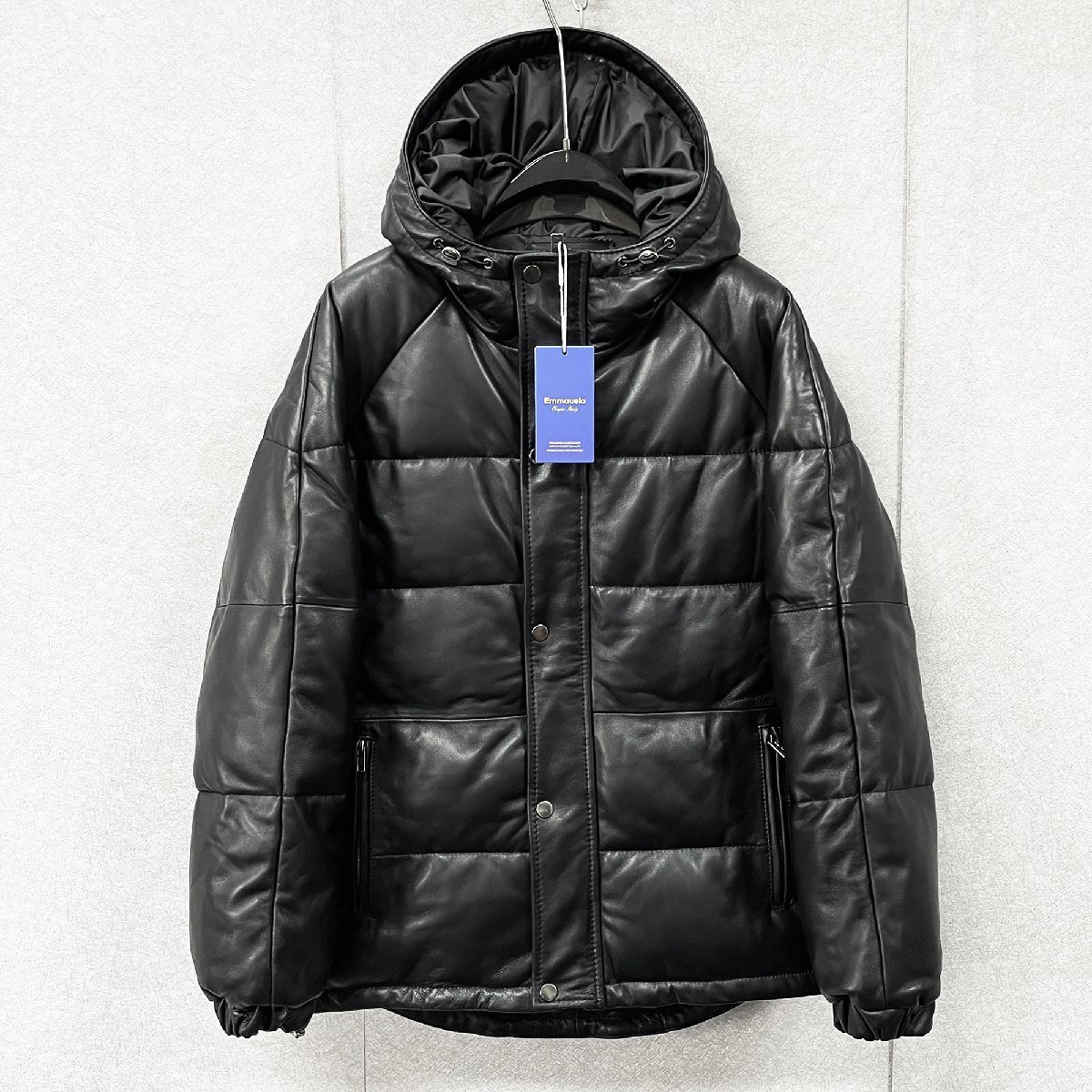 絶賛・レザー・ダウンジャケット 定価15万◆Emmauela・イタリア・ミラノ発◆上級羊革 防寒保温 厚手 無地 本革 ライダース アウトドア2XL/52サイズ