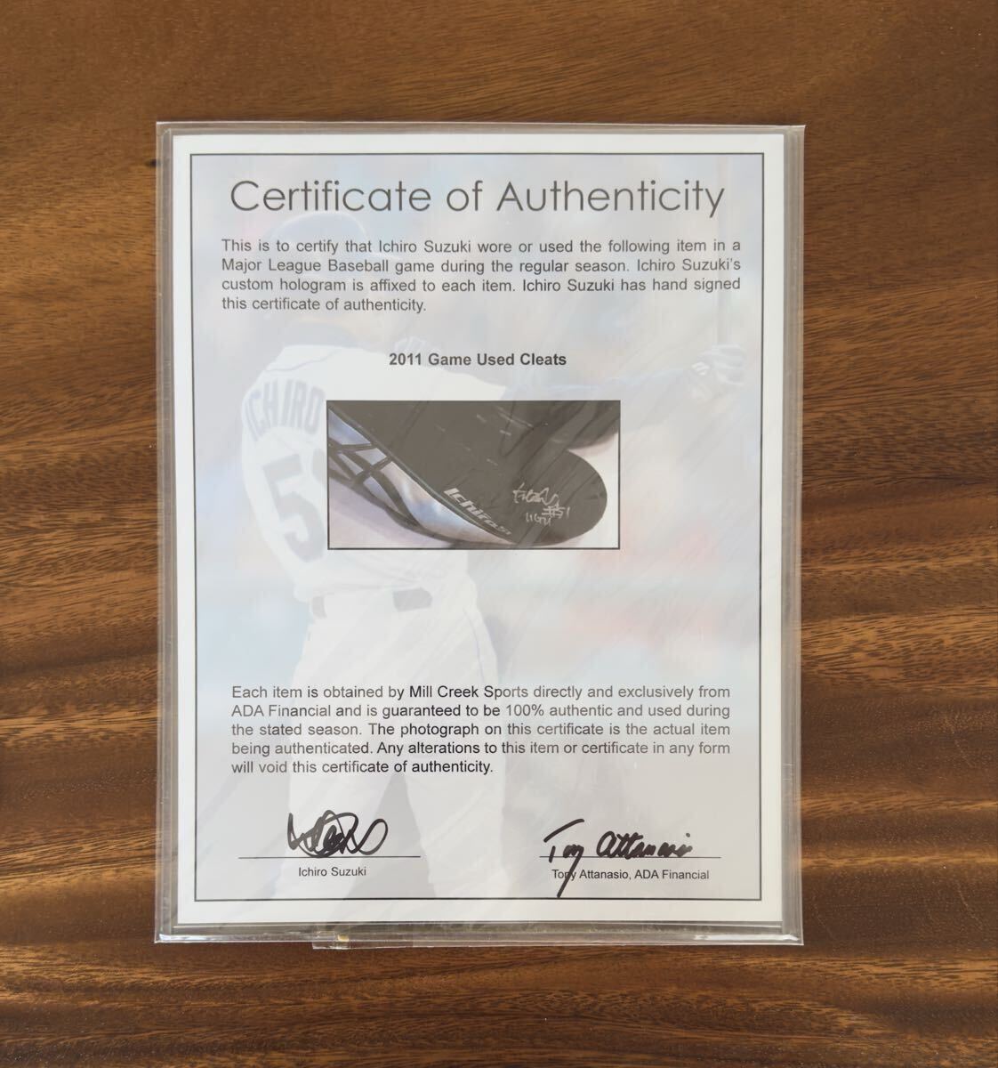 右スパイク部分にイチロー選手直筆サインと実使用11GUの書き込みがあり、証明書にイチロー選手の直筆サインが書かれています。