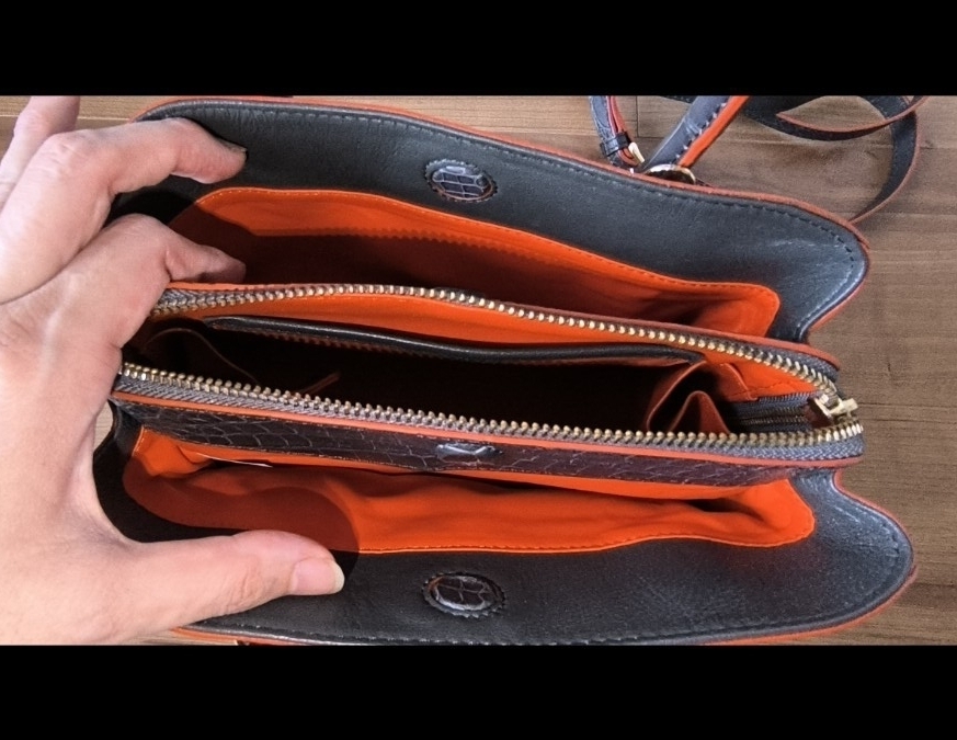 -内側 大きく3つに分かれていて中央はファスナーポケット、その内側にはオープンポケット×1とファスナーポケット×1があります