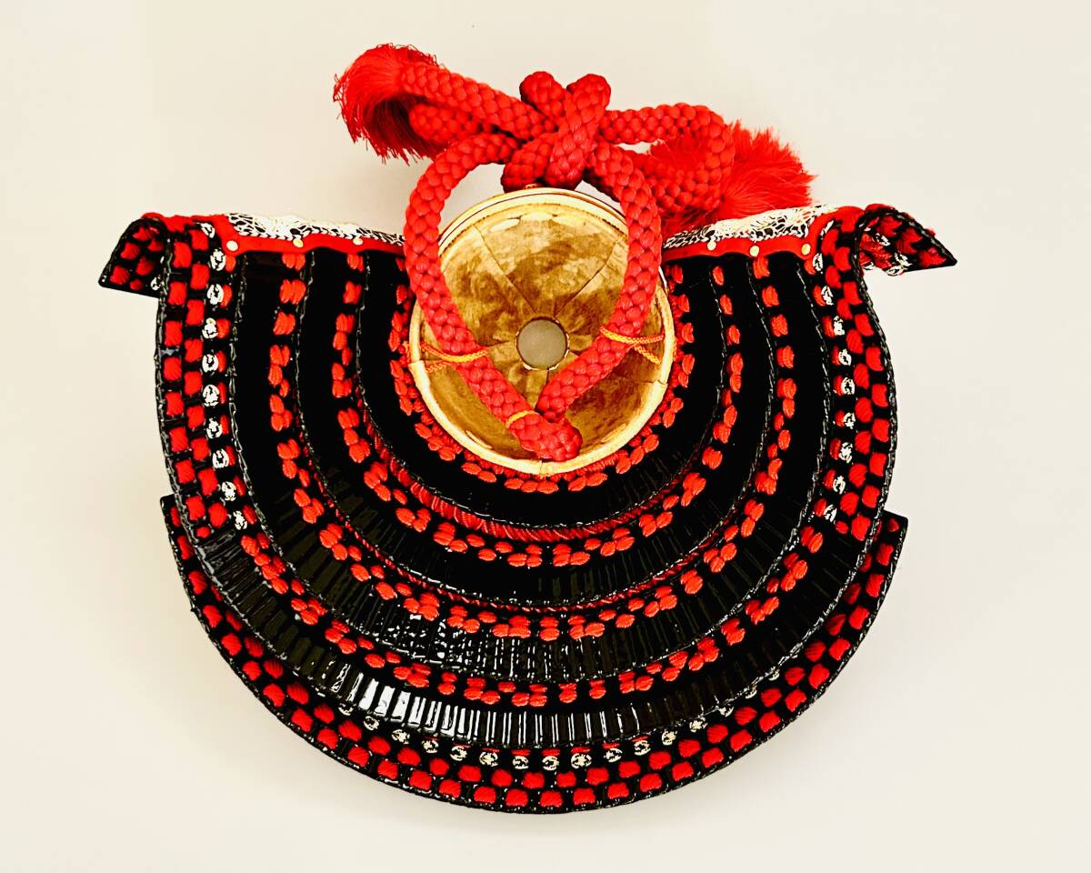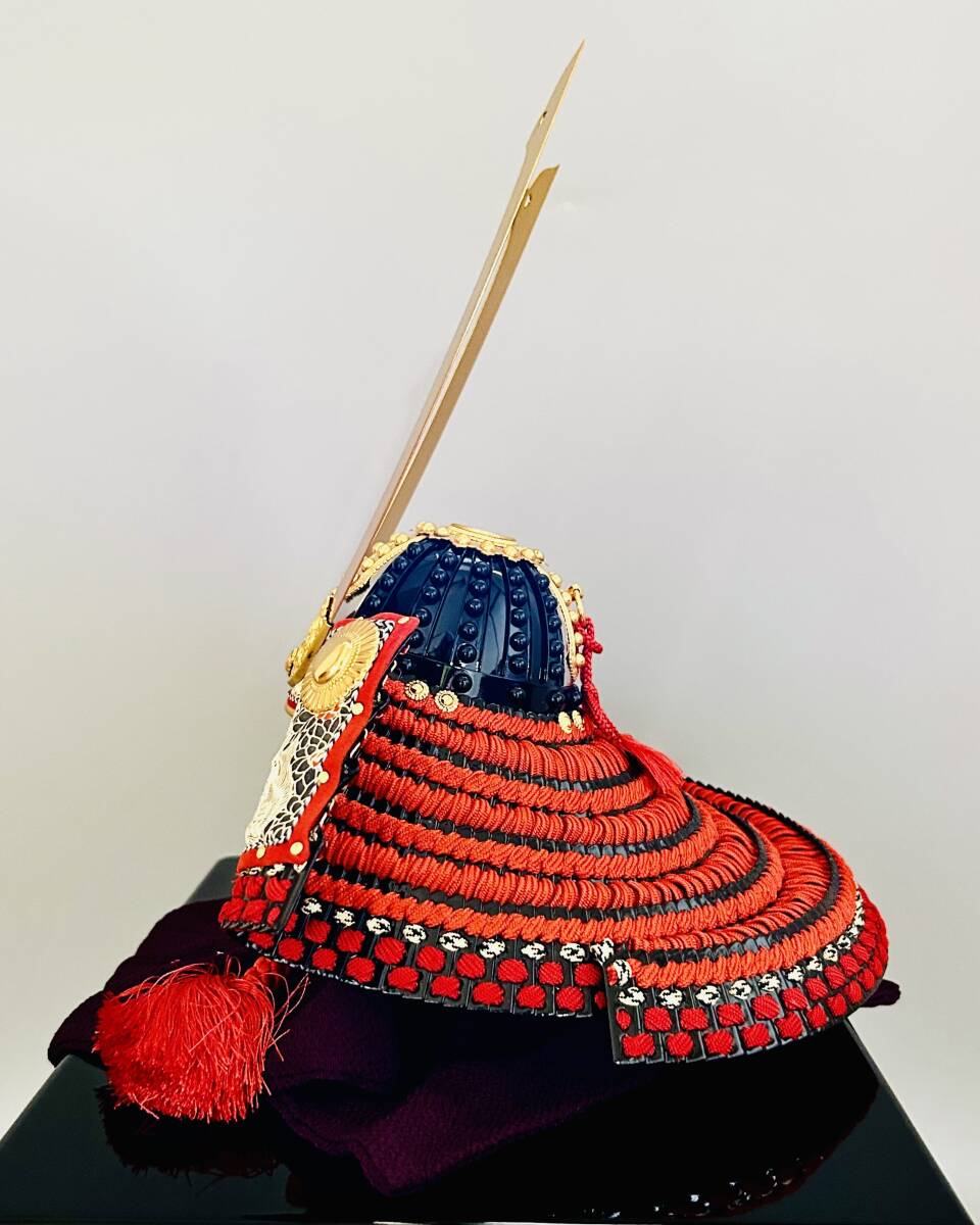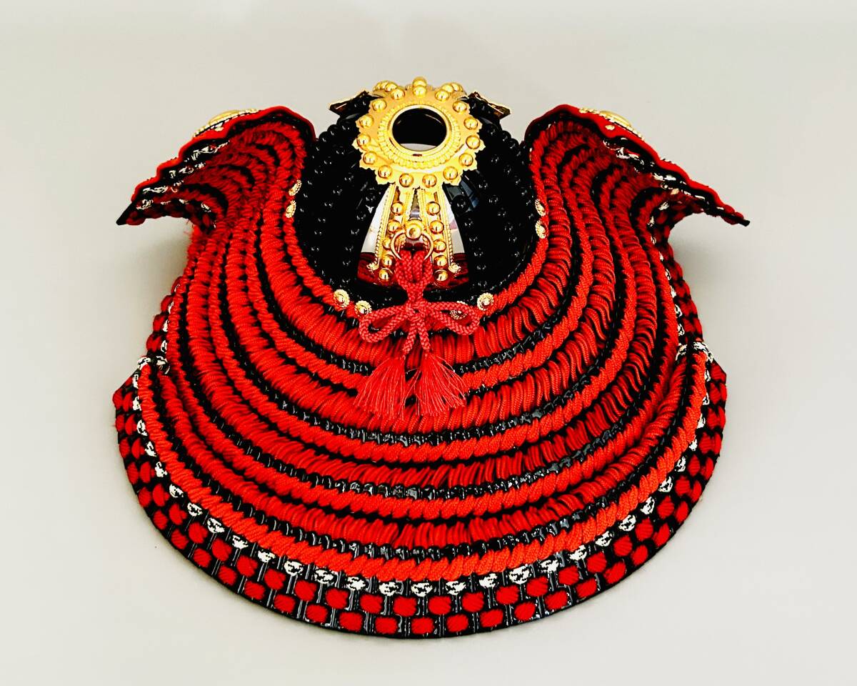 日本甲冑式具研究保存会会員 加藤峻厳 作「正絹赤糸威長鍬 三分ノ一兜」となります。