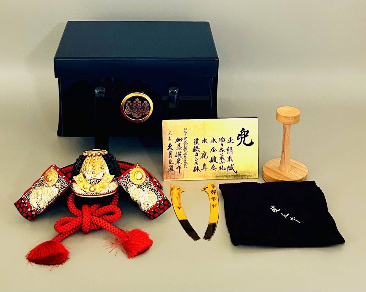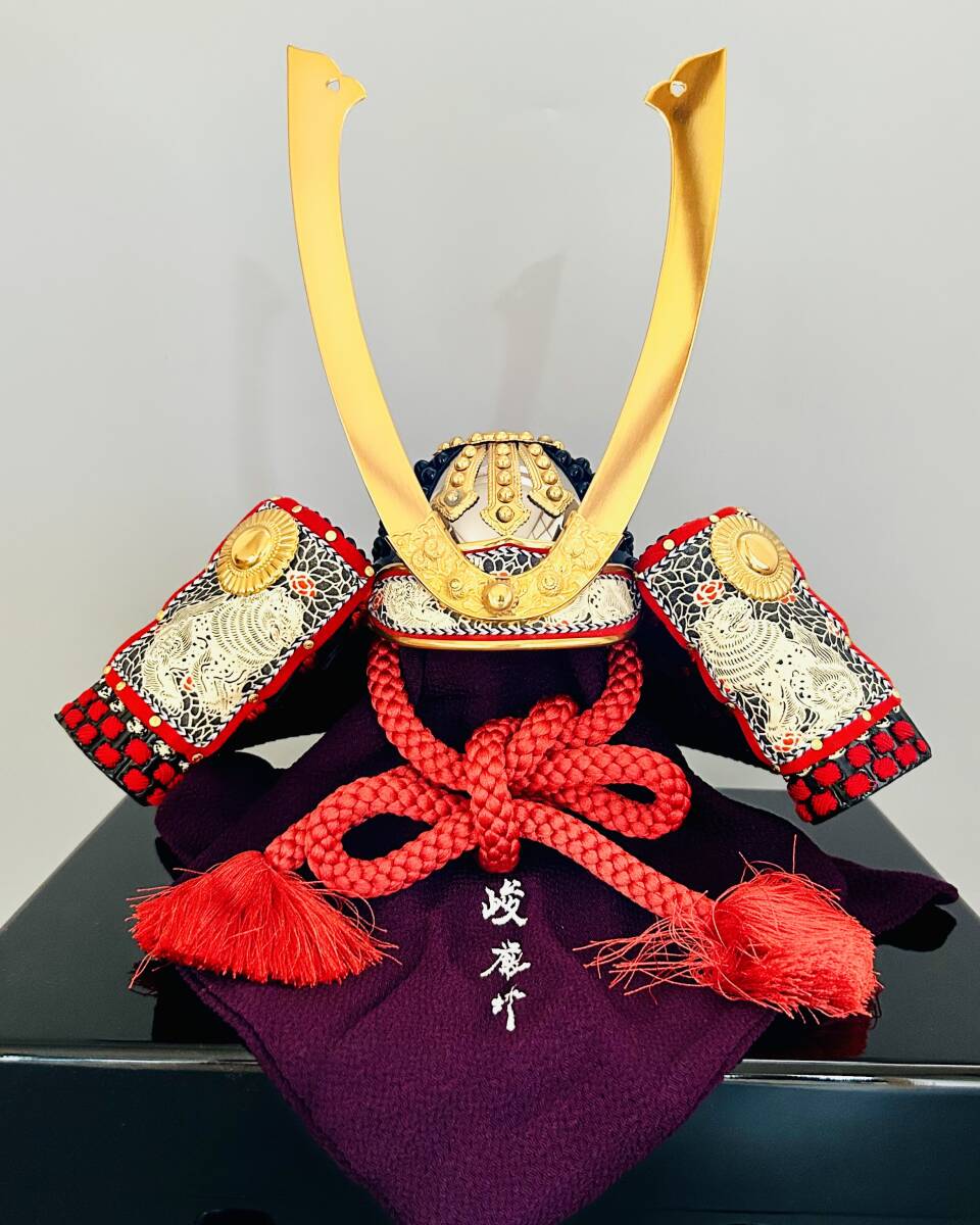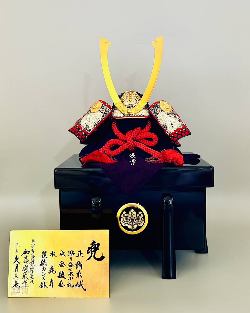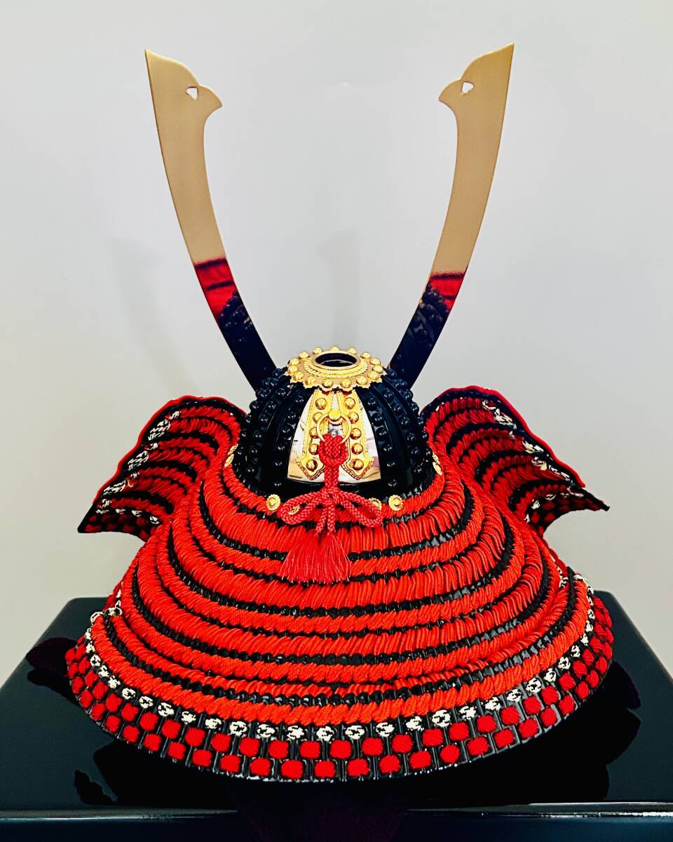日本甲冑式具研究保存会会員 加藤峻厳 作「正絹赤糸威長鍬 三分ノ一兜」となります。