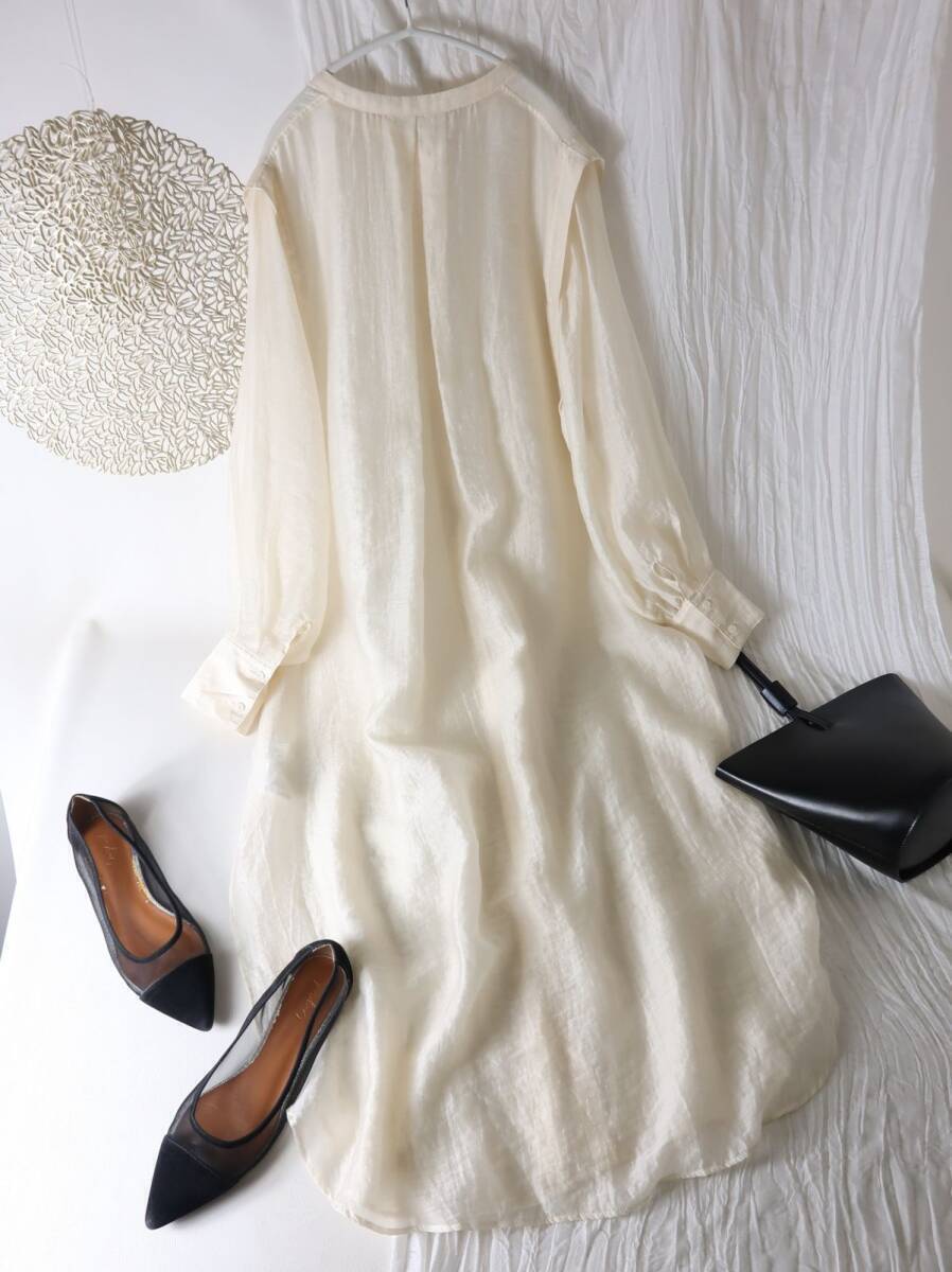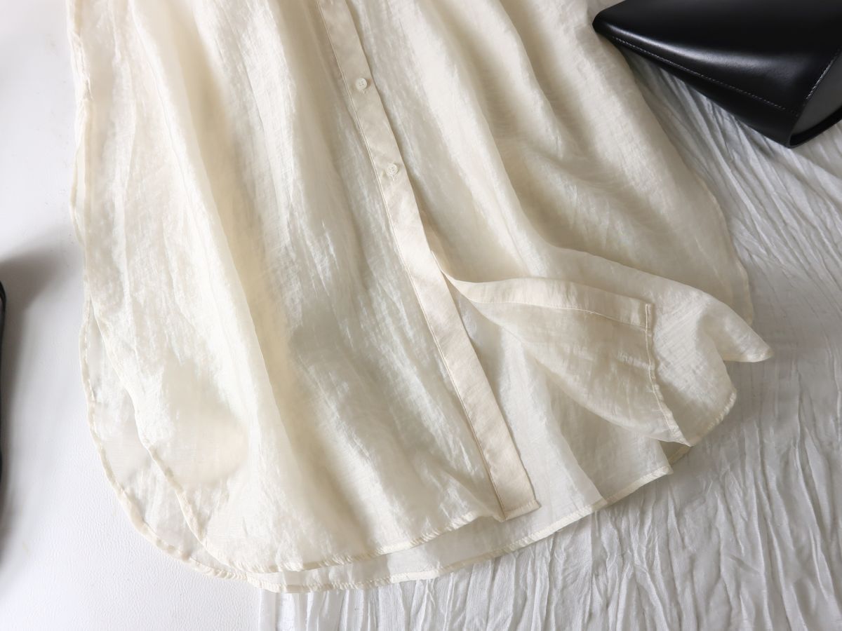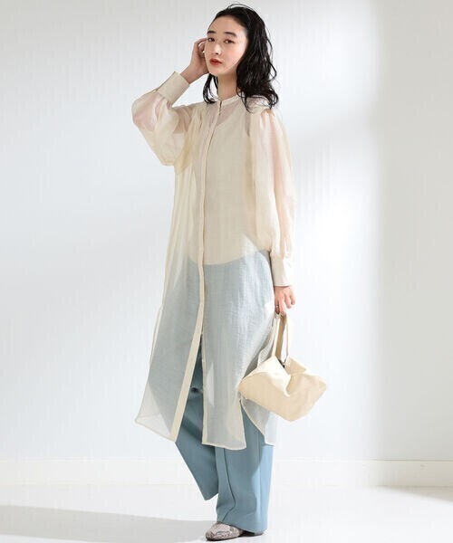 羽織るだけで女性らしさをプラス透け素材のロングシャツワンピース。全体的にシアー感のある素材で仕上げており、女性らしい雰囲気を演出します。さり気なく肩にタックを入れ、パワーショルダーとボリューム袖もポイントのデザイン。柄ボトムにTシャツをインして、その上からさらっと羽織るコーディネートがおすすめ。さらに、その上からベルトでウエストマークをするスタイルもおすすめ◎