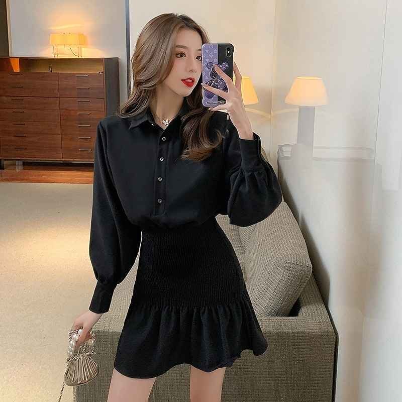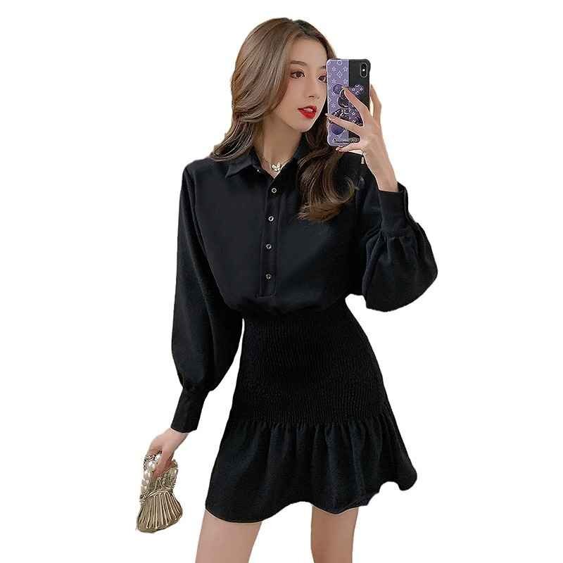 長袖ワンピース フリルワンピ ミニワンピ ギャザー カジュアル かわいい 無地 秋冬 S ブラック