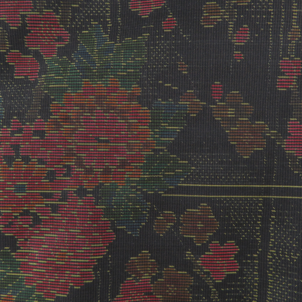 | 紬 着物 格子に花々模様 黒色x黄色x多色 袷 バチ衿 絹 仕立て上がり着物 身丈157cm |