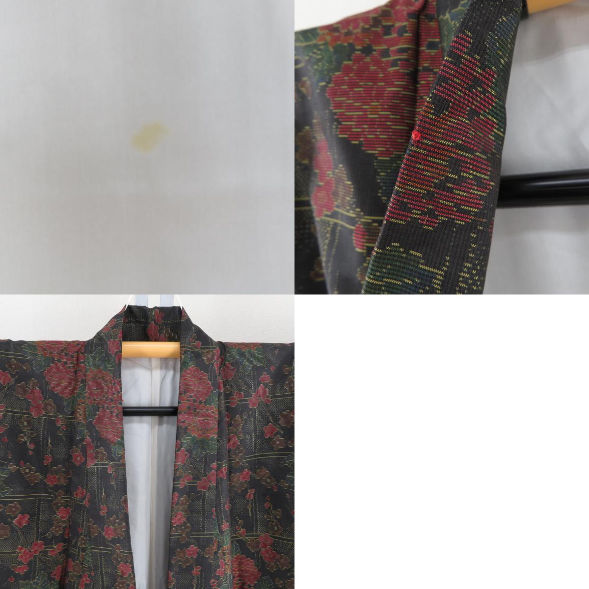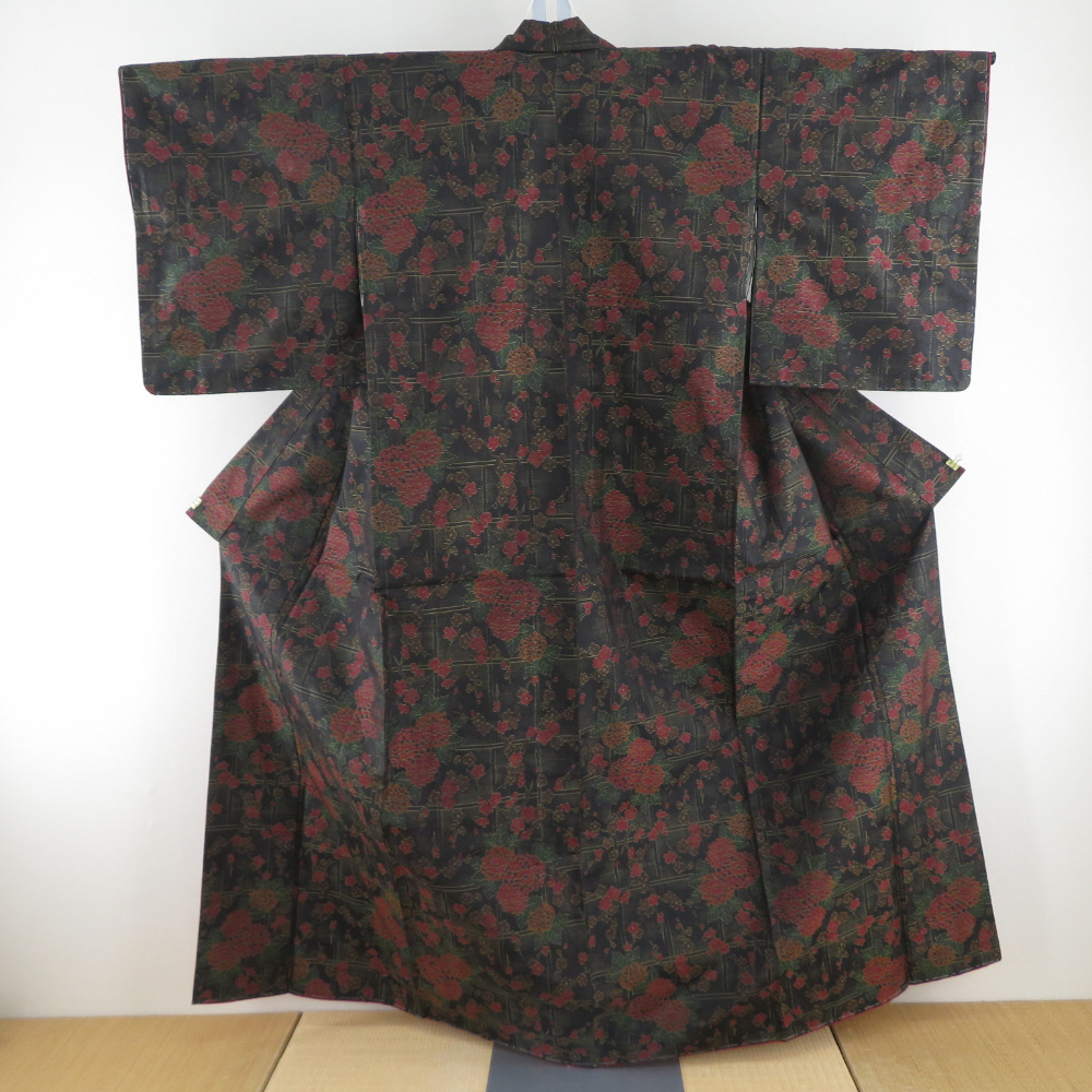 | 紬 着物 格子に花々模様 黒色x黄色x多色 袷 バチ衿 絹 仕立て上がり着物 身丈157cm |