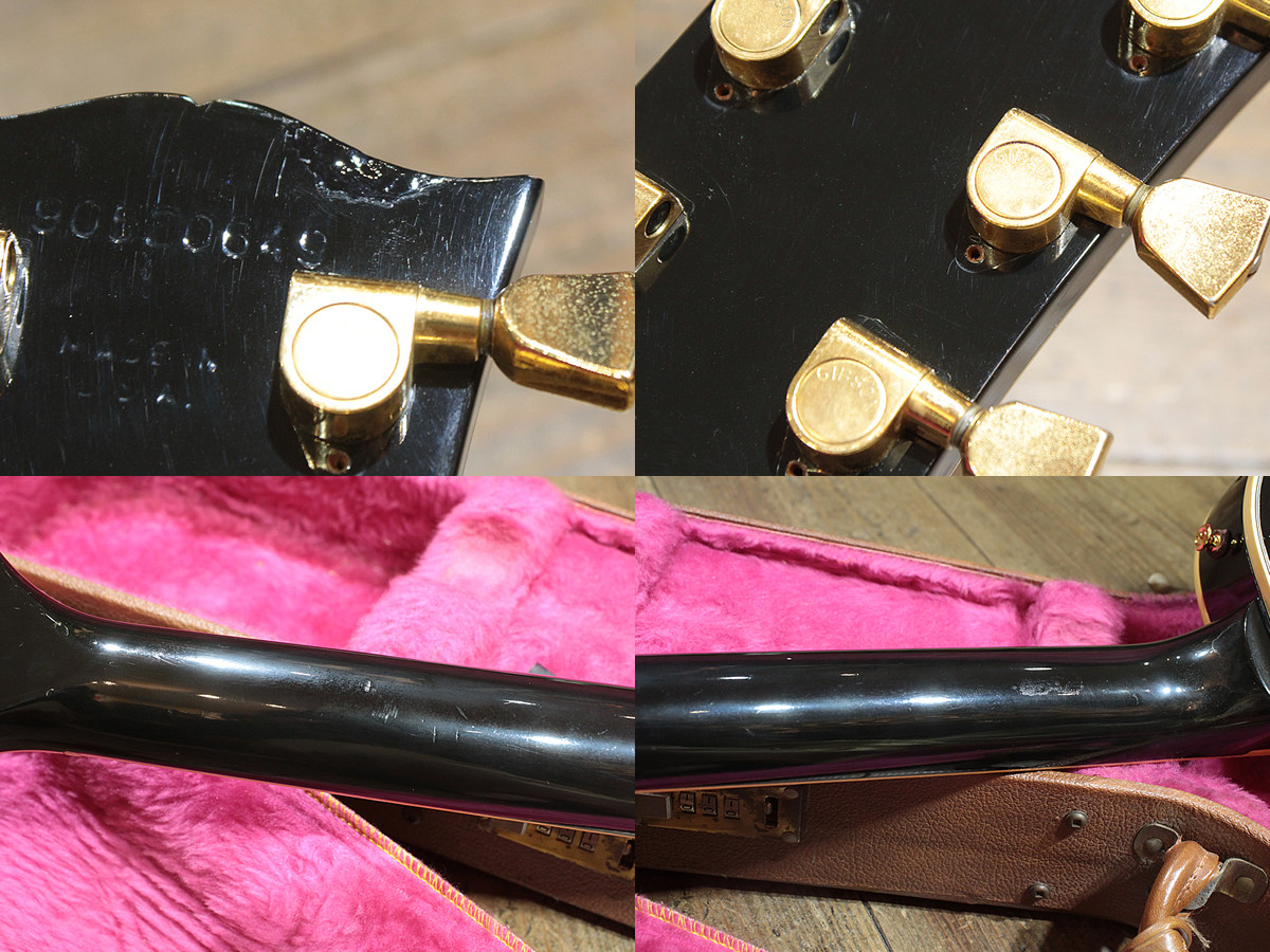 小キズ打痕など使用感はそれなりにあります。タッチアップ痕があり、光に当ててみると分かりますが、パッと見は分かりづらい程度です。ペグは交換されており、元のビス穴が残っております。付属のブラウンケースはお布団が分厚い90年代のやつです。