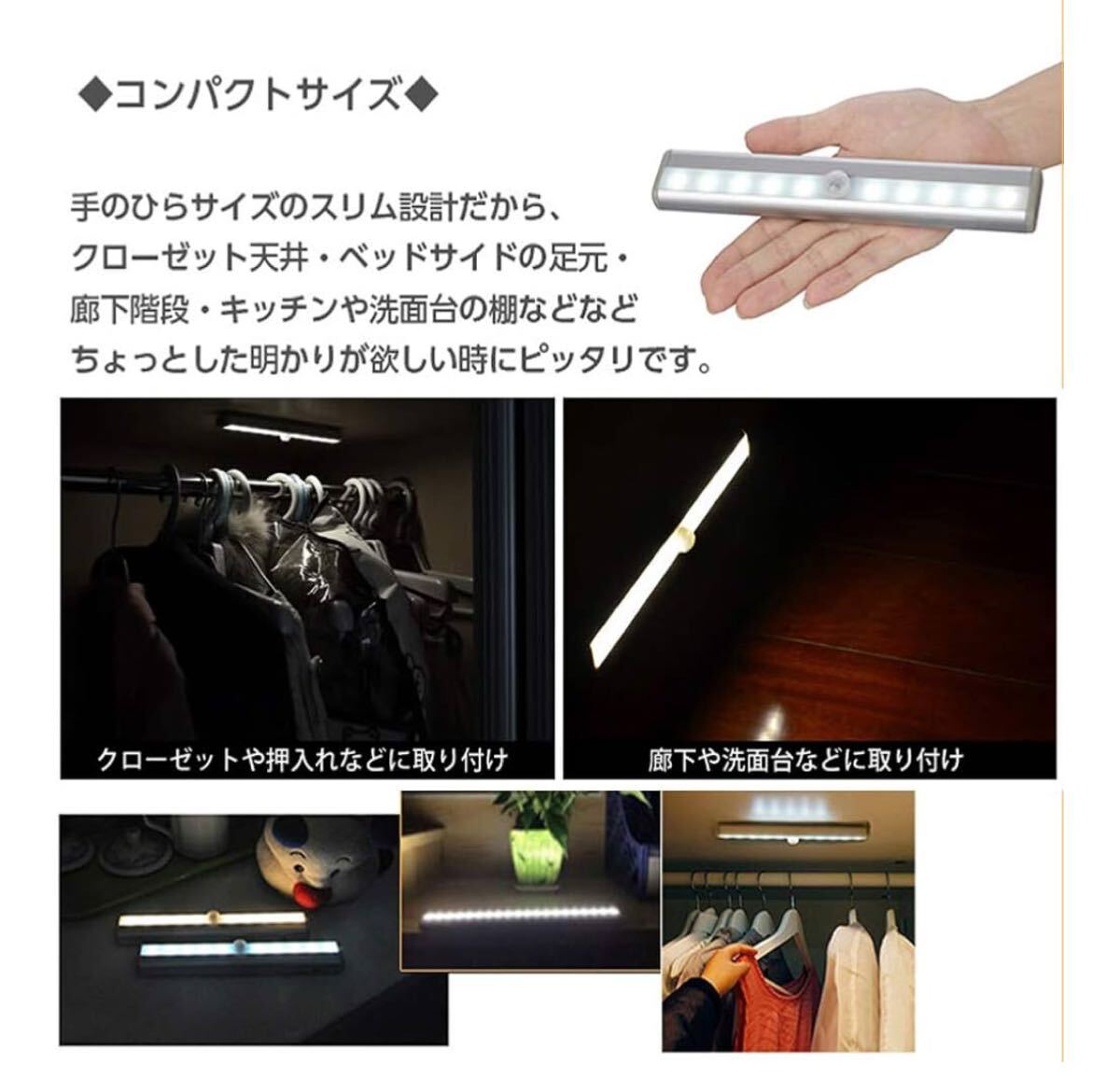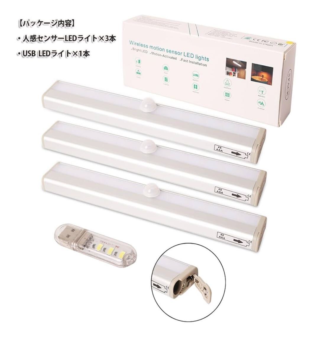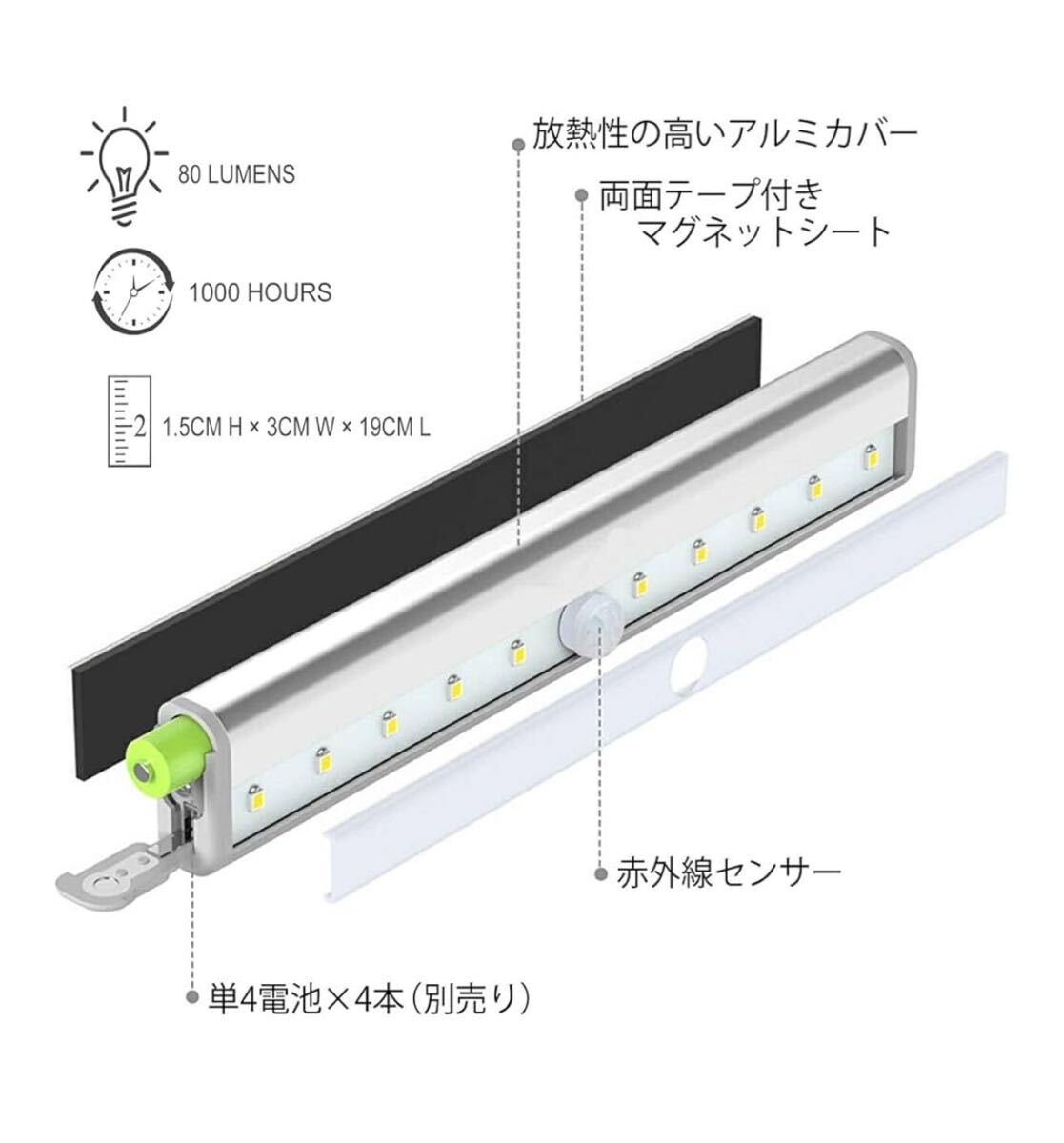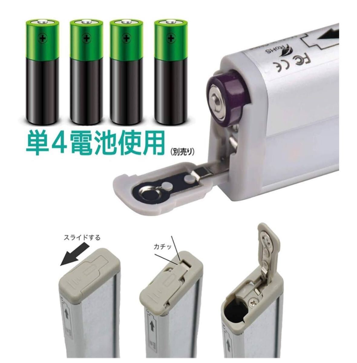 便利な電池式単四電池を4つ使用ですので、約100グラム(電池は除く)と軽量のため、場所を選ばずにコンセントの届かない室内の階段、物置、クローゼット、本棚、玄関、キッチン、倉庫、廊下、寝室、地下室、トイレ、車など多用途に使えます。