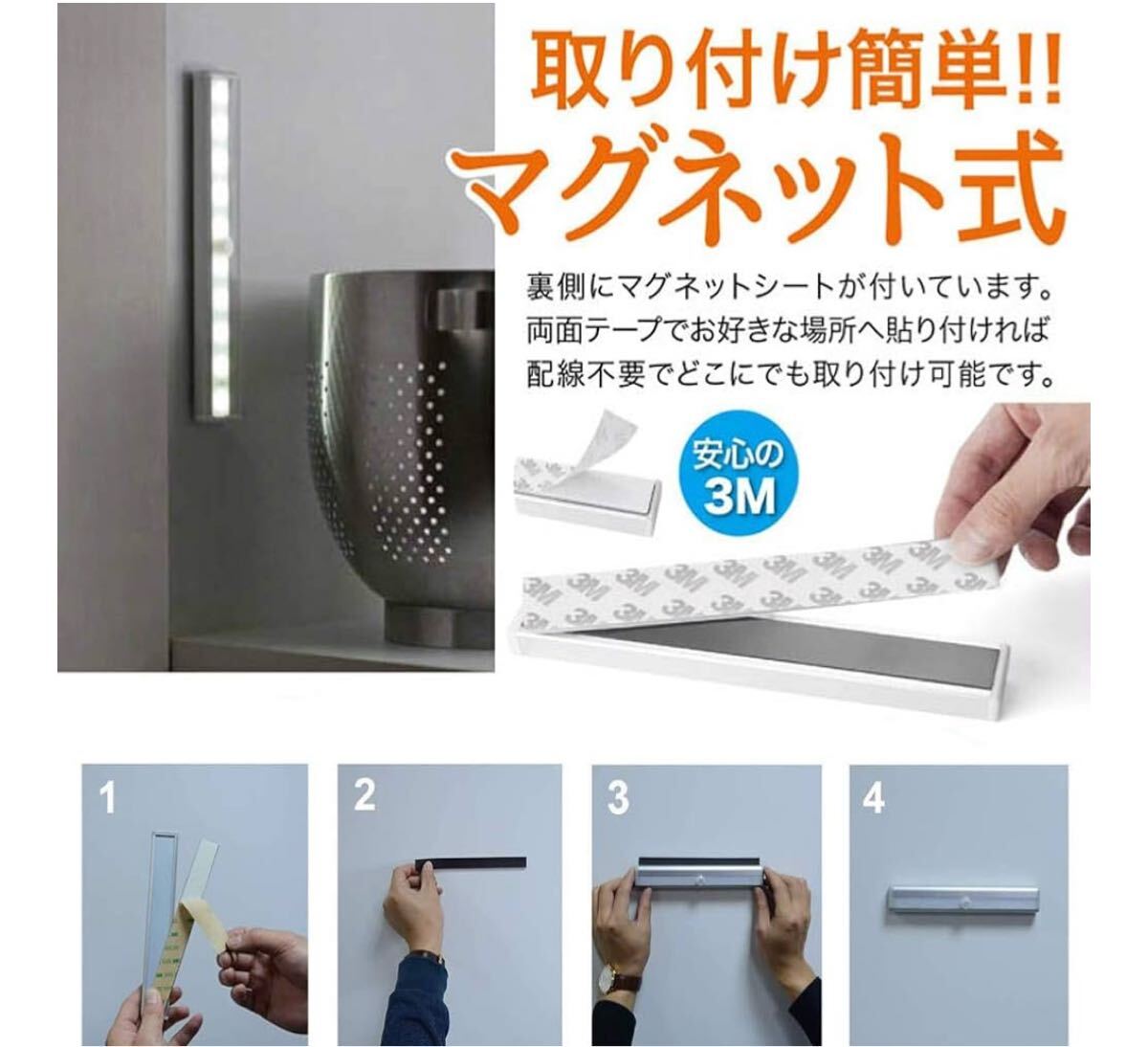 【工事不要で取り付け簡単】本体背面にマグネットと両面テープが装着されており、工具、ネジ、ナットは不要、壁に貼り付けるだけで簡単に設置が可能です。簡単に脱着ができるので、粘着テープを壁に取り付ければ、いつでも取り外して懐中電灯のように持って使うこともできます。