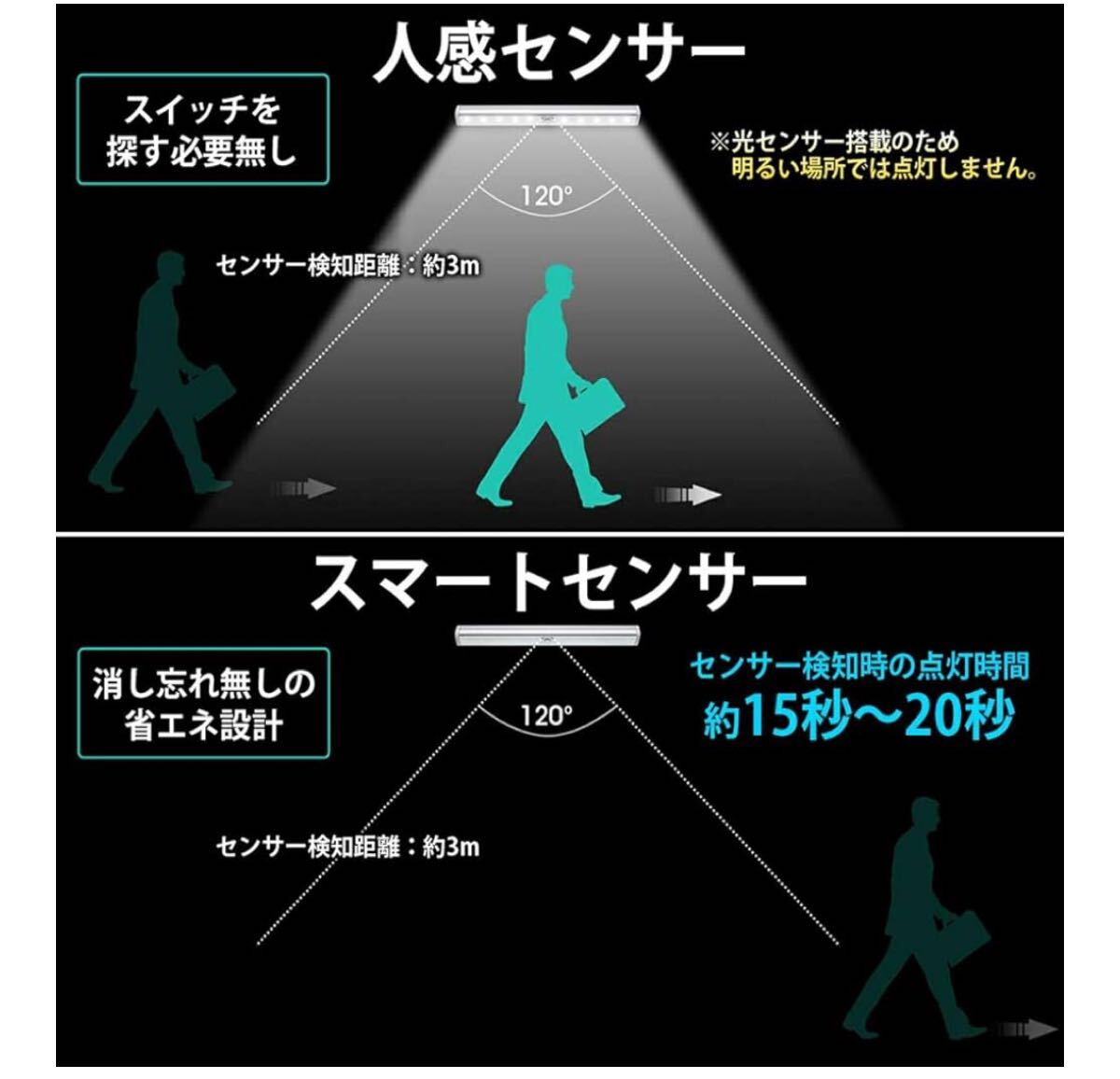 光・人感センサーを搭載:暗い場所だけで働く、人間が120度以内で最大3メートルの検出範囲内で夜間動作を検知するとすぐ点灯。感知範囲で離れなくて消灯しない。この範囲から離れて後15秒自動消灯。昼間或いは明るい場合に人体動きを感知しても点灯しない。