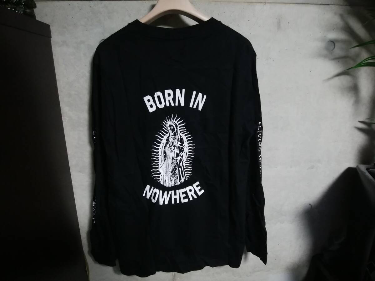 胸と背中にストリートライクなタッチでメッセージとマリアを、袖にシンプルな風合いでメッセージをプリント。