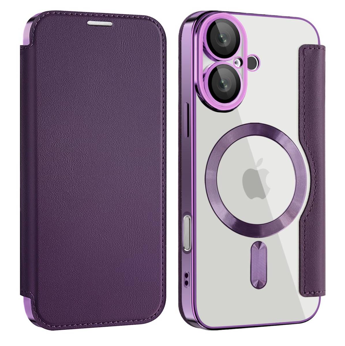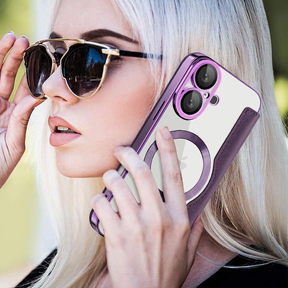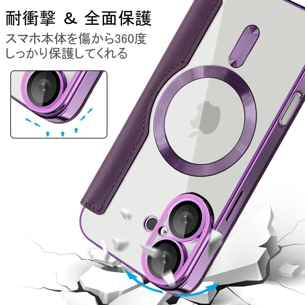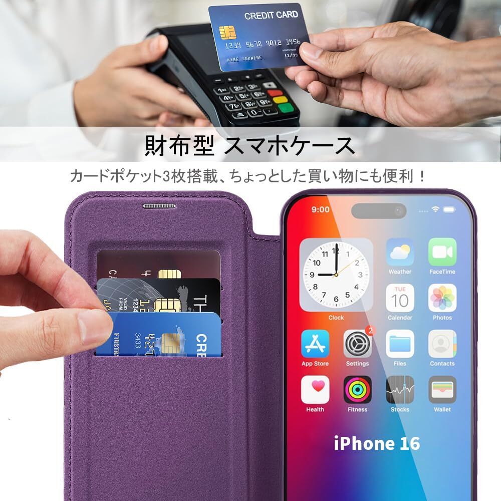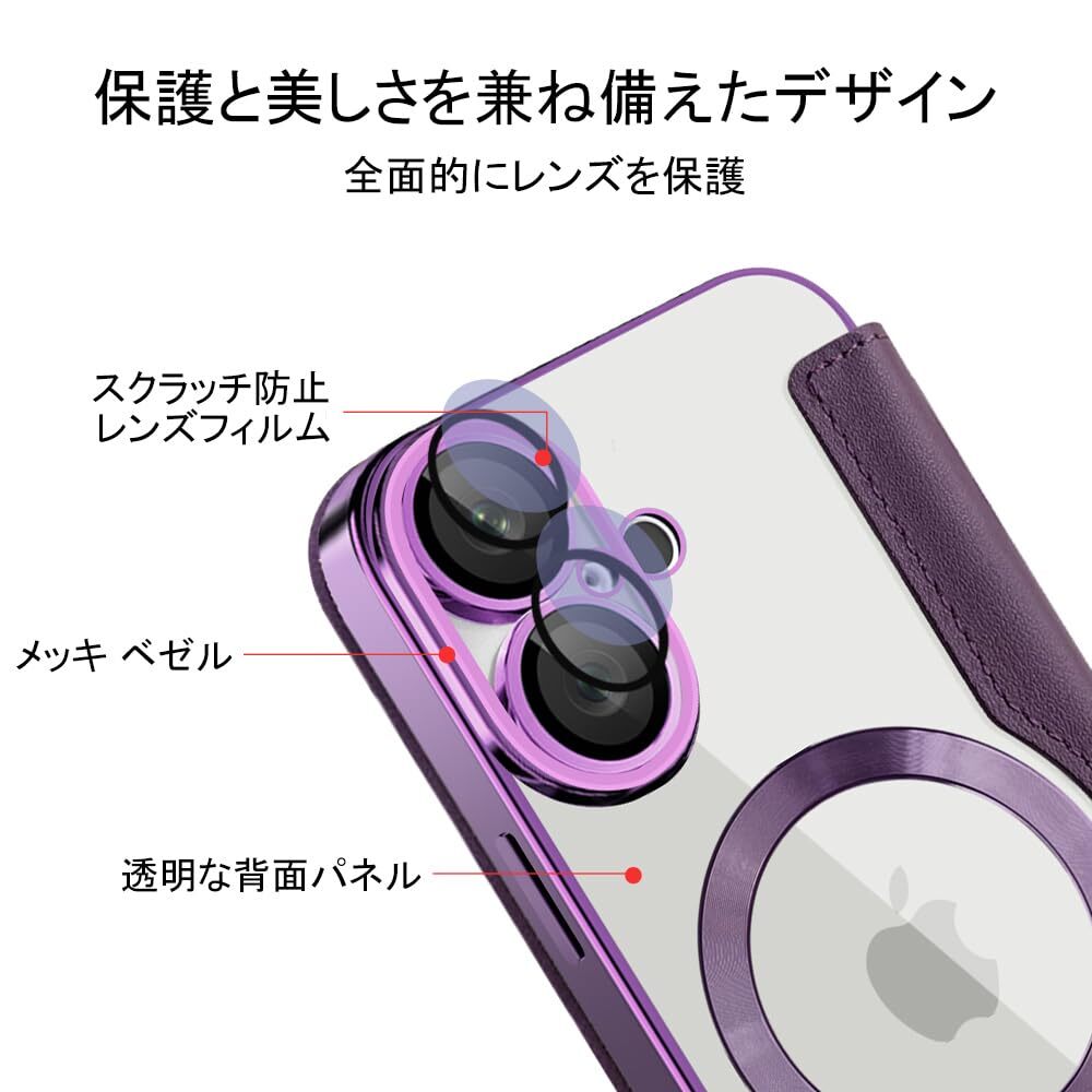 【REHOOF】iPhone 16 ケース 手帳型 magsafe対応 6.1インチ 背面 透明 クリア 財布型 アイフォン 16 ケース マグセーフ 手帳 ワイヤレス充電対応 カード入れ PU革 レザー スマホケース 軽量 薄型 防塵 耐衝撃 全面保護 スマホカバー(パープル)