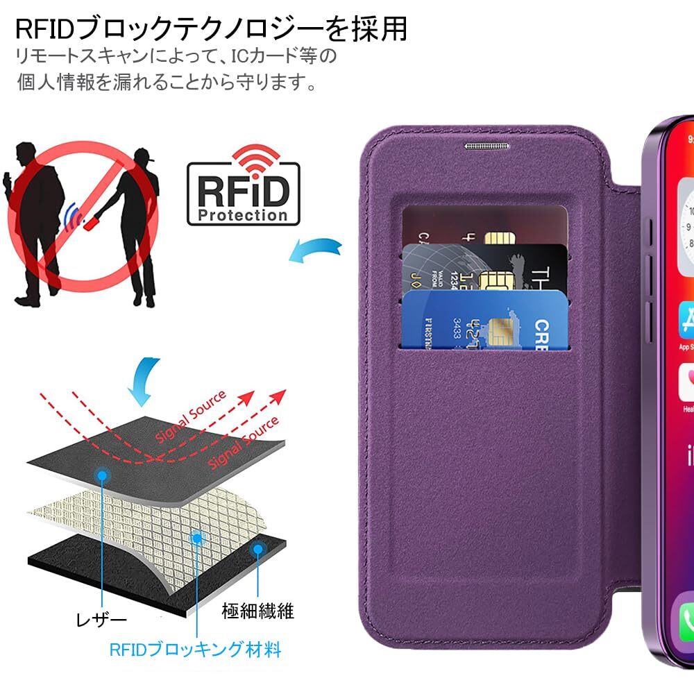 スマホカバー(パープル) 全面保護 耐衝撃 防塵 薄型 軽量 スマホケース レザー PU革 カード入れ ワイヤレス充電対応 手帳