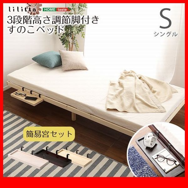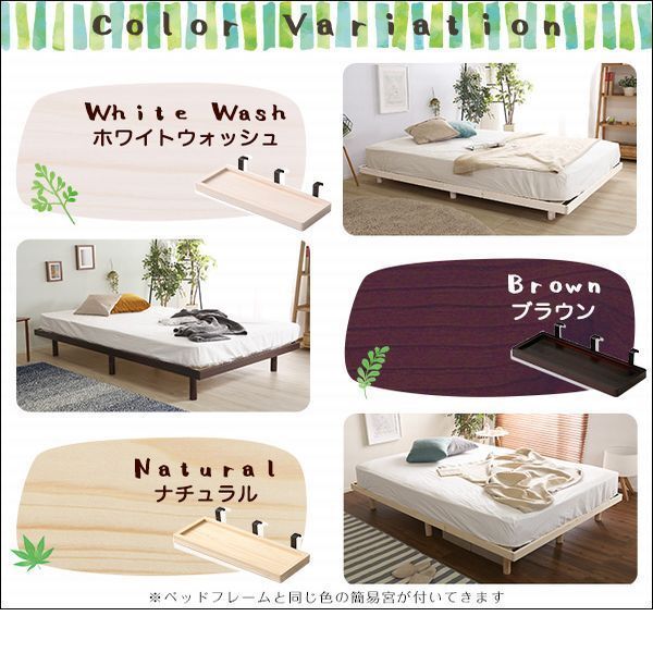 【ポイント】 3段階に高さを調節できる脚付きすのこベッド(シングル)と簡易宮のセットです。 北欧産パインフレームを使用した、通気性と耐久性に優れた頑丈設計。 ナチュラルは無垢材のやさしさ、爽やかなホワイトウォッシュ、シックなブラウンの3色。 簡易宮はベッドフレームに引っ掛けるだけの簡単取付。 スマホなどの小物を置くのに便利なサイズで好きな位置に取り付け可能です。 |