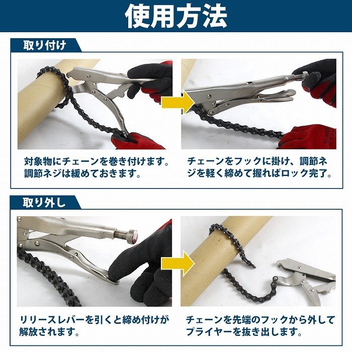 管にチェーンを巻くため、作業時に外れにくく、力をかけやすくなっているので、