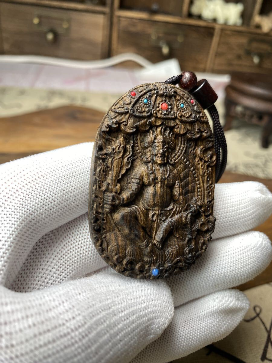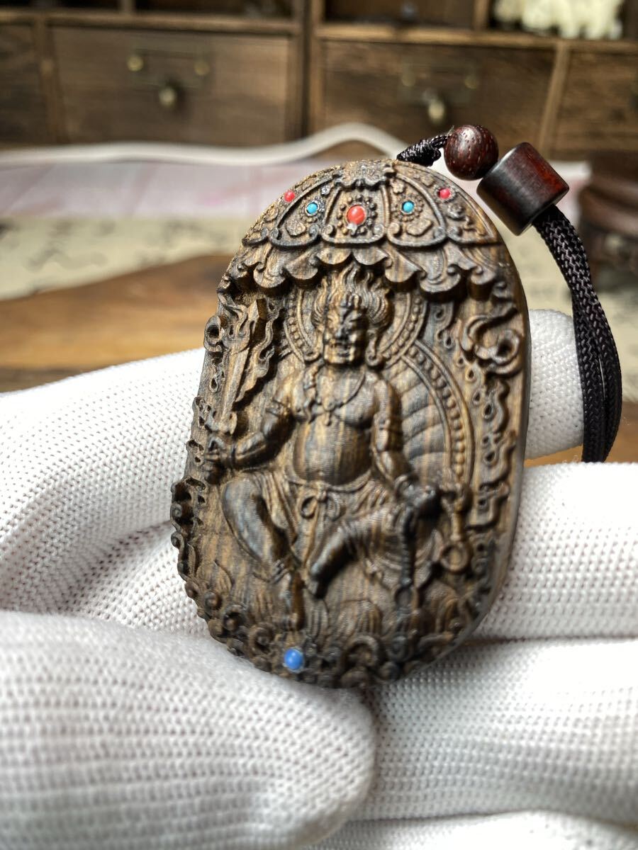 送料無料 古美術 不動明王 細密木彫 繊細彫刻 観世音菩薩 観音様 お守り 仏教美術 ご本尊 高さ6cm 根付 ストラップ ネックレス