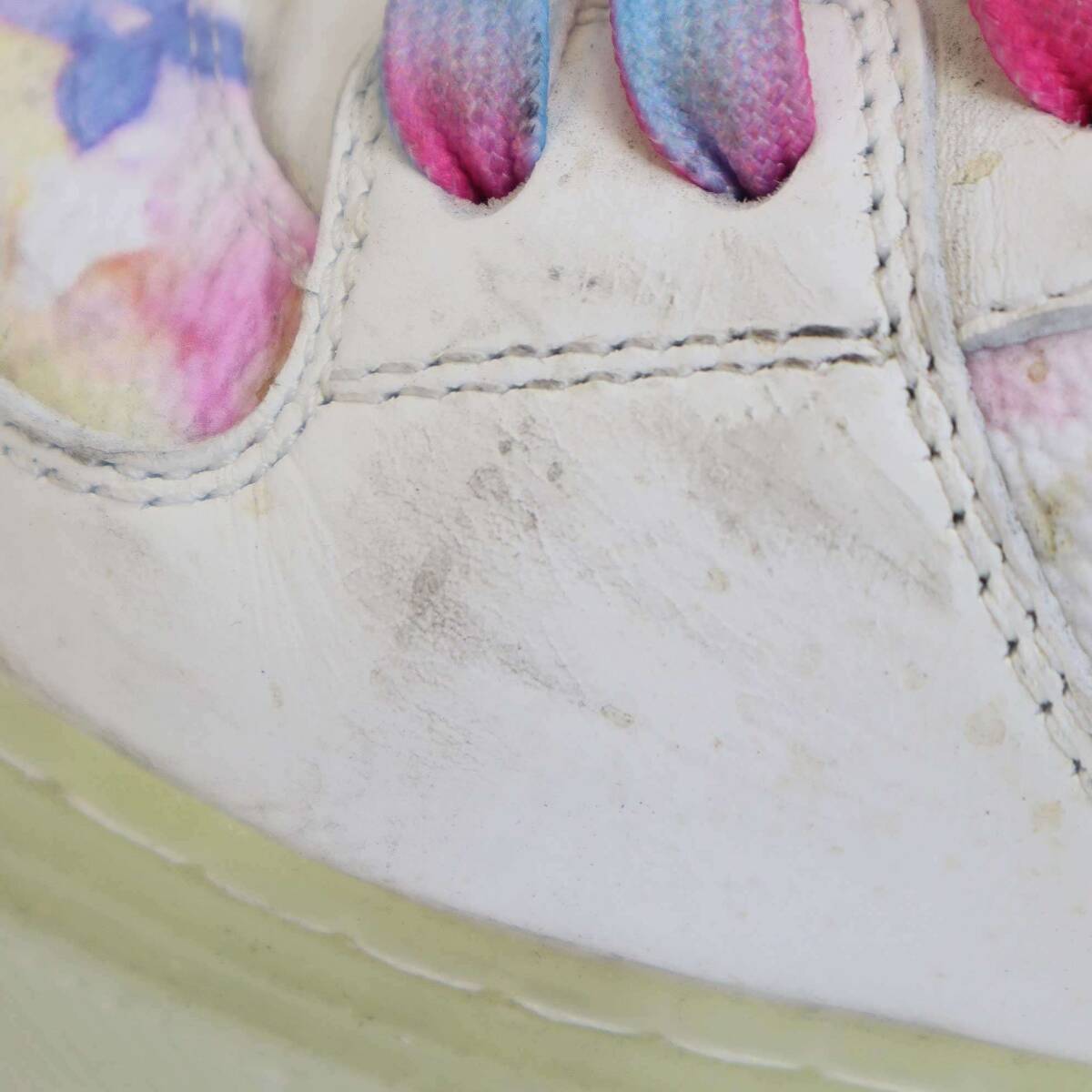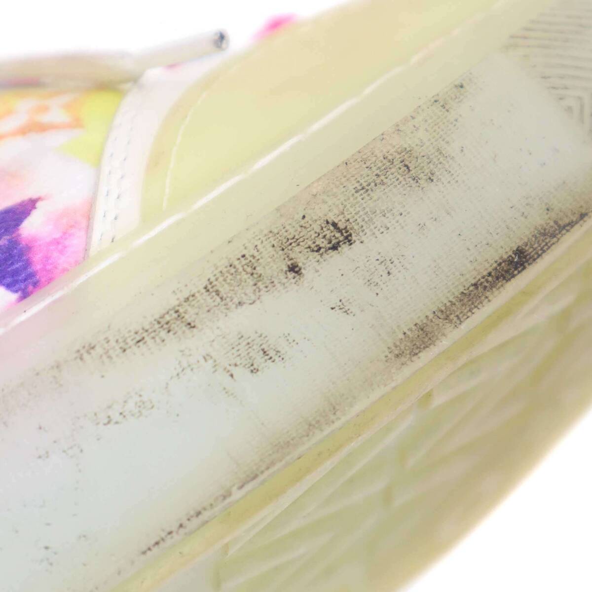 全体的に数箇所汚れ、アッパーに数箇所シミ汚れ、かかとにややすり減り、やや履きジワがございます。