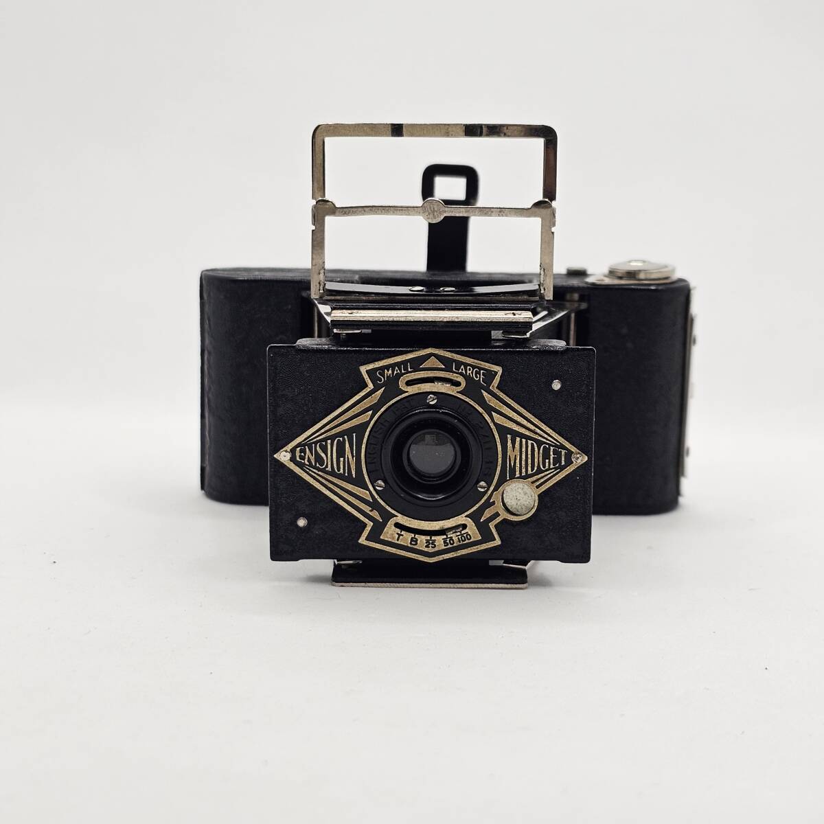 ENSIGN MIDGET エンサイン ミジェット A/D (全距離用) ポケットサイズ カメラ 【商品の説明】 製造年が**1934年から1941年**と特定できる、歴史的価値のあるアンティーク蛇腹カメラです。第二次世界大戦中に兵士JJEニコラスが実際に使用していたことがわかっており、単なるヴィンテージ品ではない特別なストーリーを持つ逸品です。 イギリスのホーントン・ブッチャー社が製造していた希少なモデルで、美しいプレス鋼板製の黒色仕上げ、クロームメッキの真鍮製金具が特徴的です。 コンパクトに折りたためる蛇腹式で、レトロな雰囲気が漂います。 主な特徴: ・背面は取り外し可能で、スライド式のメッキキャッチで固定。 ・折りたたみ式の蛇腹と、クロームメッキの真鍮製フレームに取り付けられた前面プレート。 ・上部には折りたたみ式2ピースビューフレーマーを搭載。 ・レンズ直径は8mm、最小シャッタースピードは1/100秒。 ・「ENSIGN MIDGET」と書かれた装飾的なブランド名プレート。 写真にあるように、オリジナルのフィルムラベルも残っており、歴史的な背景を持つコレクターズアイテムとして価値が高い逸品です。 【商品の状態】 ヴィンテージ品のため、経年による劣化や使用感があります。 ・外観:革部分にスレ、金属部分にくすみ、サビあり。 ・機能:動作確認は行っておりません。ジャンク品としてお考えください。 ・付属品:写真に写っているものが全てです。 ※詳細は写真をご確認ください。 【サイズ】 縦:約6.5cm 横:約8.5cm マチ:約2.5cm(折りたたみ時) ※素人採寸のため、多少の誤差はご容赦ください。 【その他】 ・ご不明な点がございましたら、お気軽にコメントください。 ・動作未確認のため、現状渡しとなります。 ・レトロ、アンティーク、ヴィンテージ商品にご理解のある方のみご購入ください。