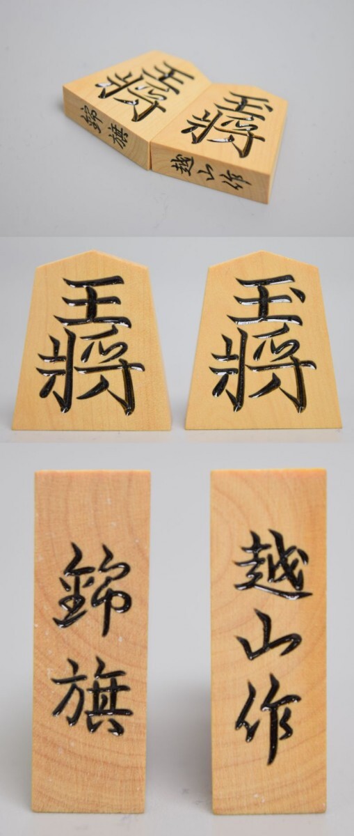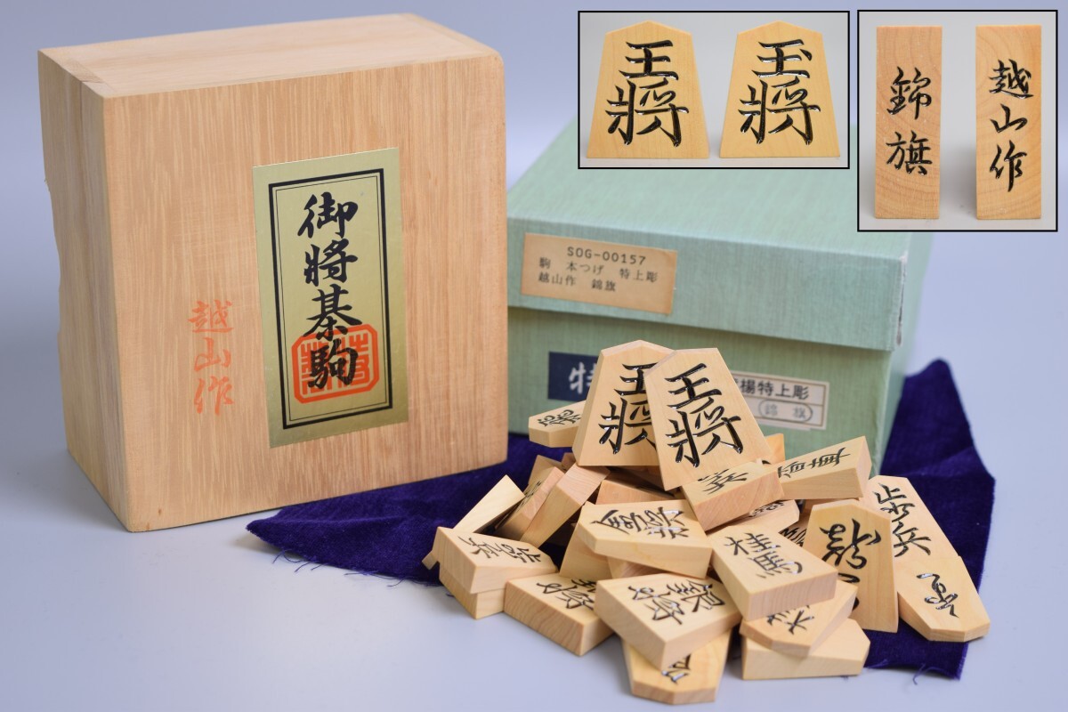 将棋駒 御将棋駒 越山作 本黄楊 特上彫 錦旗 黄楊 彫駒 彫り駒 黒彫 彫刻 桐箱 木製 木工品 在銘 計41駒 駒箱 将棋 駒 コマ RR-59K/510